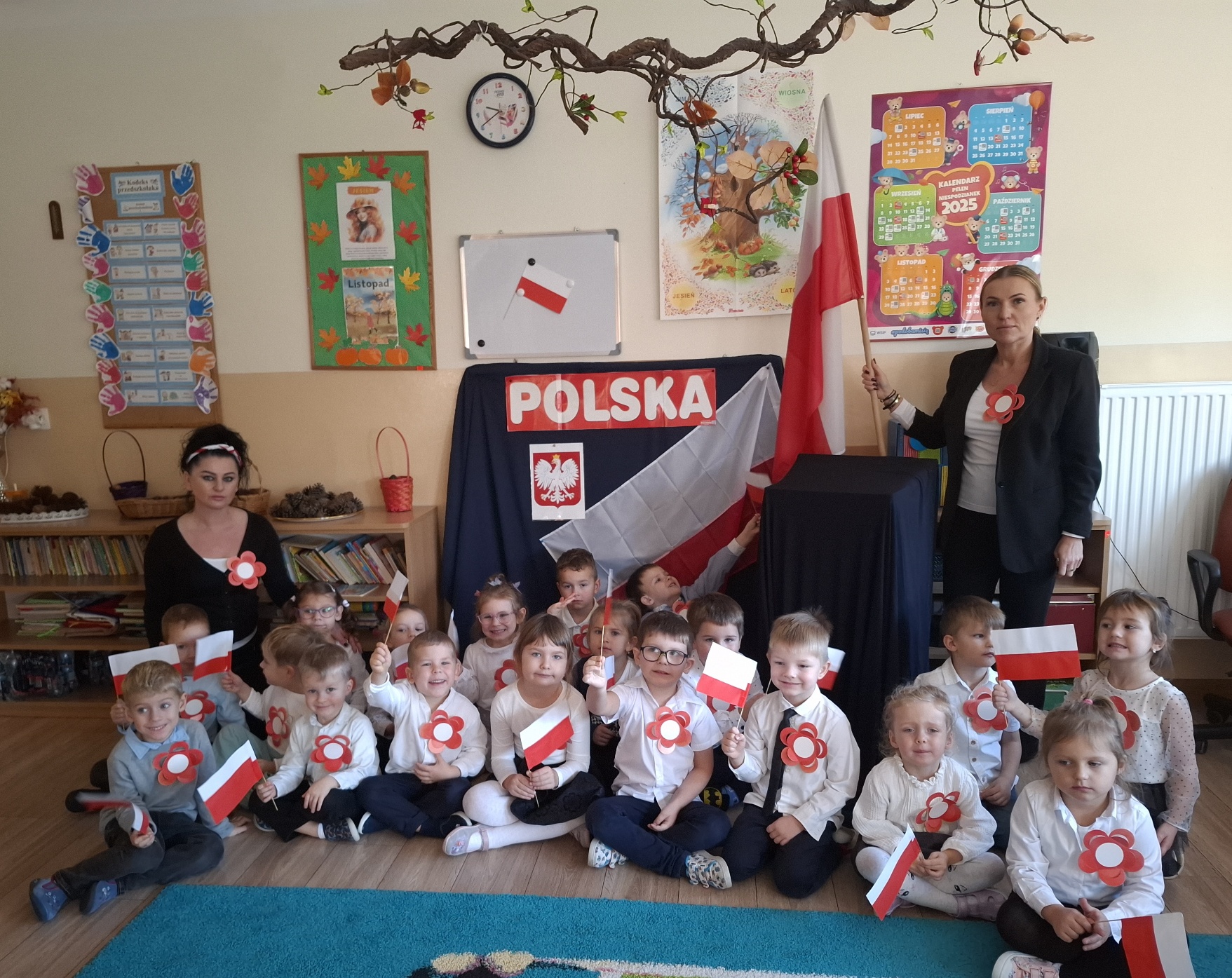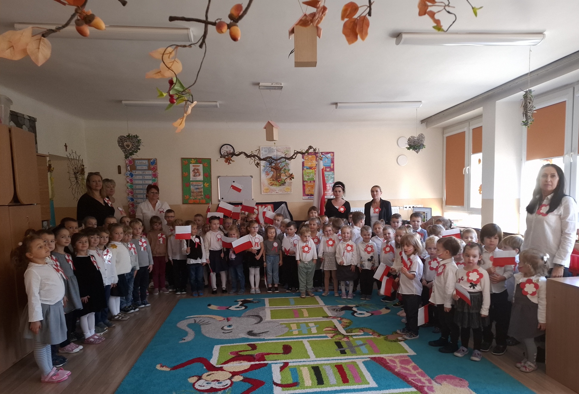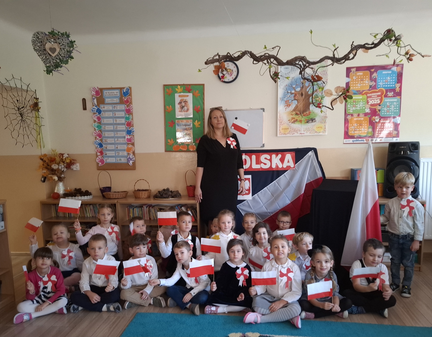 Dzieci z grup Krzysie, Króliczki, Kangurki i Kubusie z dumą obchodziły Narodowe Święto Niepodległości. Ubrane na galowo, z biało-czerwonymi akcentami, wspólnie odśpiewały hymn narodowy „Mazurek Dąbrowskiego”. Przedszkolaki wzięły udział w uroczystym apelu, podczas którego z powagą i zaangażowaniem uczciły pamięć o tych, którzy walczyli o wolną Polskę.