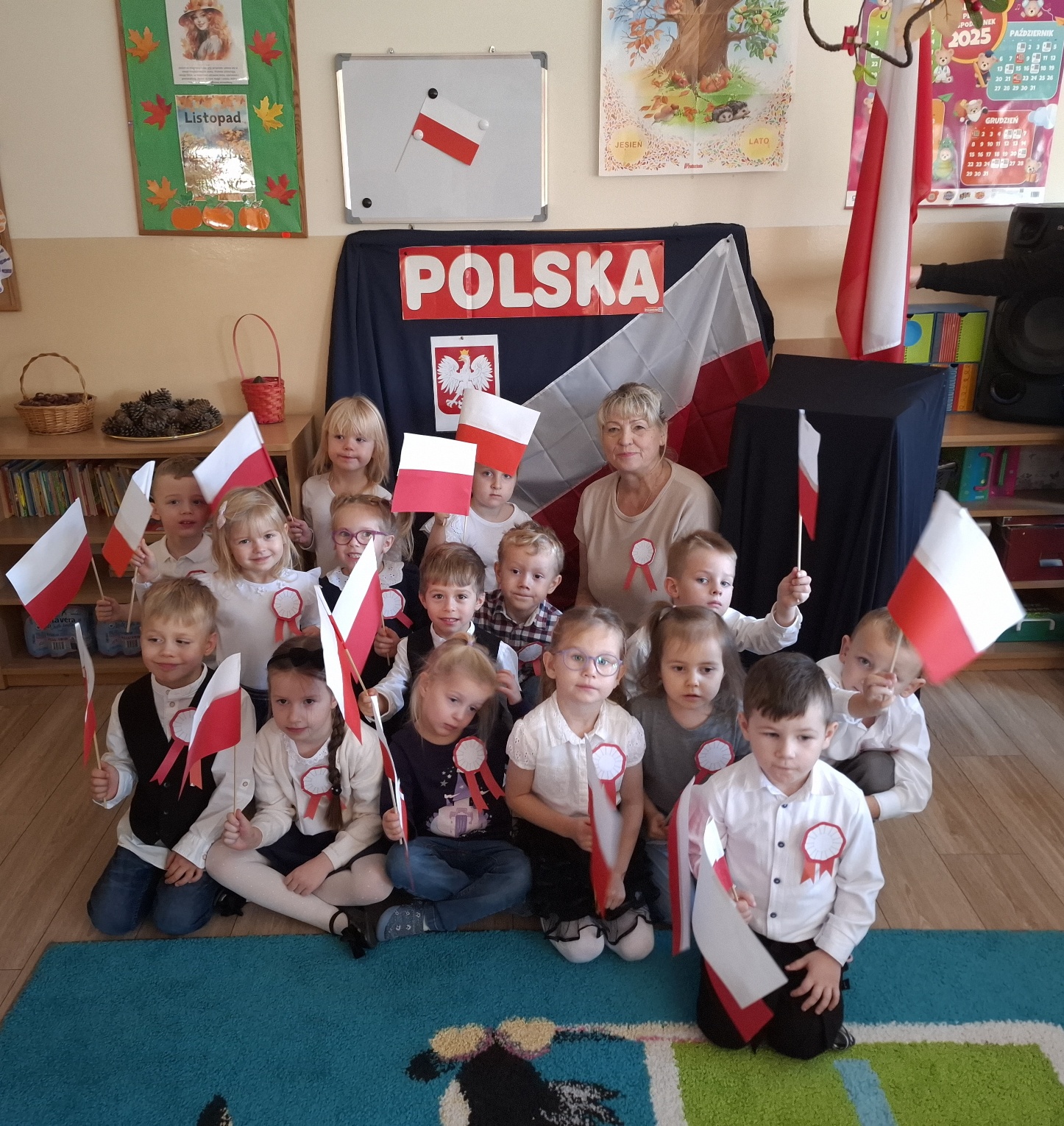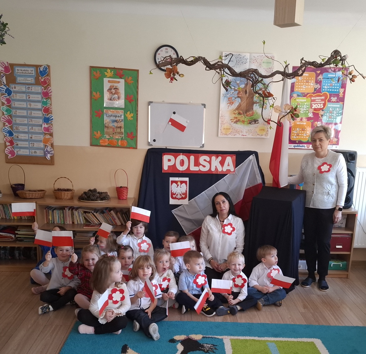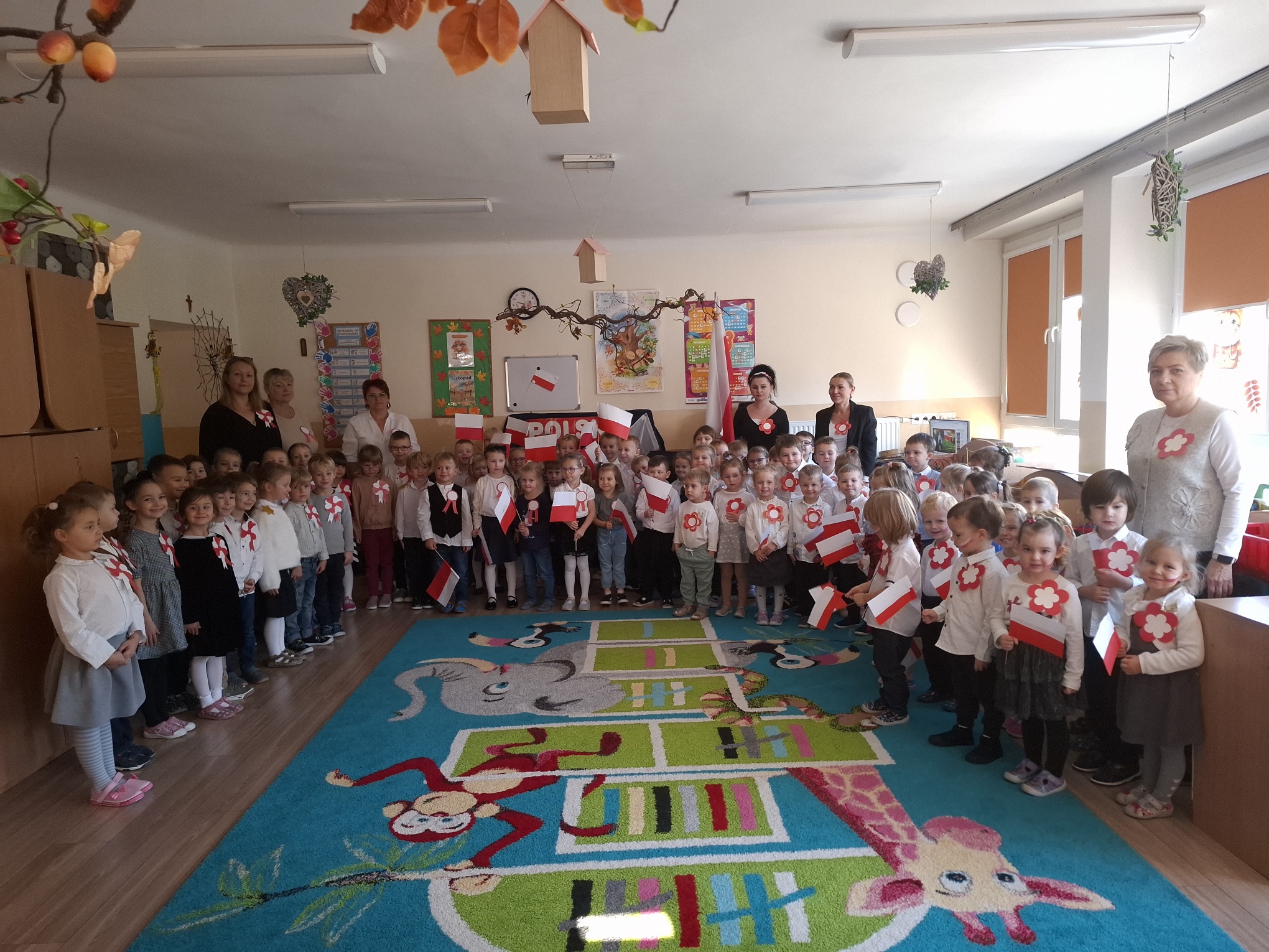 Dzieci z grup Krzysie, Króliczki, Kangurki i Kubusie z dumą obchodziły Narodowe Święto Niepodległości. Ubrane na galowo, z biało-czerwonymi akcentami, wspólnie odśpiewały hymn narodowy „Mazurek Dąbrowskiego”. Przedszkolaki wzięły udział w uroczystym apelu, podczas którego z powagą i zaangażowaniem uczciły pamięć o tych, którzy walczyli o wolną Polskę.