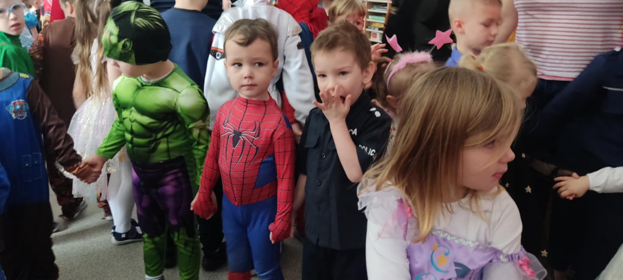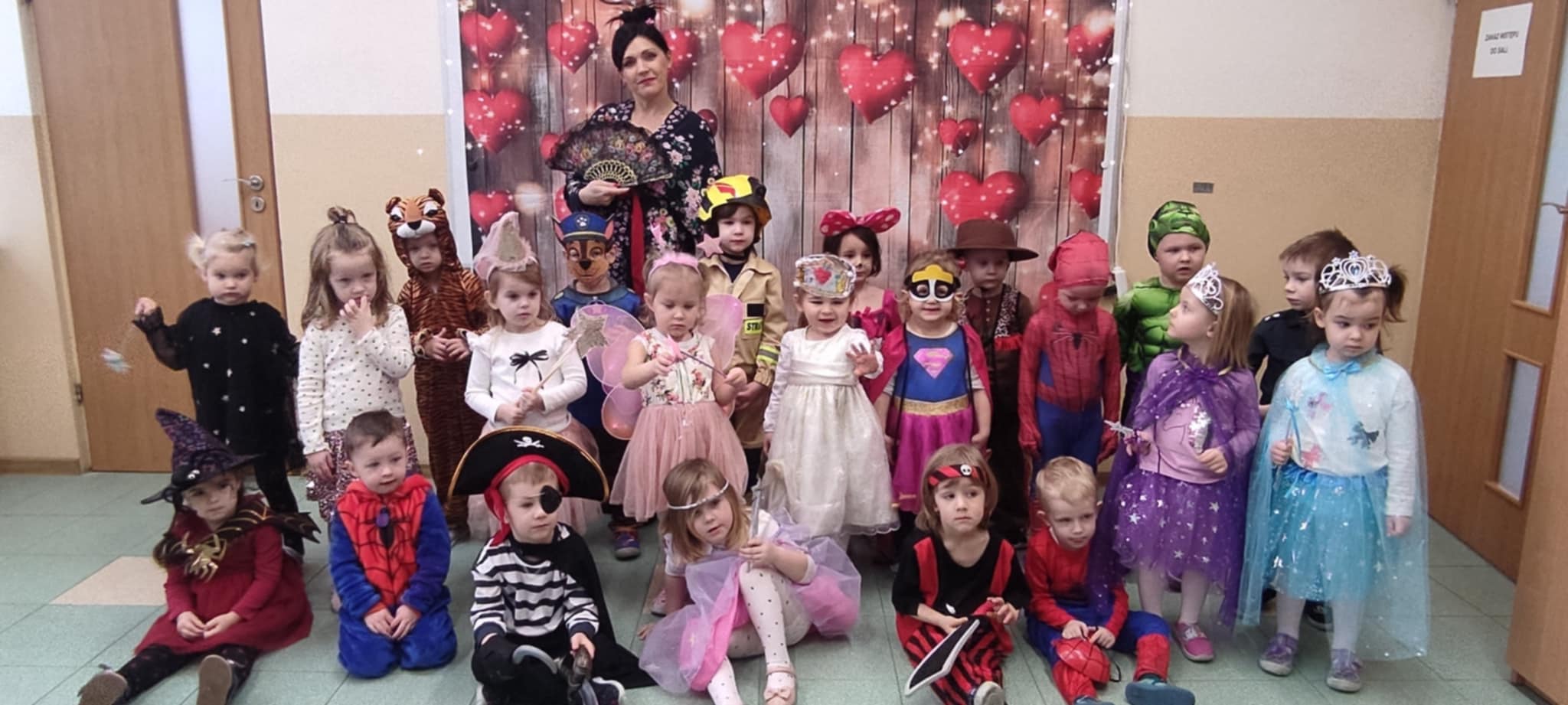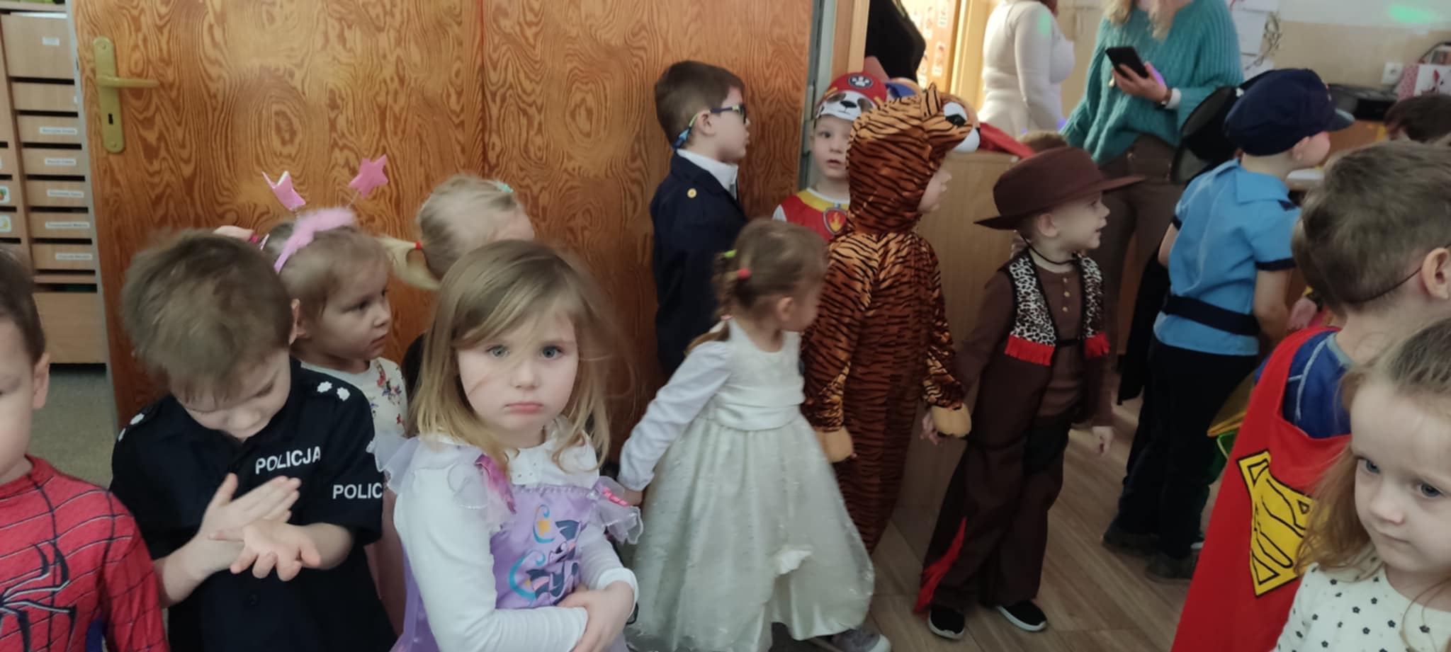 Przedszkolaki przyszły przebrane w piękne i pomysłowe stroje. Wśród nich można było spotkać księżniczki, superbohaterów, zwierzątka, policjantów, strażaków oraz wiele innych bajkowych postaci. Każde dziecko miało okazję zaprezentować swój strój podczas wspólnego pokazu, który wzbudził wiele uśmiechów i oklasków.