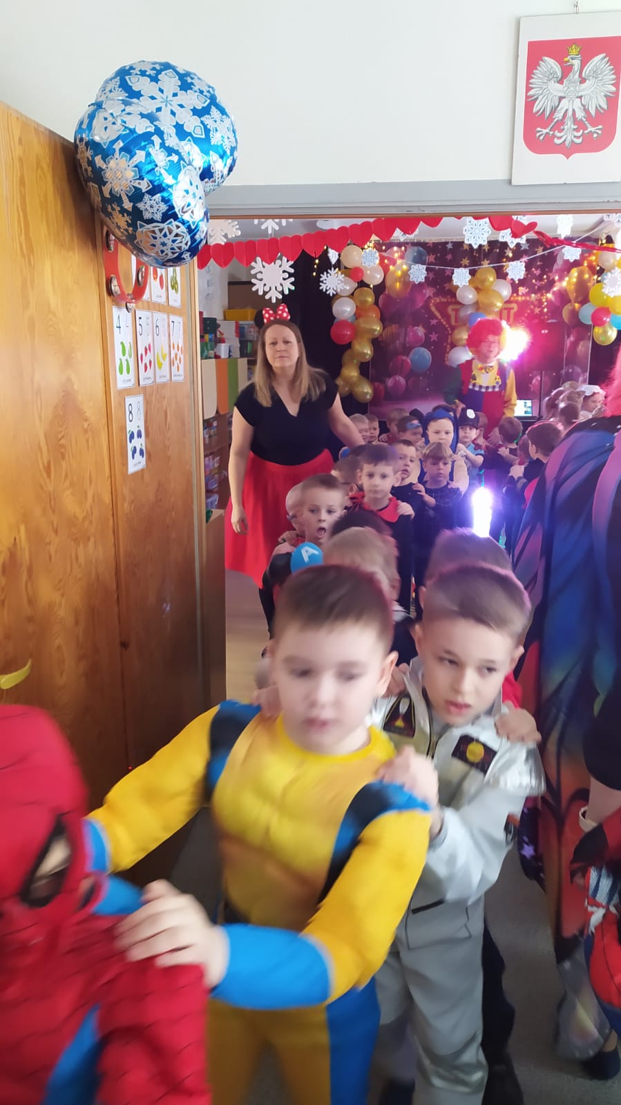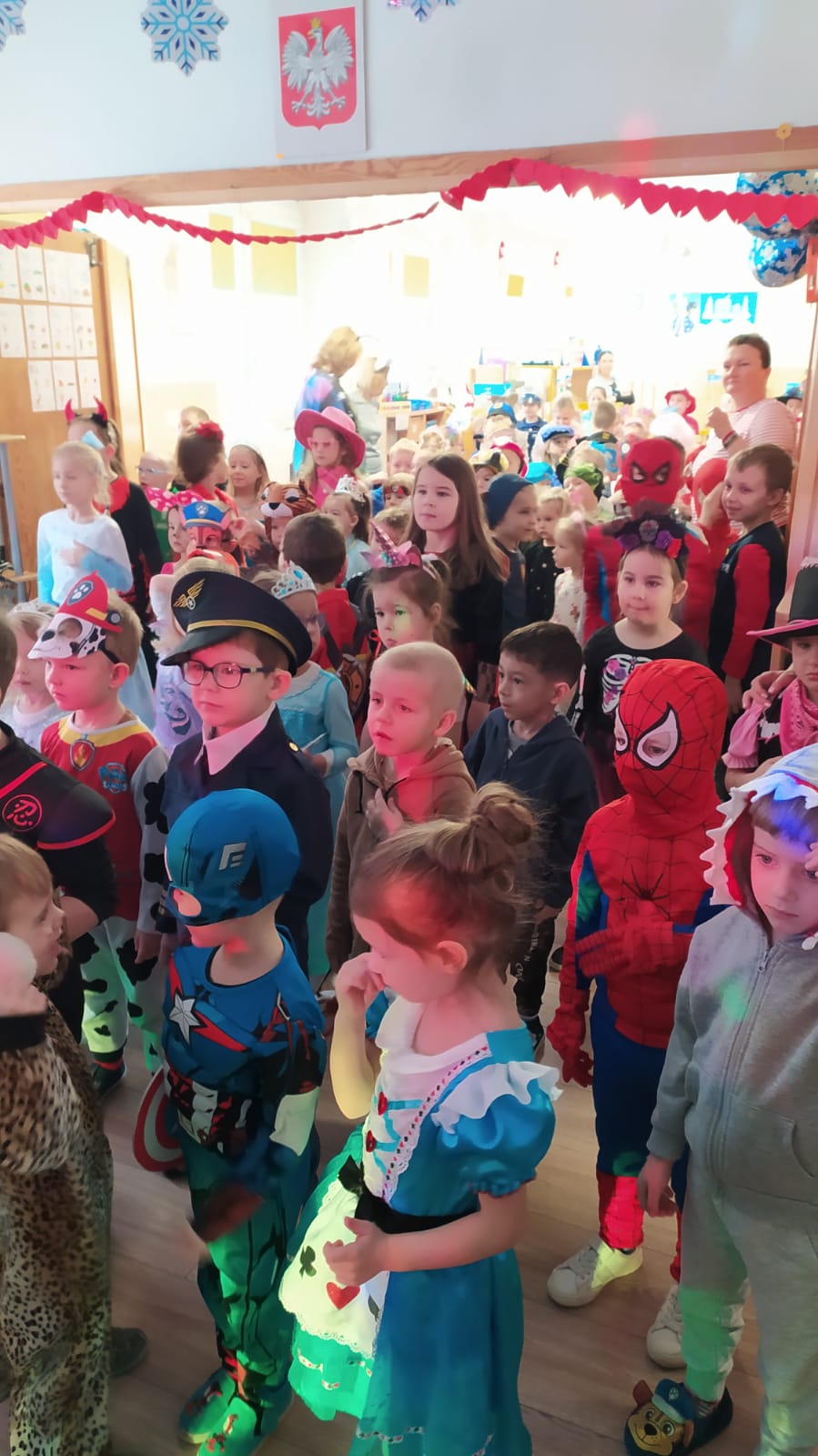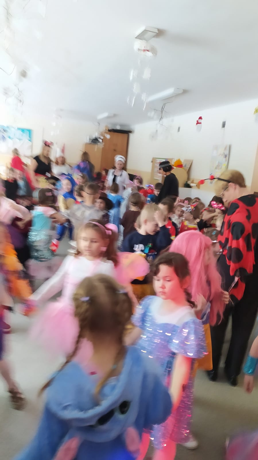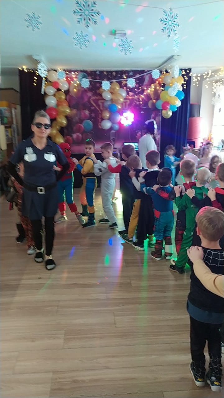 W naszym przedszkolu odbył się wyjątkowy Bal Karnawałowy, na który dzieci czekały z ogromną niecierpliwością. Już od samego rana w salach panowała radosna atmosfera, a kolorowe dekoracje, balony i serpentyny wprowadzały wszystkich w prawdziwie karnawałowy nastrój. Przedszkolaki przyszły przebrane w piękne i pomysłowe stroje. Wśród nich można było spotkać księżniczki, superbohaterów, zwierzątka, policjantów, strażaków oraz wiele innych bajkowych postaci. Każde dziecko miało okazję zaprezentować swój strój podczas wspólnego pokazu, który wzbudził wiele uśmiechów i oklasków.