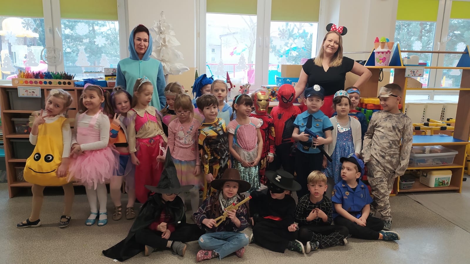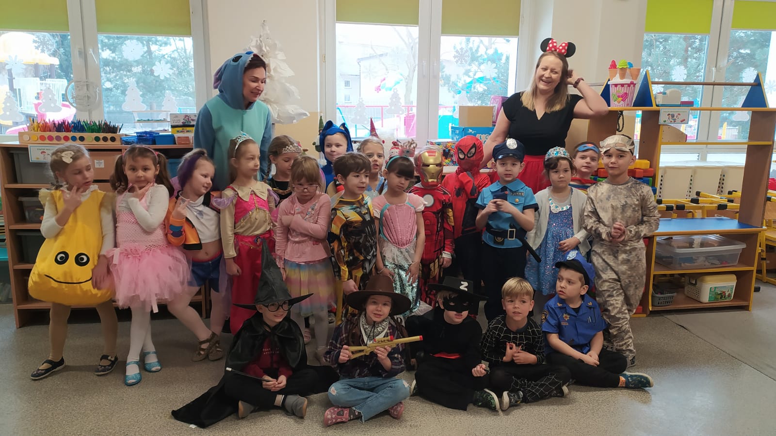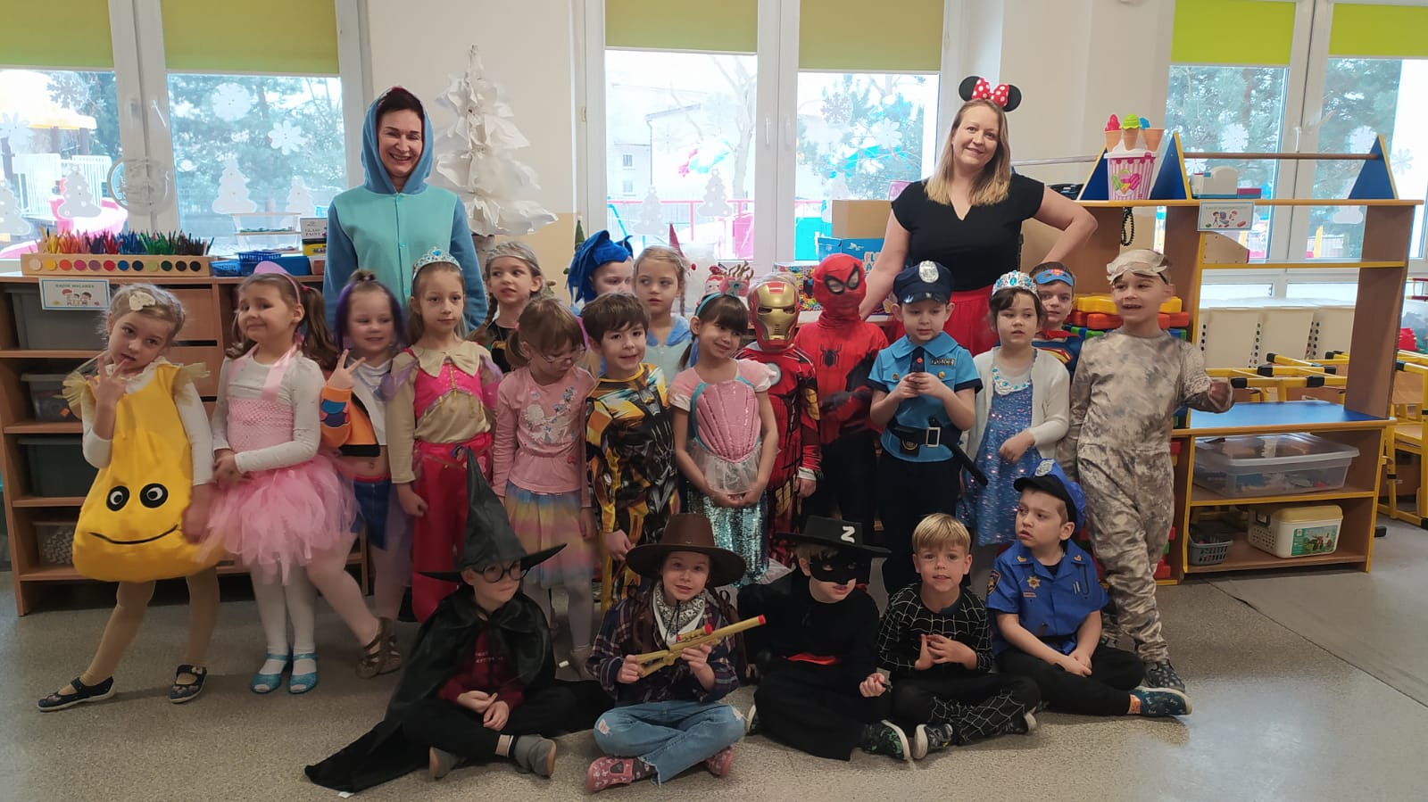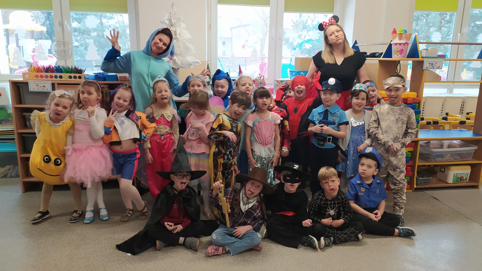 W naszym przedszkolu odbył się wyjątkowy Bal Karnawałowy, na który dzieci czekały z ogromną niecierpliwością. Już od samego rana w salach panowała radosna atmosfera, a kolorowe dekoracje, balony i serpentyny wprowadzały wszystkich w prawdziwie karnawałowy nastrój. Przedszkolaki przyszły przebrane w piękne i pomysłowe stroje. Wśród nich można było spotkać księżniczki, superbohaterów, zwierzątka, policjantów, strażaków oraz wiele innych bajkowych postaci. Każde dziecko miało okazję zaprezentować swój strój podczas wspólnego pokazu, który wzbudził wiele uśmiechów i oklasków.