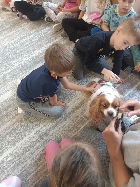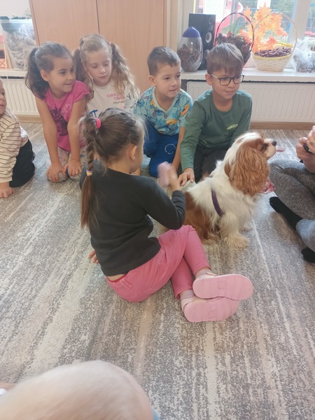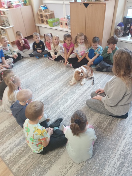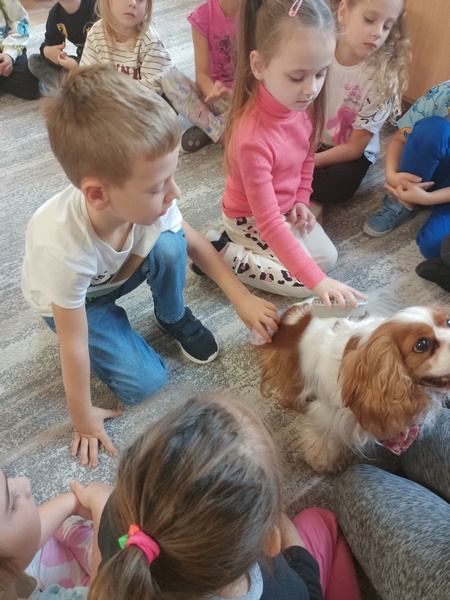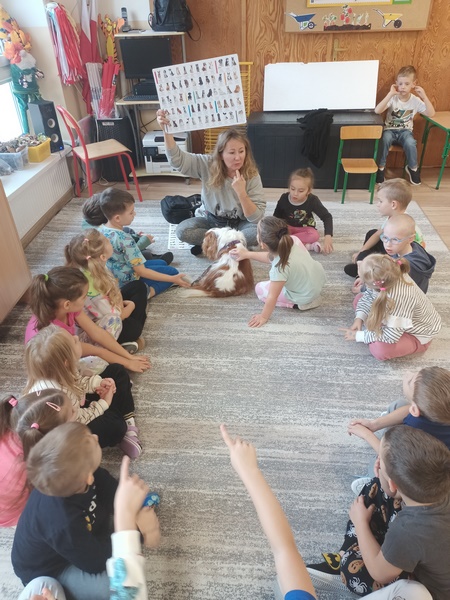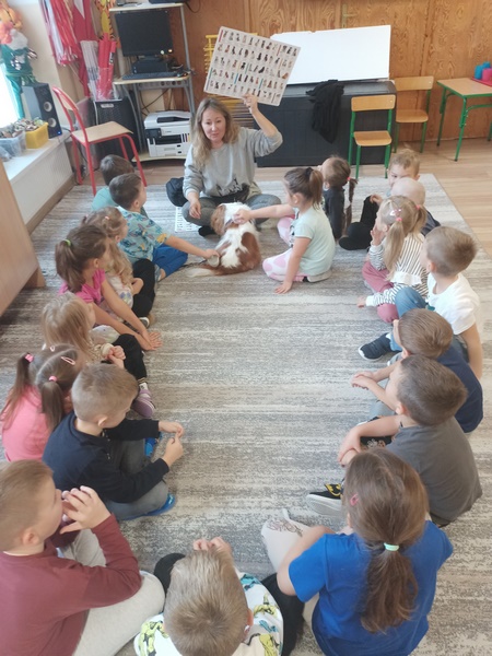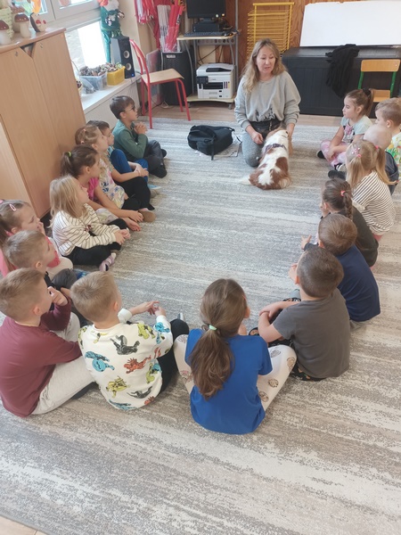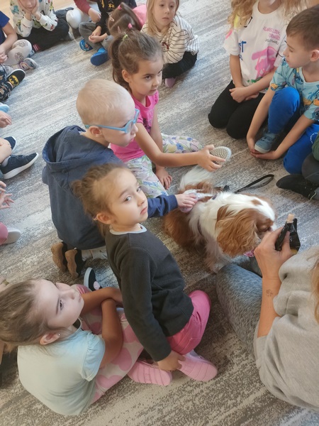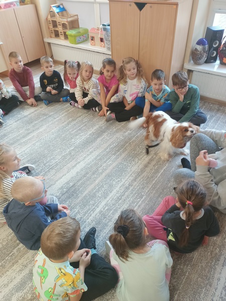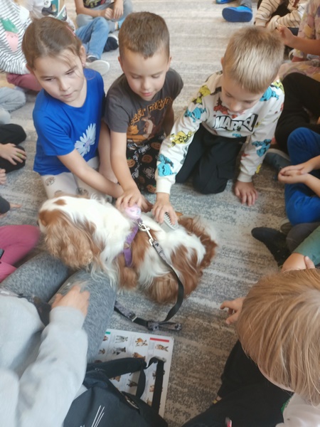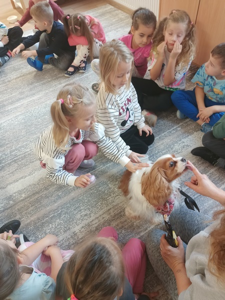 15 października dzieci wzięły udział w zajęciach edukacyjnych z dogoterapii .Zajęcia poprowadziła dogoterapeutką i behawiorystka, pani Joanna Pągowska. Dzieci miały okazje poszerzyć swoja wiedzę dotycząca psów i sposobów opieki nad mini oraz poobcować z przesympatyczną Bellą.