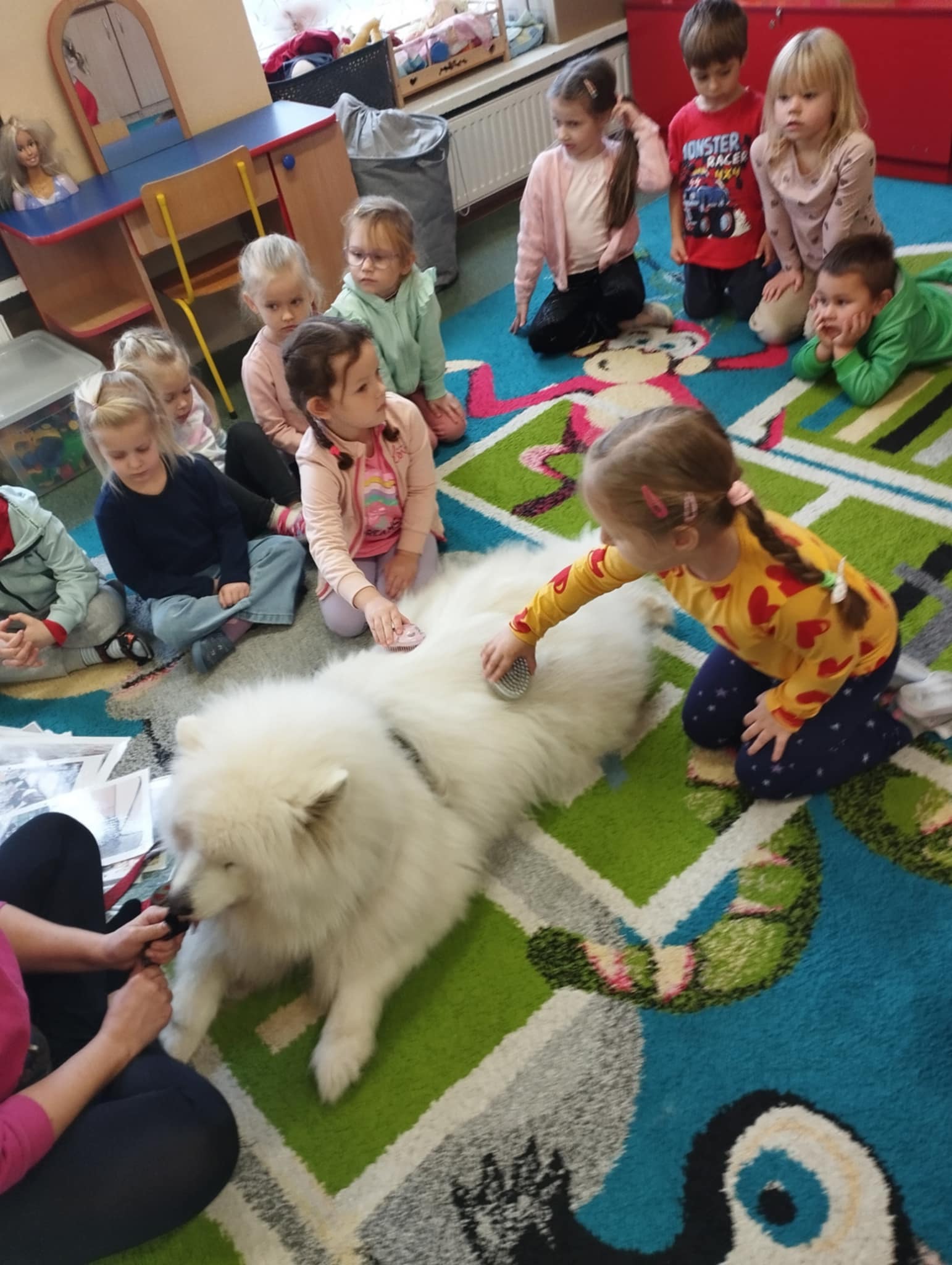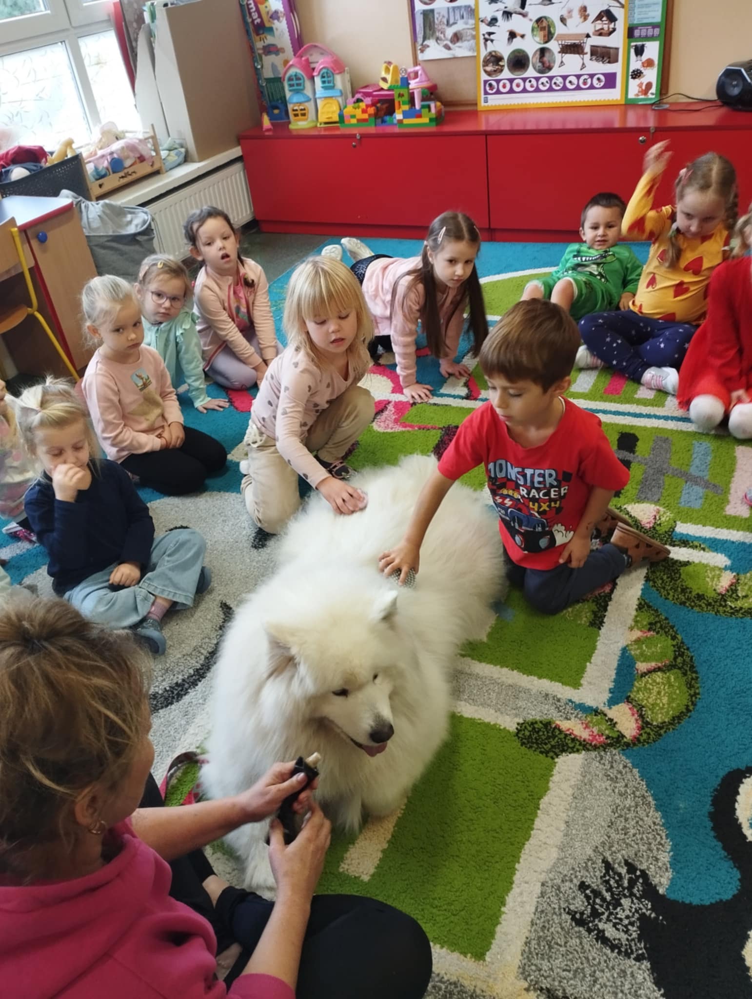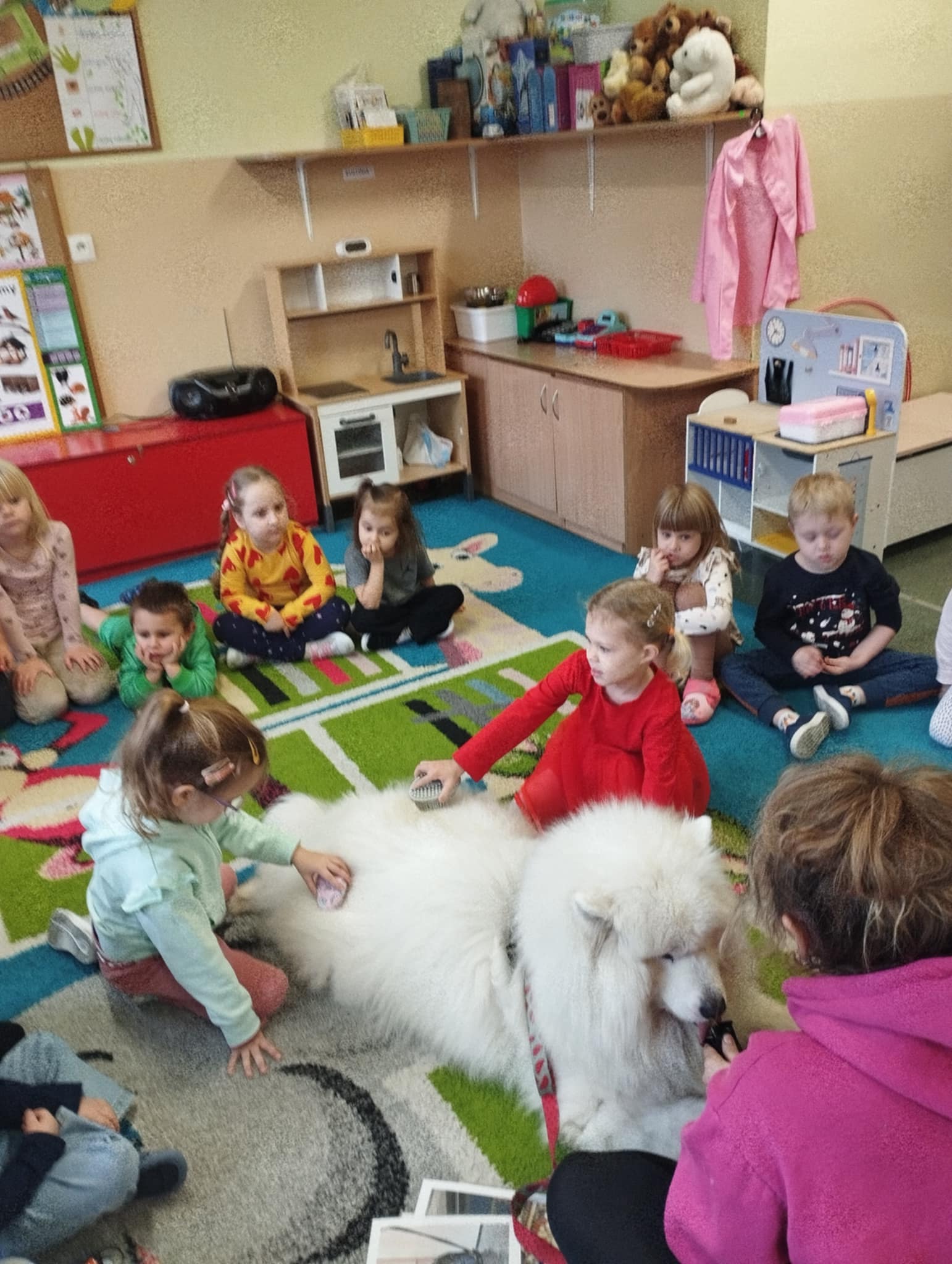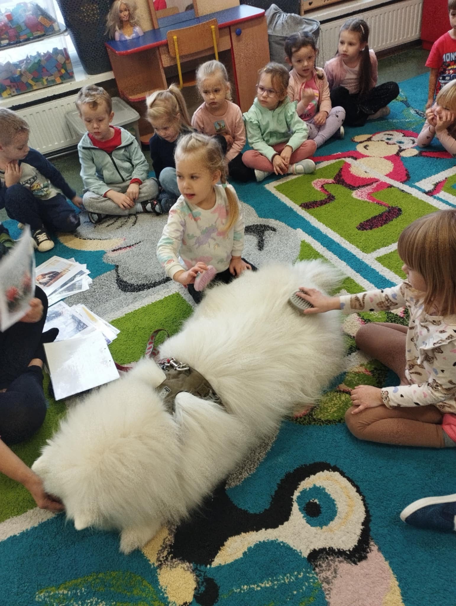 „Podczas dzisiejszej dogoterapii w przedszkolu gościliśmy cudownego samojeda. Dzieci z ogromną delikatnością czesały jego miękką sierść, głaskały go i cieszyły się jego spokojnym towarzystwem.