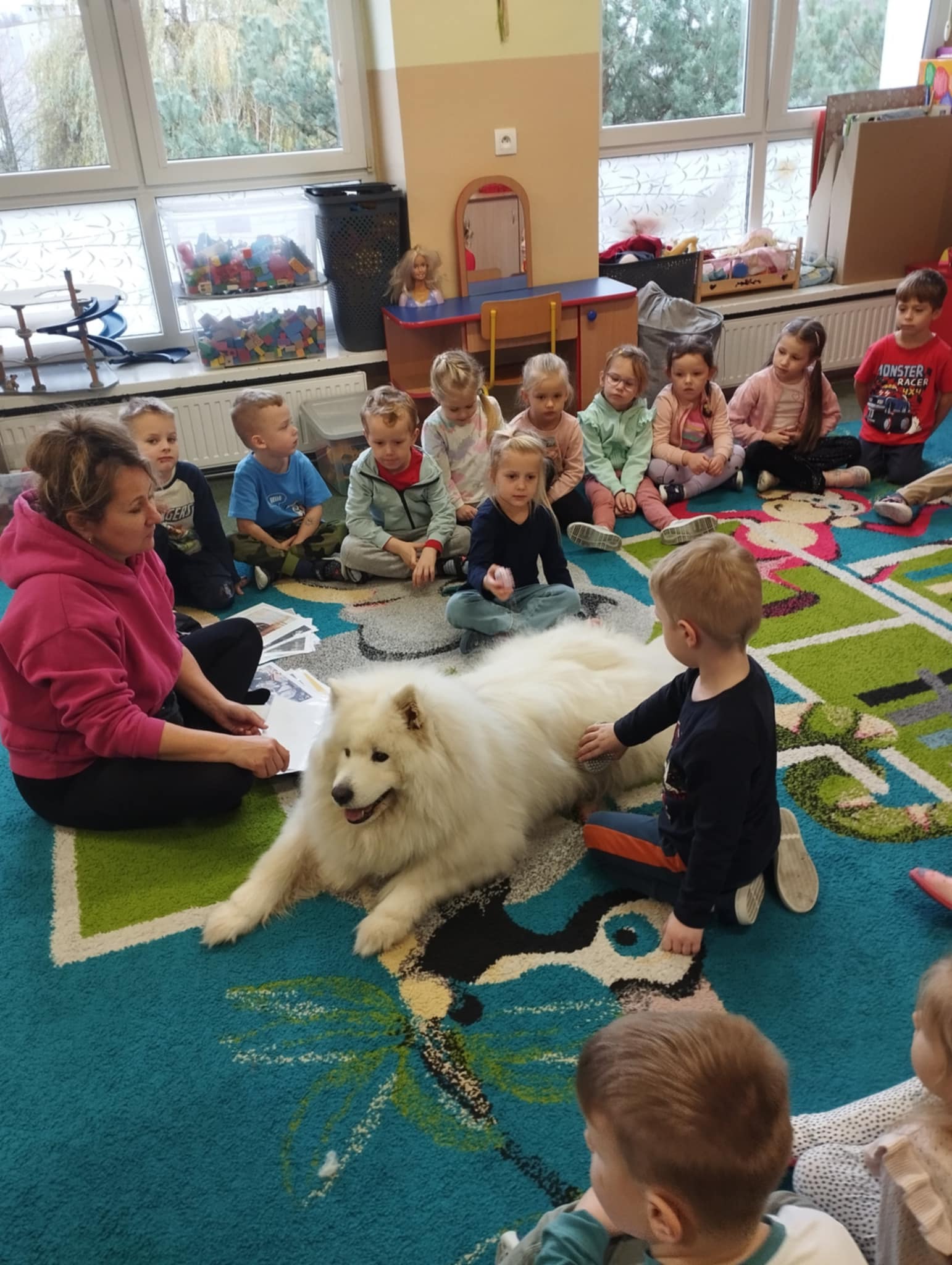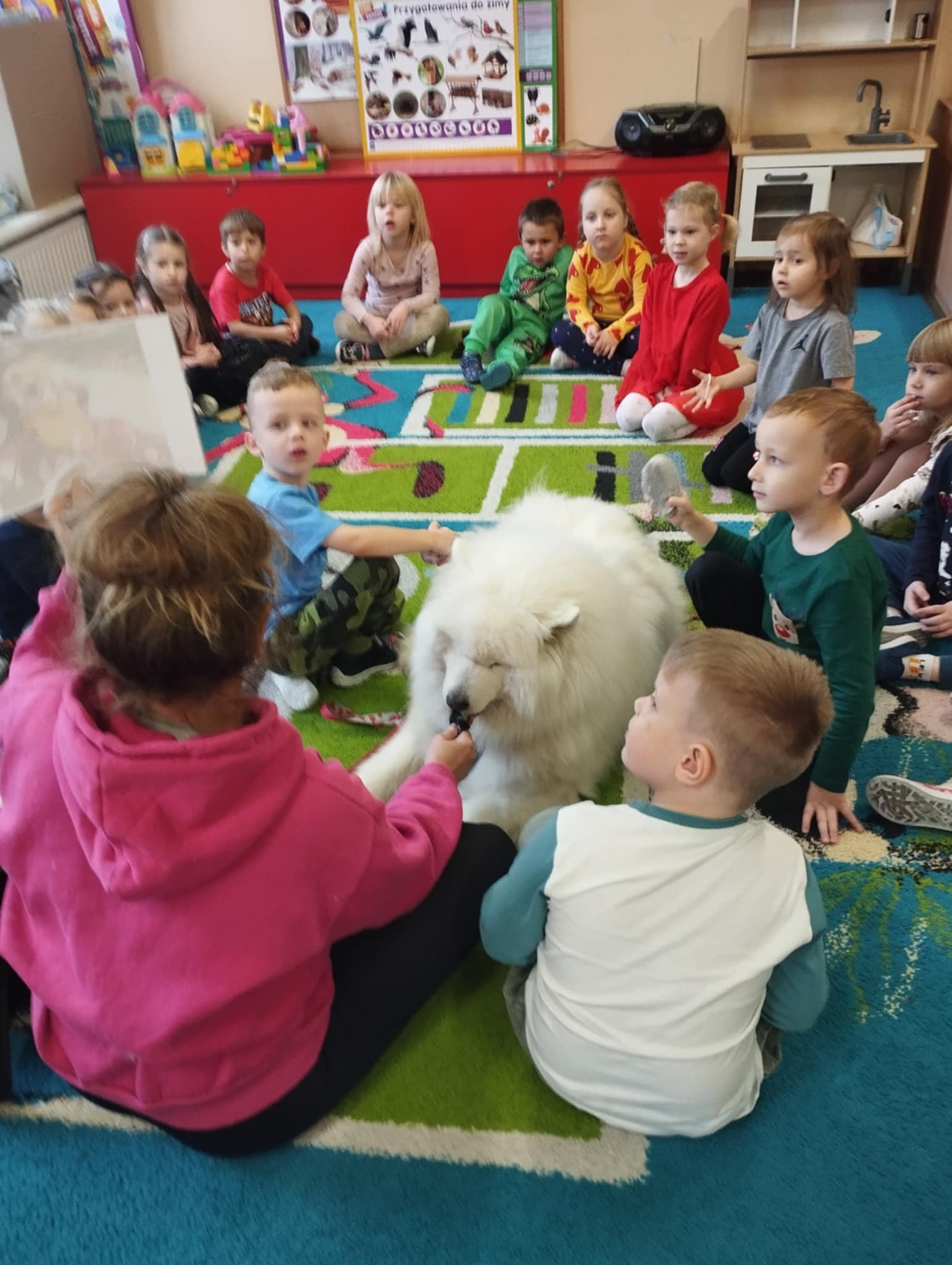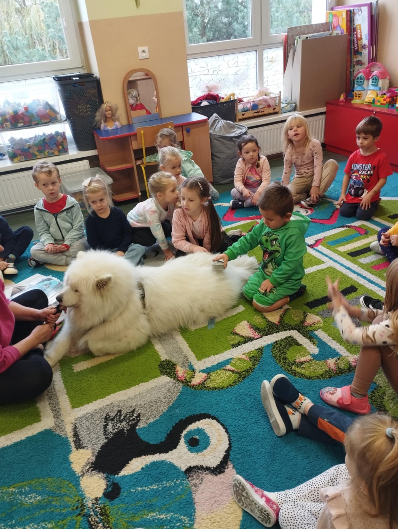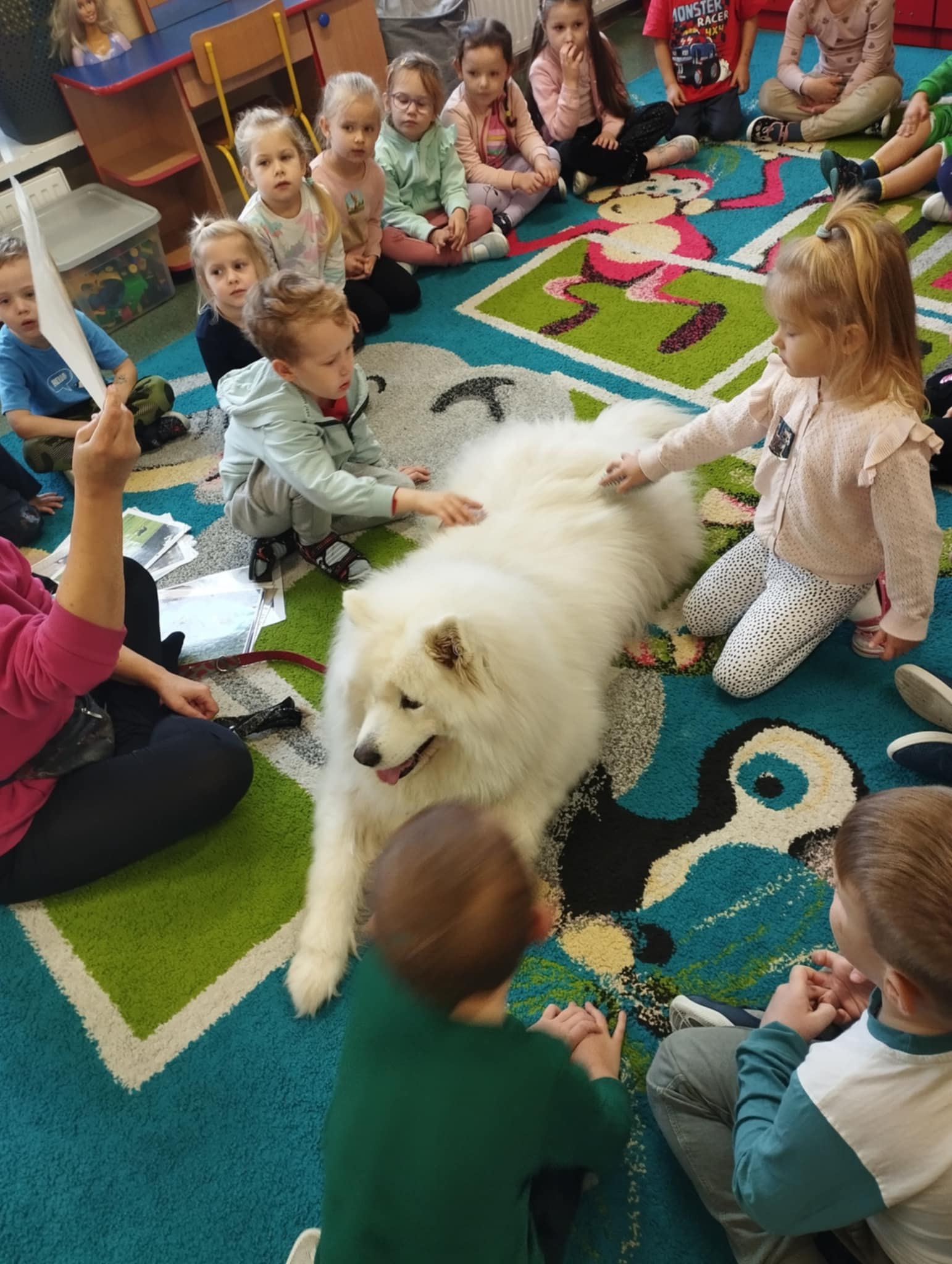 „Podczas dzisiejszej dogoterapii w przedszkolu gościliśmy cudownego samojeda. Dzieci z ogromną delikatnością czesały jego miękką sierść, głaskały go i cieszyły się jego spokojnym towarzystwem.