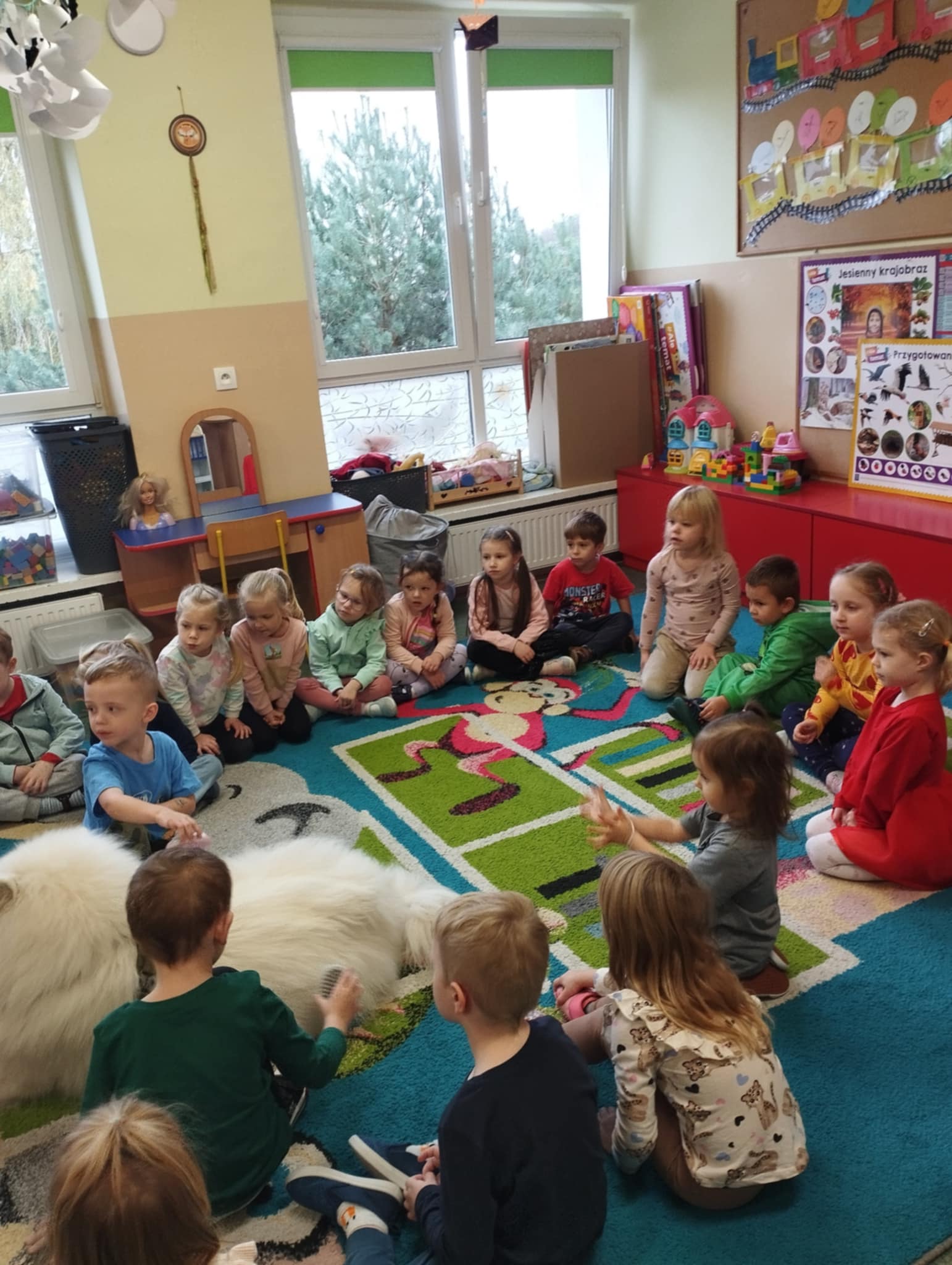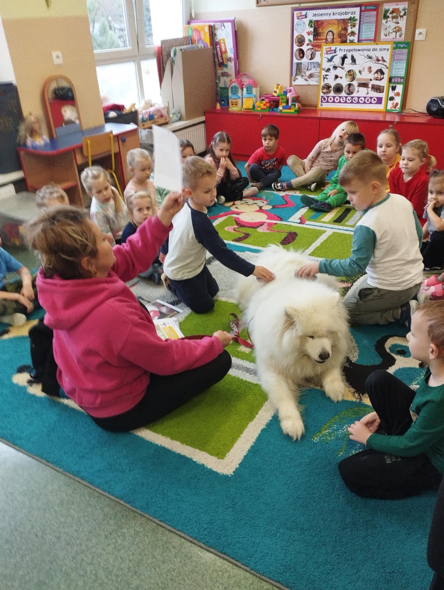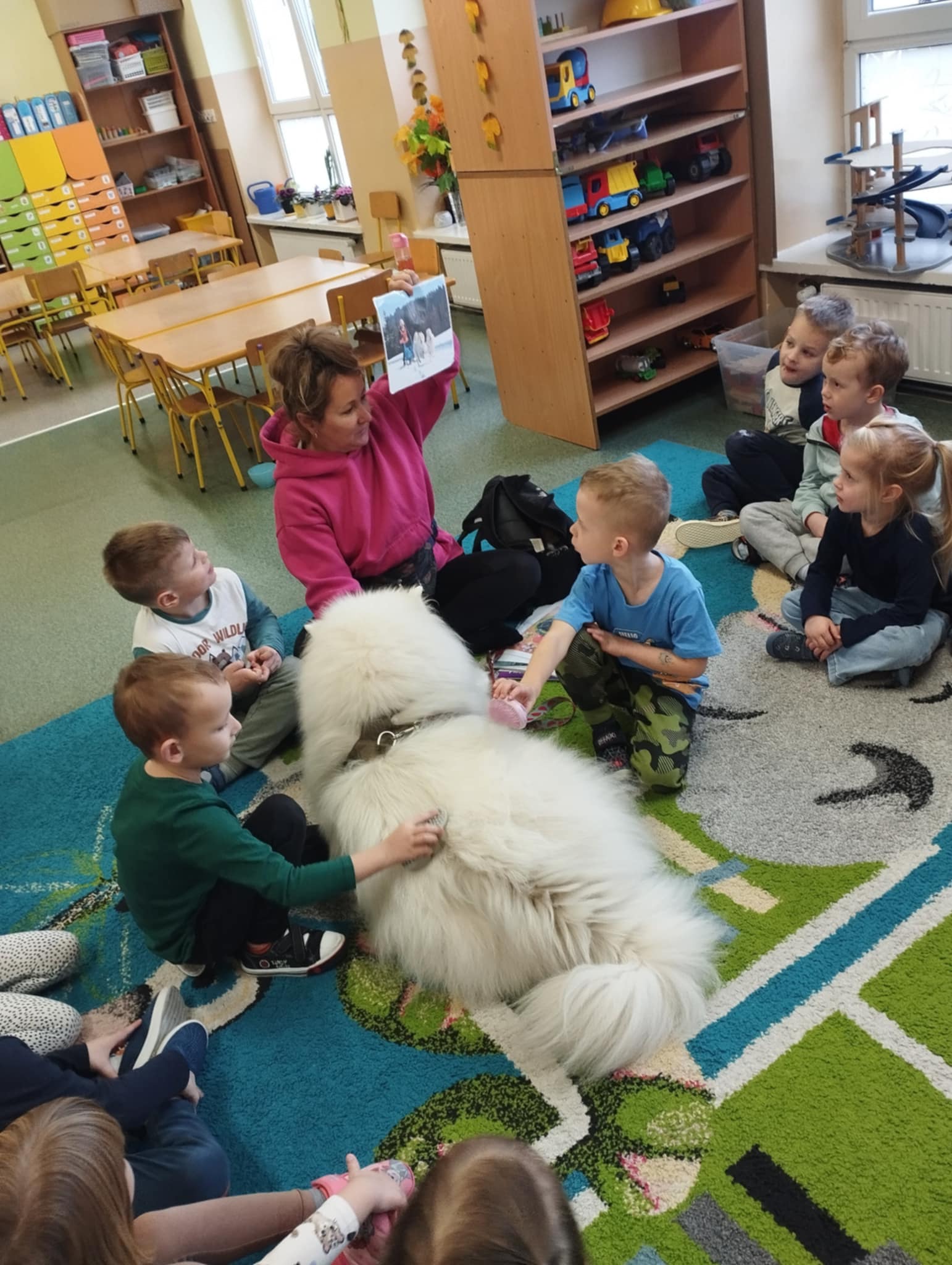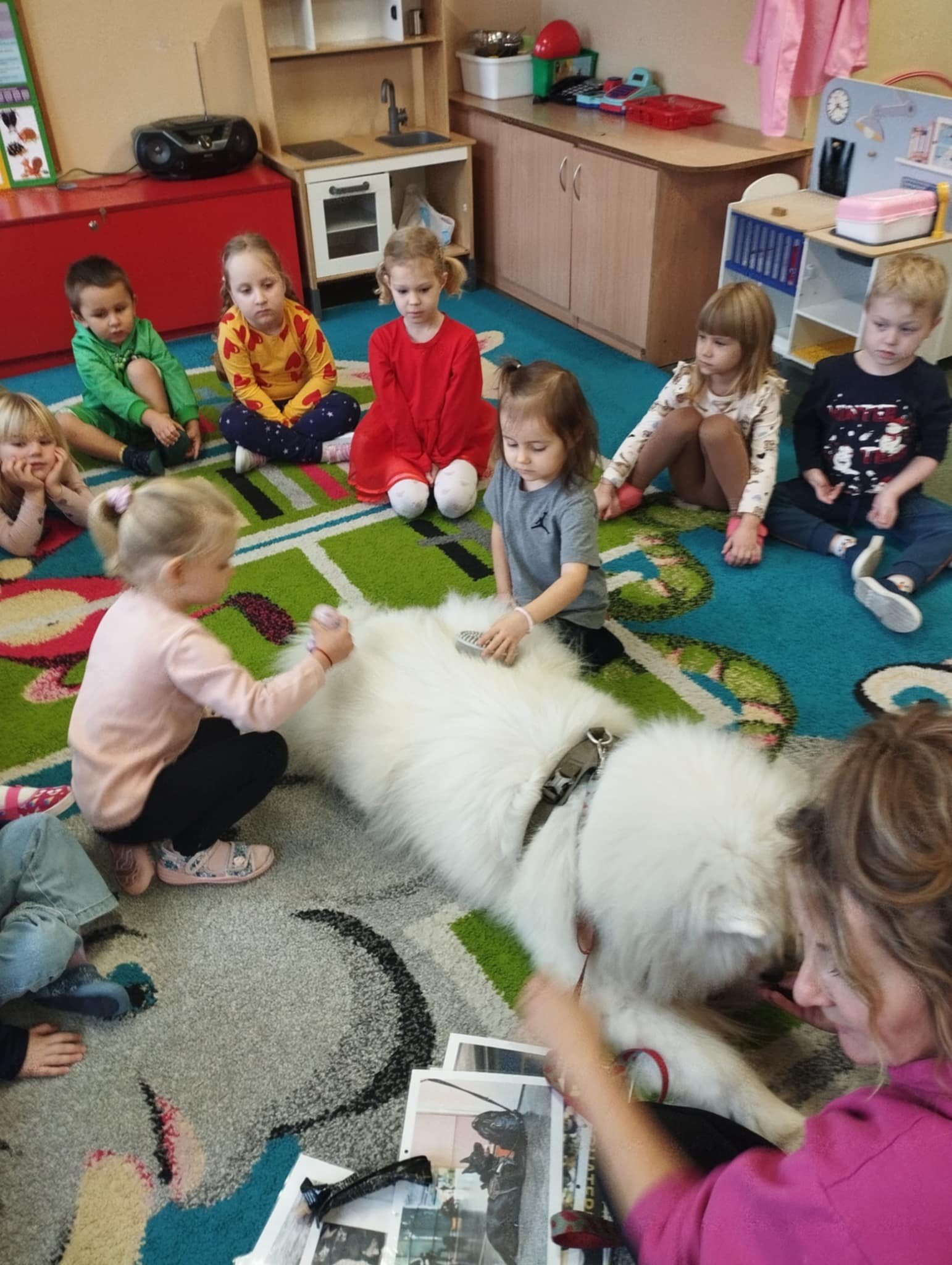 „Podczas dzisiejszej dogoterapii w przedszkolu gościliśmy cudownego samojeda. Dzieci z ogromną delikatnością czesały jego miękką sierść, głaskały go i cieszyły się jego spokojnym towarzystwem.
