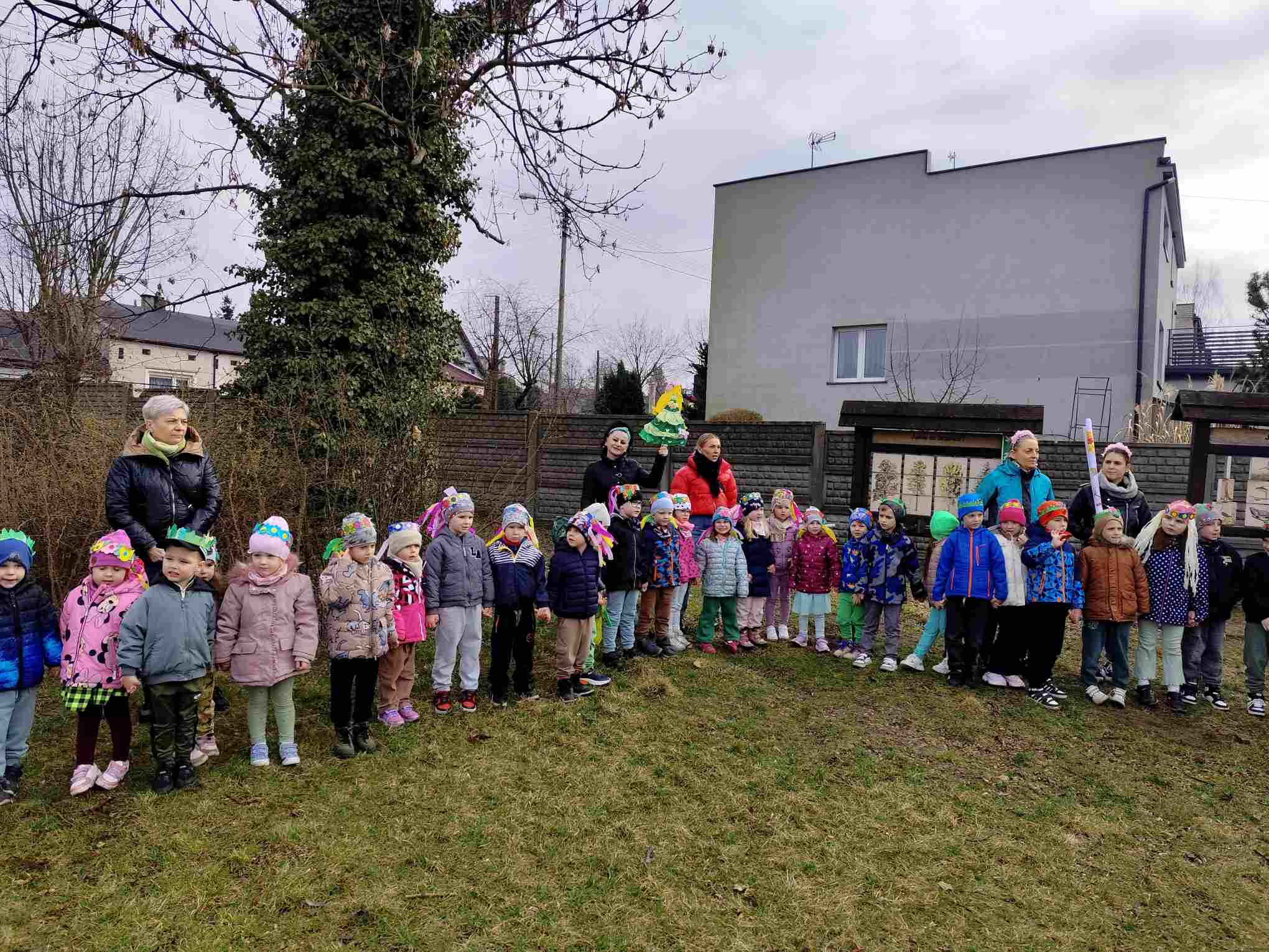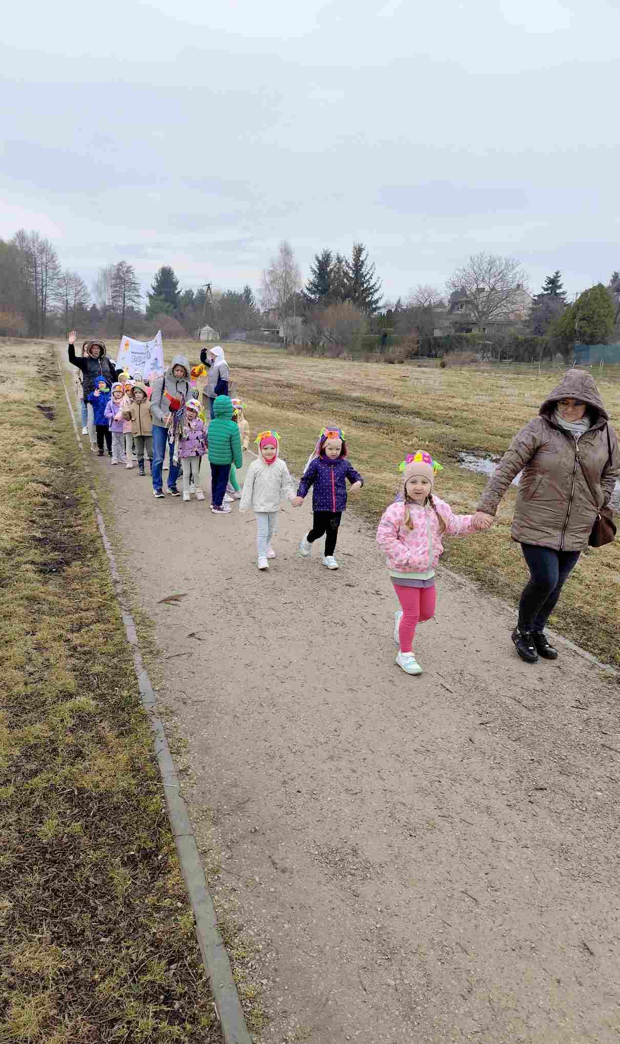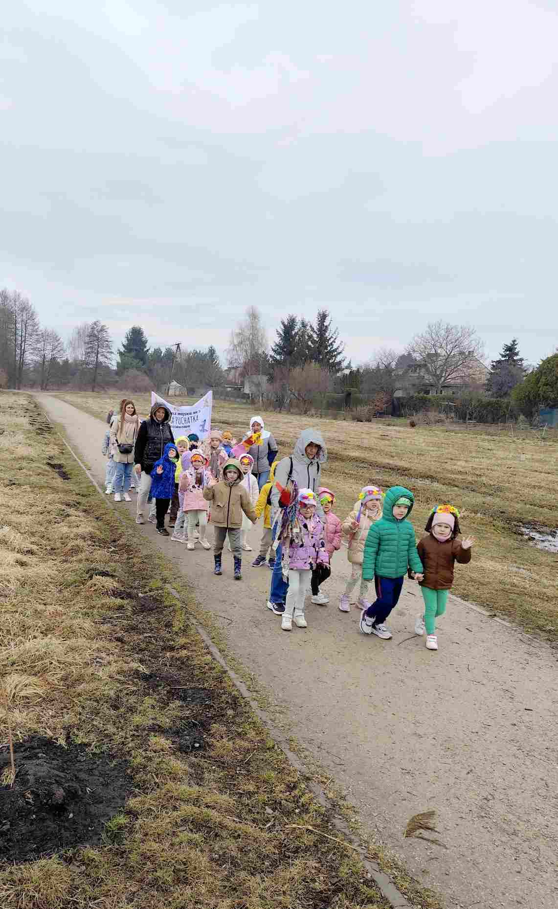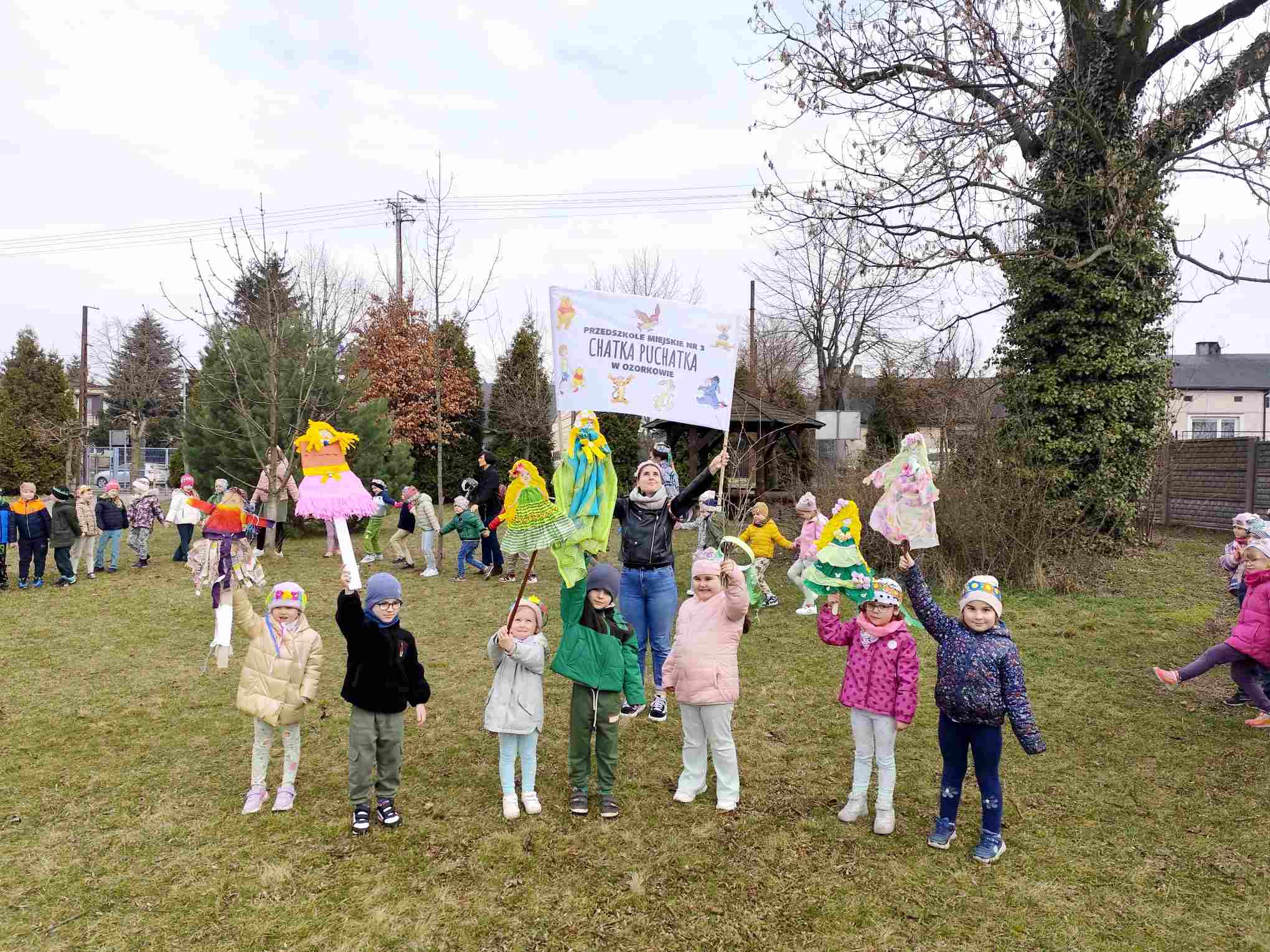 Powitanie wiosny to radosne święto obchodzone w Polsce zazwyczaj 21 marca, związane z nadejściem astronomicznej wiosny i dłuższymi dniami. Tradycyjne zwyczaje to topienie lub palenie słomianej kukły – Marzanny, symbolizującej zimę i śmierć, co ma przywołać ciepło i zieleń.Przedszkolaki z Chatki Puchatka postanowiły powitać nową porę roku spacerem ulicami wokół przedszkola.Każdy przedszkolak ubrany był w wiosennej kolorystyce.Uwieńczeniem stroju był wianek samodzielnie przez dzieci przygotowany kilka dni wcześniej.Wiosenny korowód ubarwiała muzyka i śpiew dzieci.A przy przedszkolu wszyscy ochoczo zaśpiewali dla wiosenki piosenkę " Maszeruje wiosna".Nową porę roku oficjalnie i z radością uważamy za rozpoczętą.