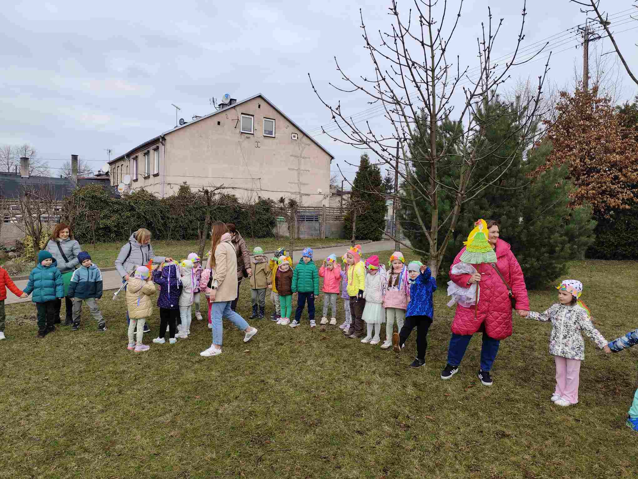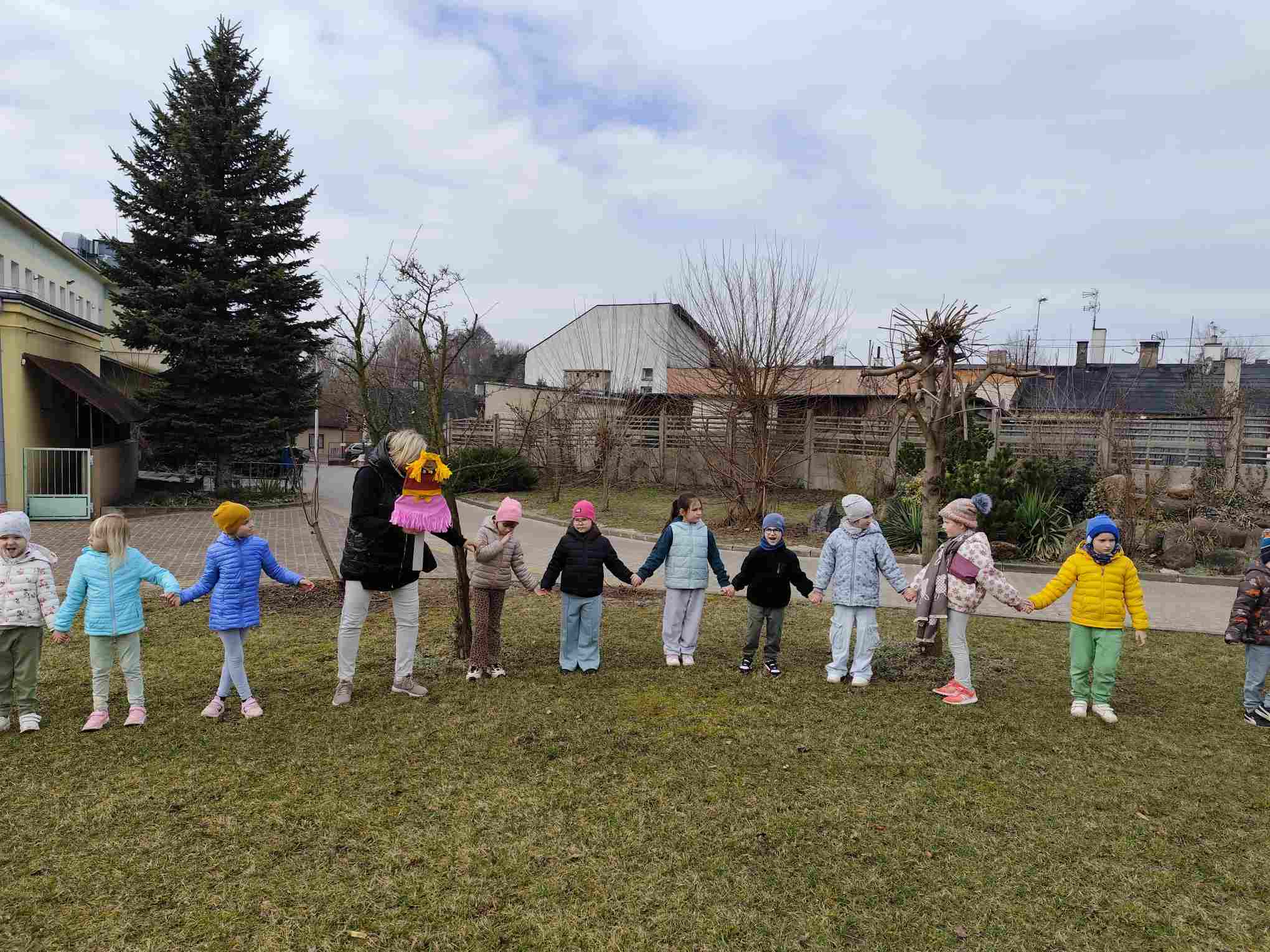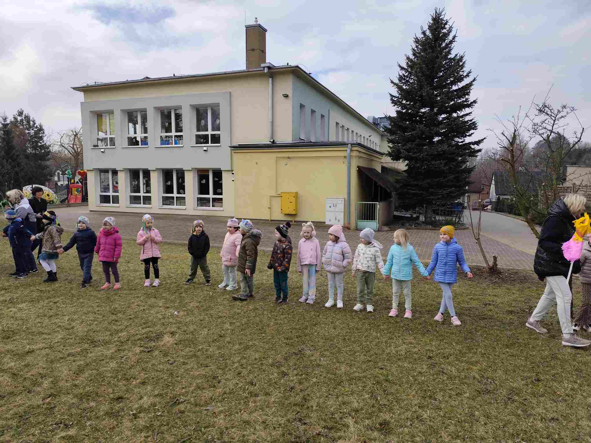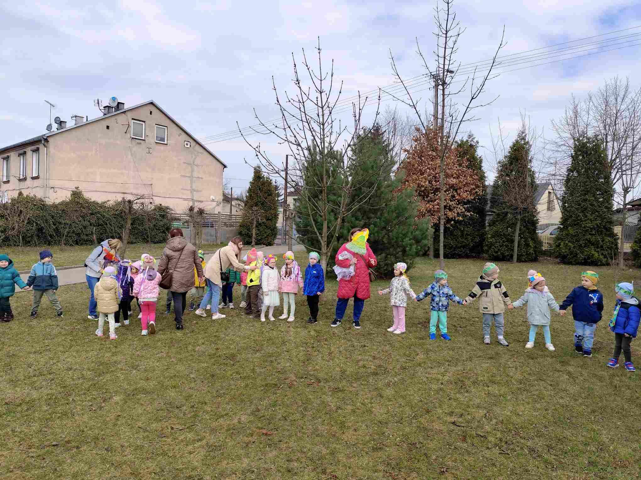 Powitanie wiosny to radosne święto obchodzone w Polsce zazwyczaj 21 marca, związane z nadejściem astronomicznej wiosny i dłuższymi dniami. Tradycyjne zwyczaje to topienie lub palenie słomianej kukły – Marzanny, symbolizującej zimę i śmierć, co ma przywołać ciepło i zieleń.Przedszkolaki z Chatki Puchatka postanowiły powitać nową porę roku spacerem ulicami wokół przedszkola.Każdy przedszkolak ubrany był w wiosennej kolorystyce.Uwieńczeniem stroju był wianek samodzielnie przez dzieci przygotowany kilka dni wcześniej.Wiosenny korowód ubarwiała muzyka i śpiew dzieci.A przy przedszkolu wszyscy ochoczo zaśpiewali dla wiosenki piosenkę " Maszeruje wiosna".Nową porę roku oficjalnie i z radością uważamy za rozpoczętą.