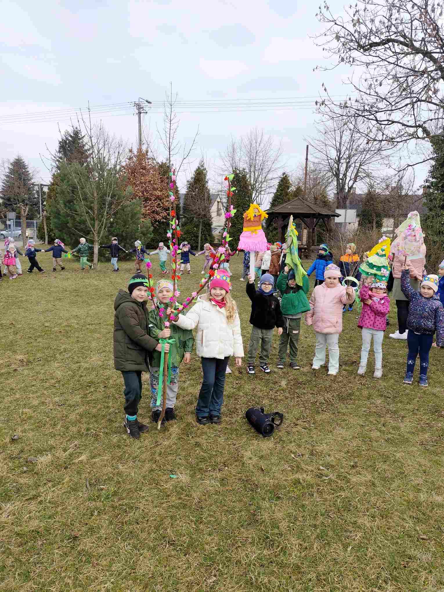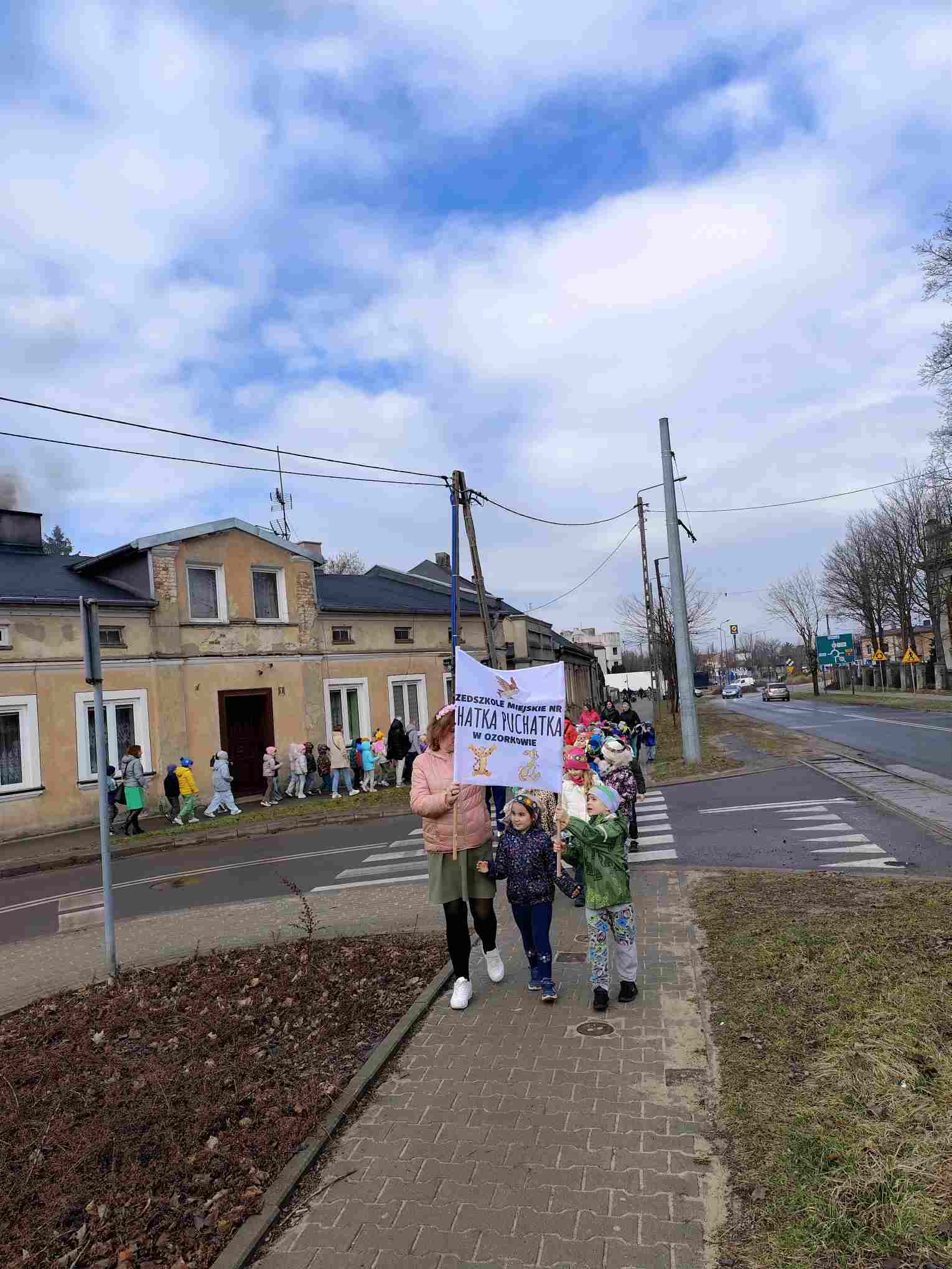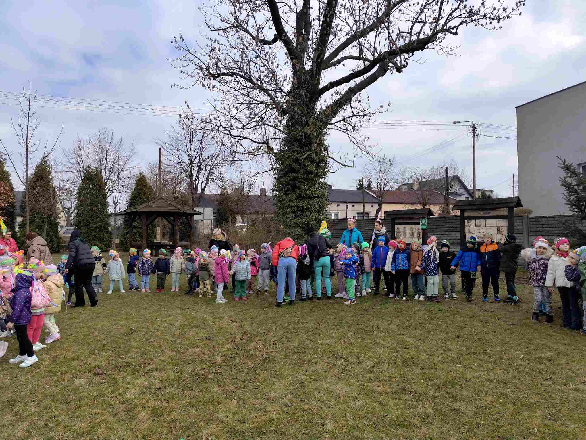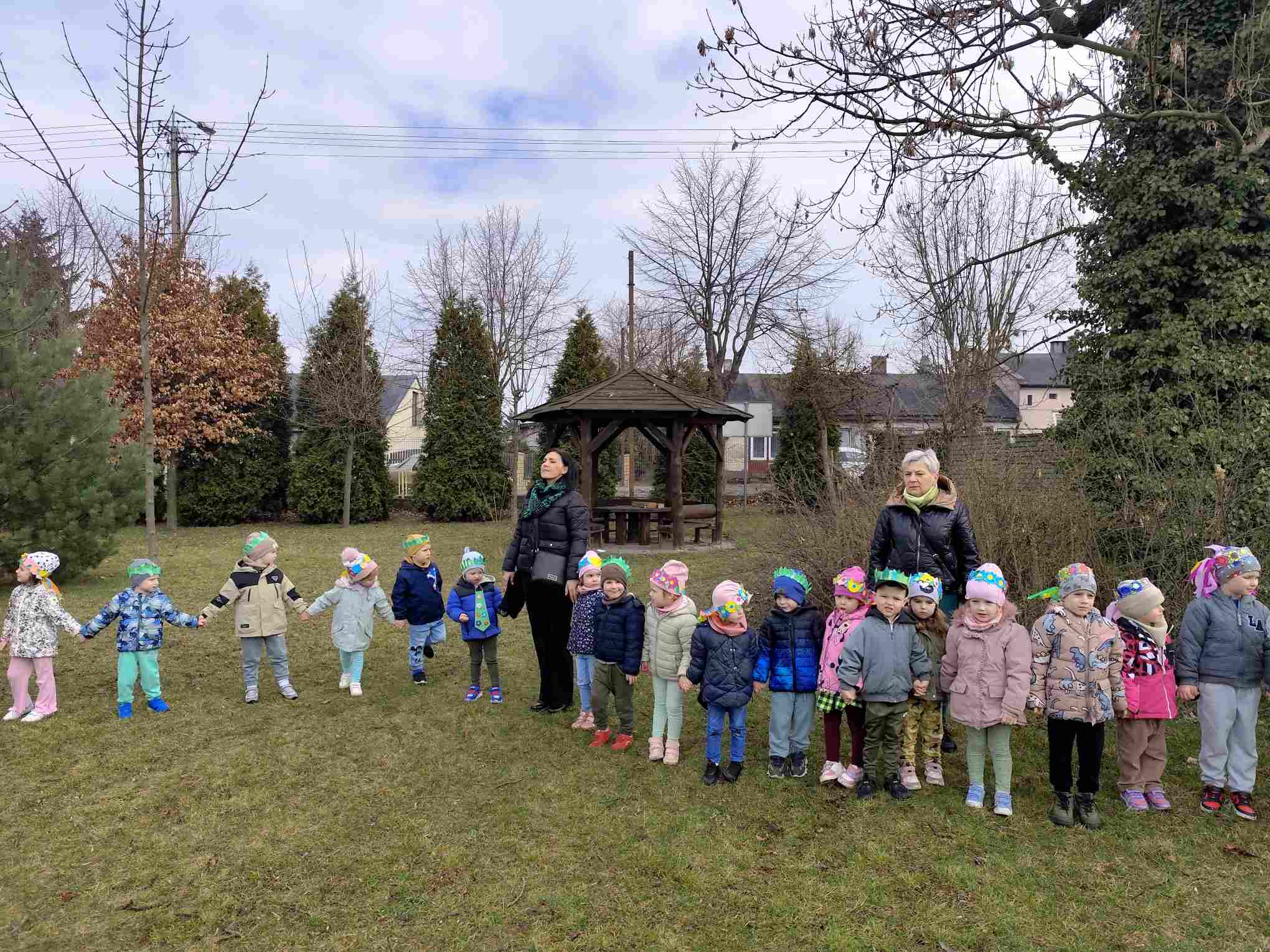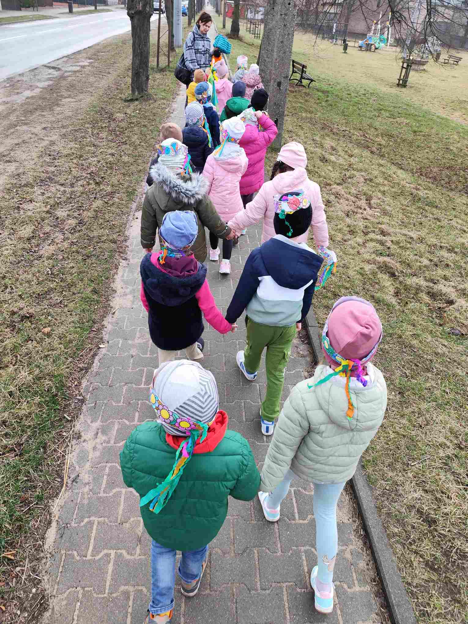 Powitanie wiosny to radosne święto obchodzone w Polsce zazwyczaj 21 marca, związane z nadejściem astronomicznej wiosny i dłuższymi dniami. Tradycyjne zwyczaje to topienie lub palenie słomianej kukły – Marzanny, symbolizującej zimę i śmierć, co ma przywołać ciepło i zieleń.Przedszkolaki z Chatki Puchatka postanowiły powitać nową porę roku spacerem ulicami wokół przedszkola.Każdy przedszkolak ubrany był w wiosennej kolorystyce.Uwieńczeniem stroju był wianek samodzielnie przez dzieci przygotowany kilka dni wcześniej.Wiosenny korowód ubarwiała muzyka i śpiew dzieci.A przy przedszkolu wszyscy ochoczo zaśpiewali dla wiosenki piosenkę " Maszeruje wiosna".Nową porę roku oficjalnie i z radością uważamy za rozpoczętą.