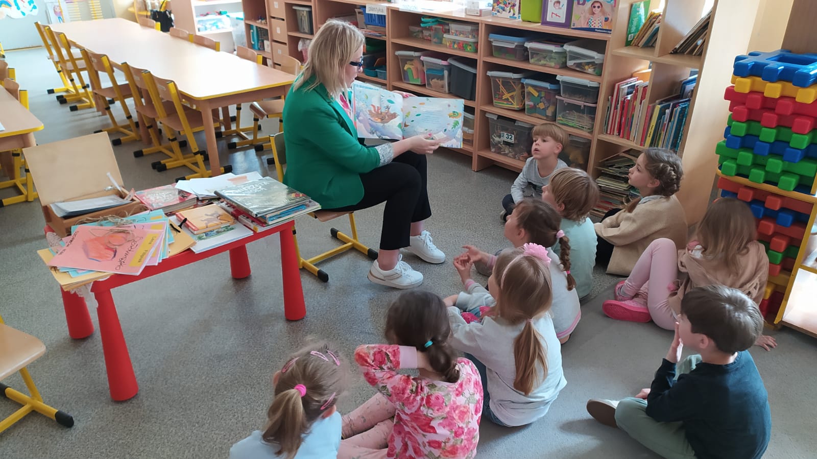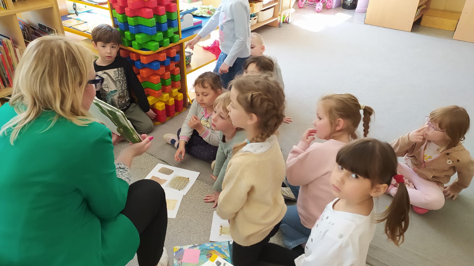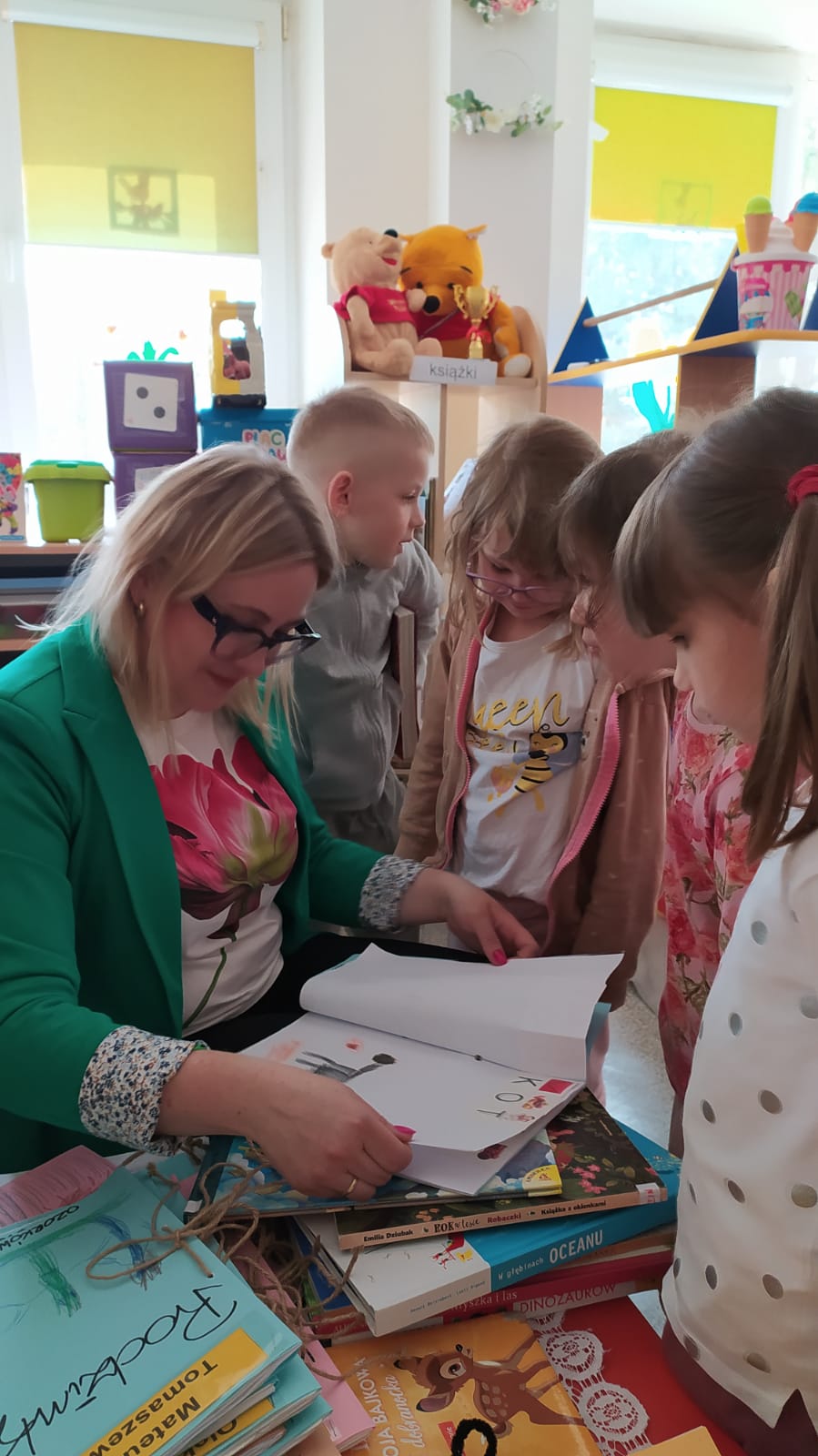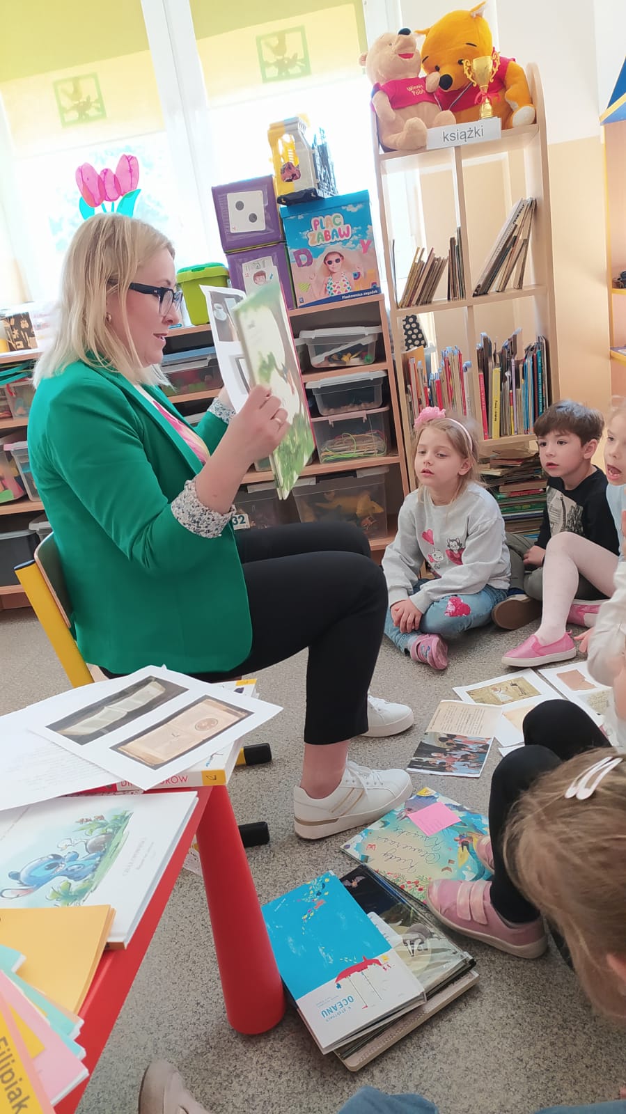 23 kwietnia gościliśmy w przedszkolu z okazji Swiatowego Dnia Książki panią bibliotekarkę, Aleksandrę Kalinowską. Spotkanie było okazją do podsumowania wiadomości o książkach.Z przyjemnością posłuchaliśmy czytanej przez nią bajki.