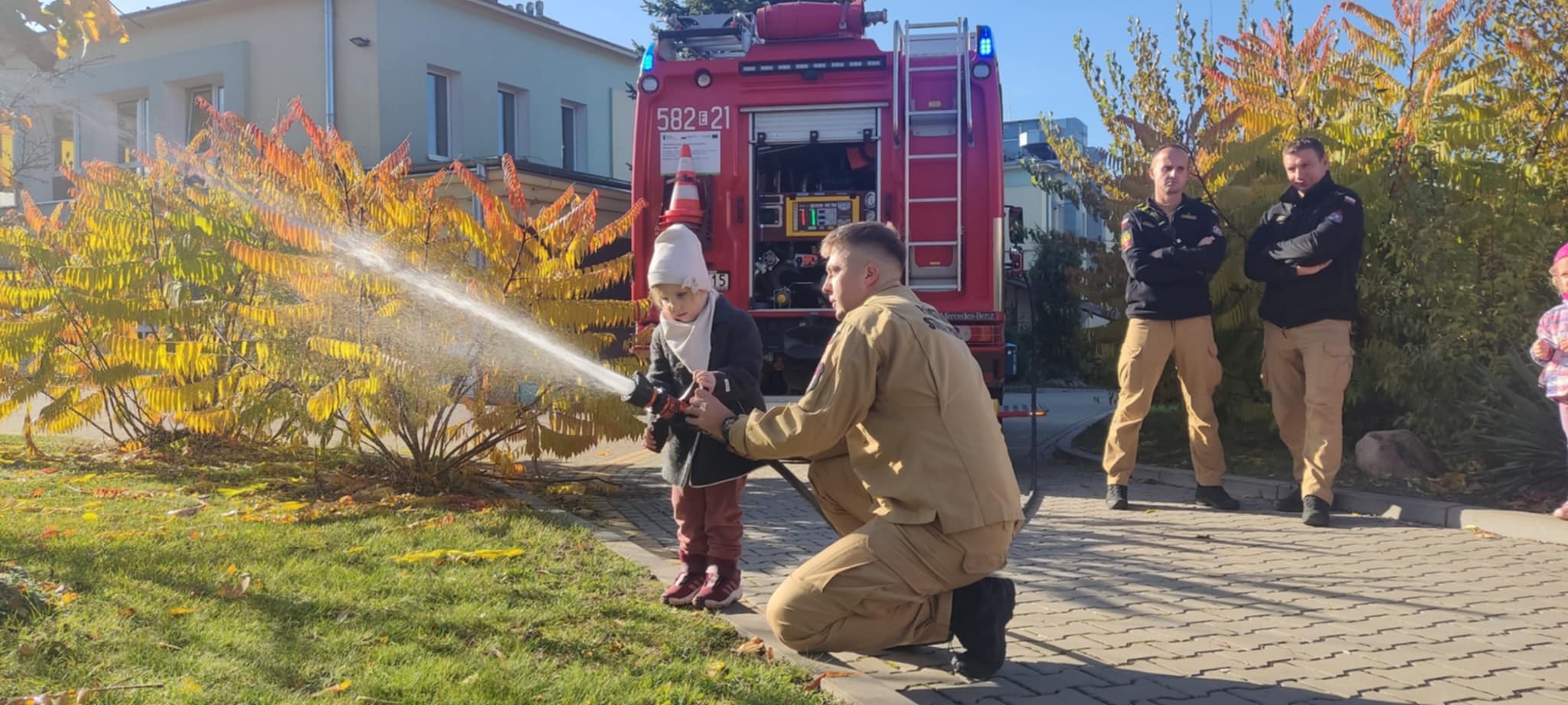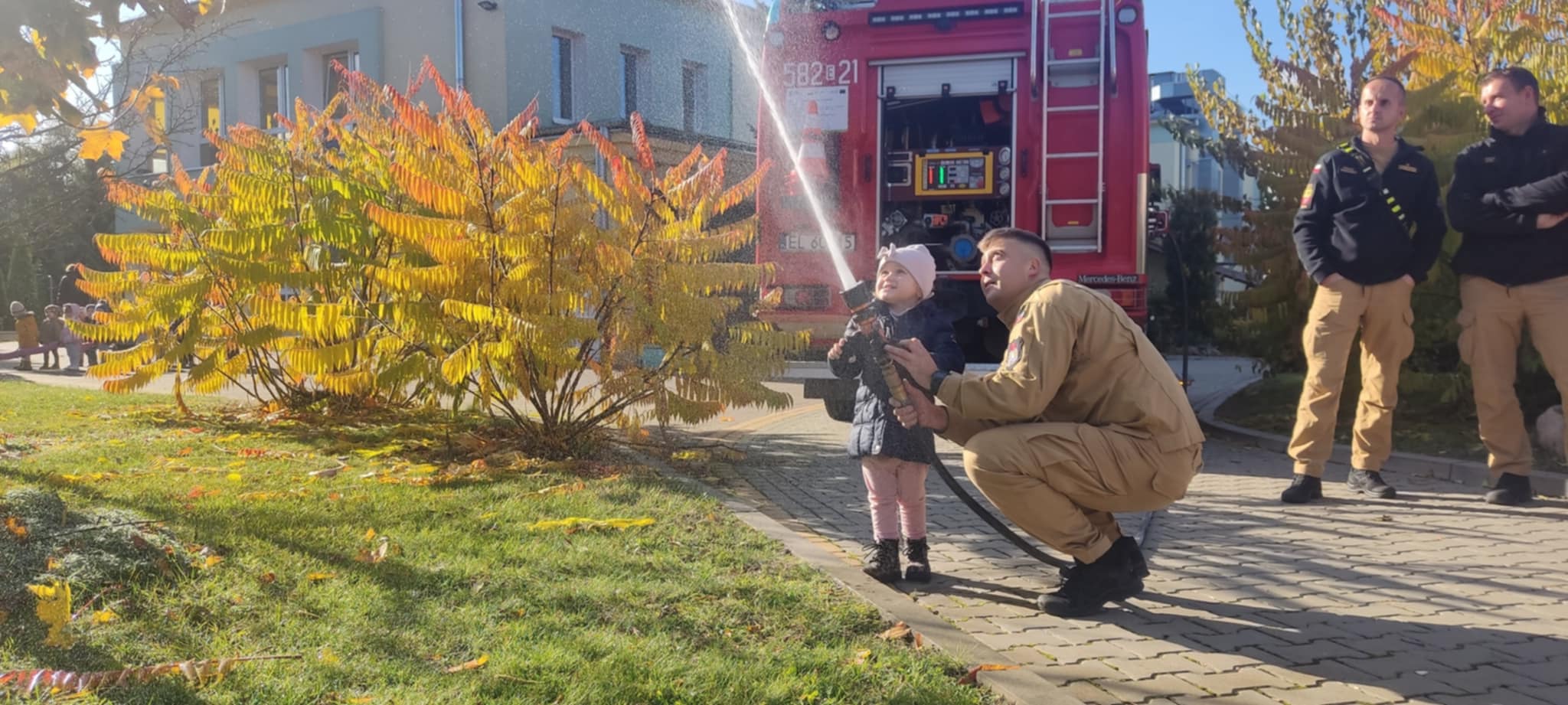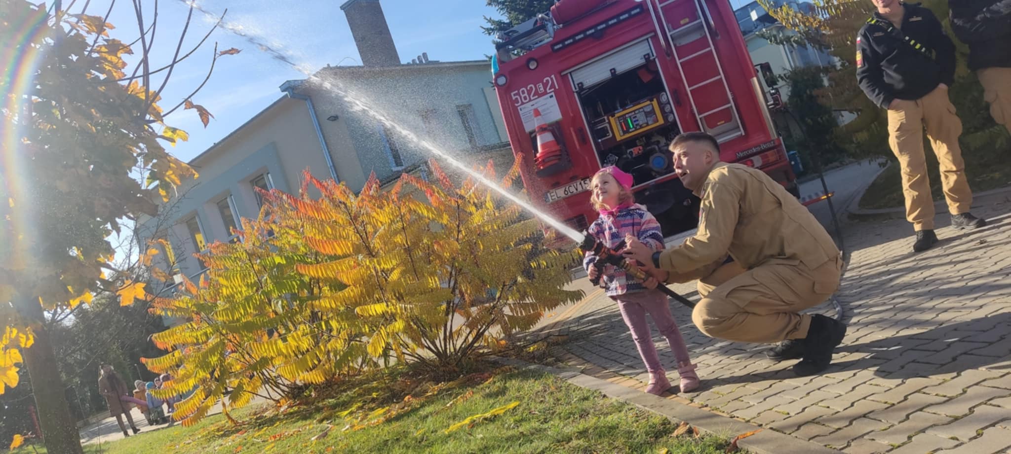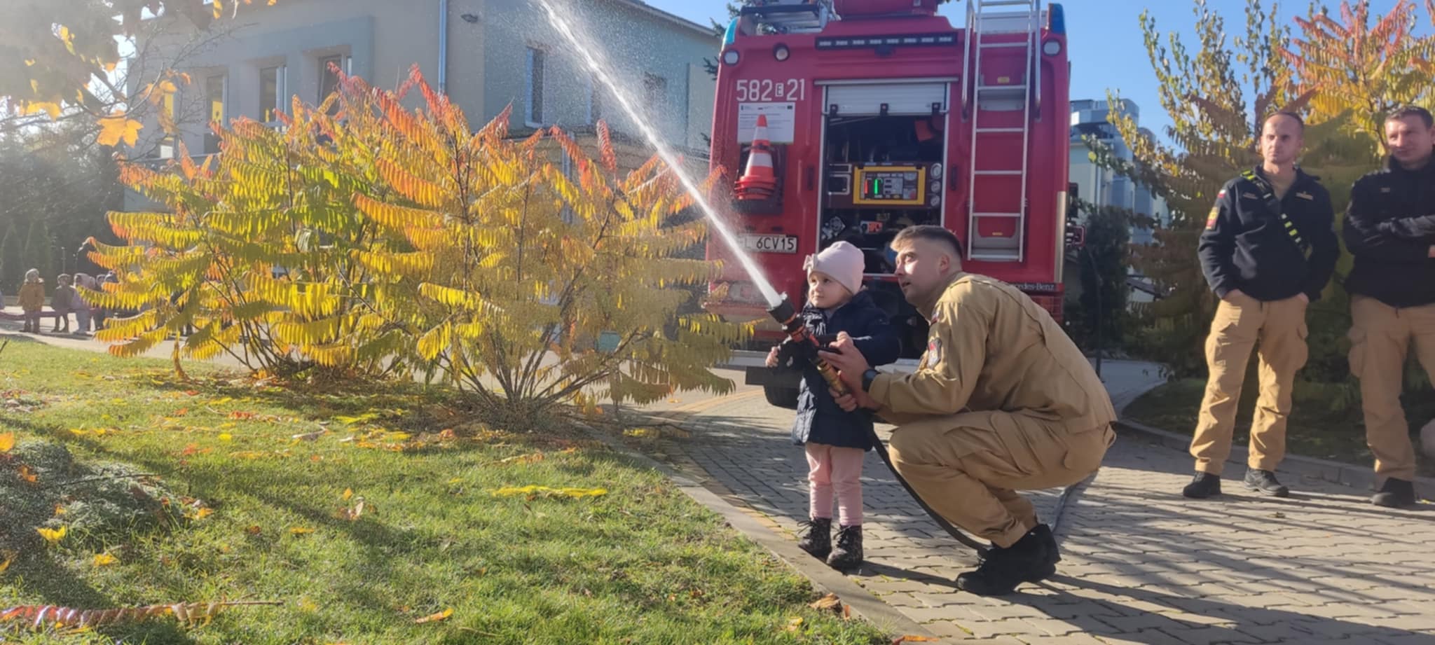Strażacy zaprezentowali swój sprzęt ratowniczy — hełmy, węże, maski i ubrania ochronne. Największe wrażenie zrobił wóz strażacki, który dzieci mogły dokładnie obejrzeć z bliska. Niektórzy odważni przedszkolacy mieli okazję usiąść w kabinie kierowcy i posłuchać dźwięku syreny! Niemniejsze wrażenie na dzieciach zrobiła możliwość lania wody z węża strażackiego.