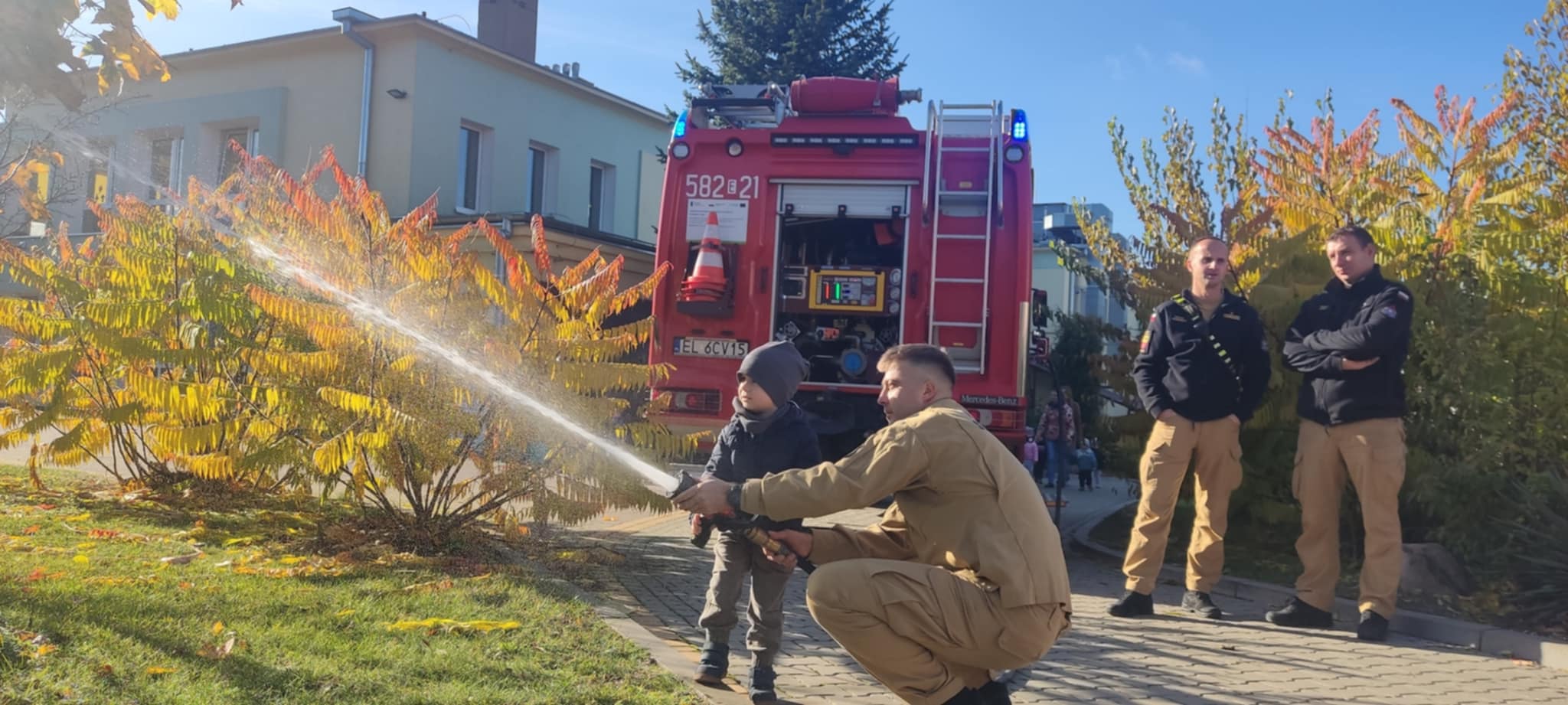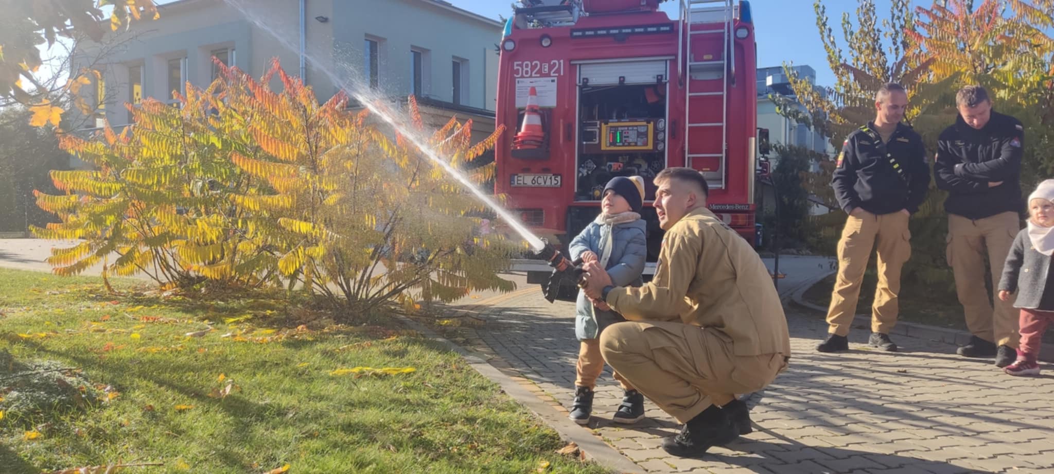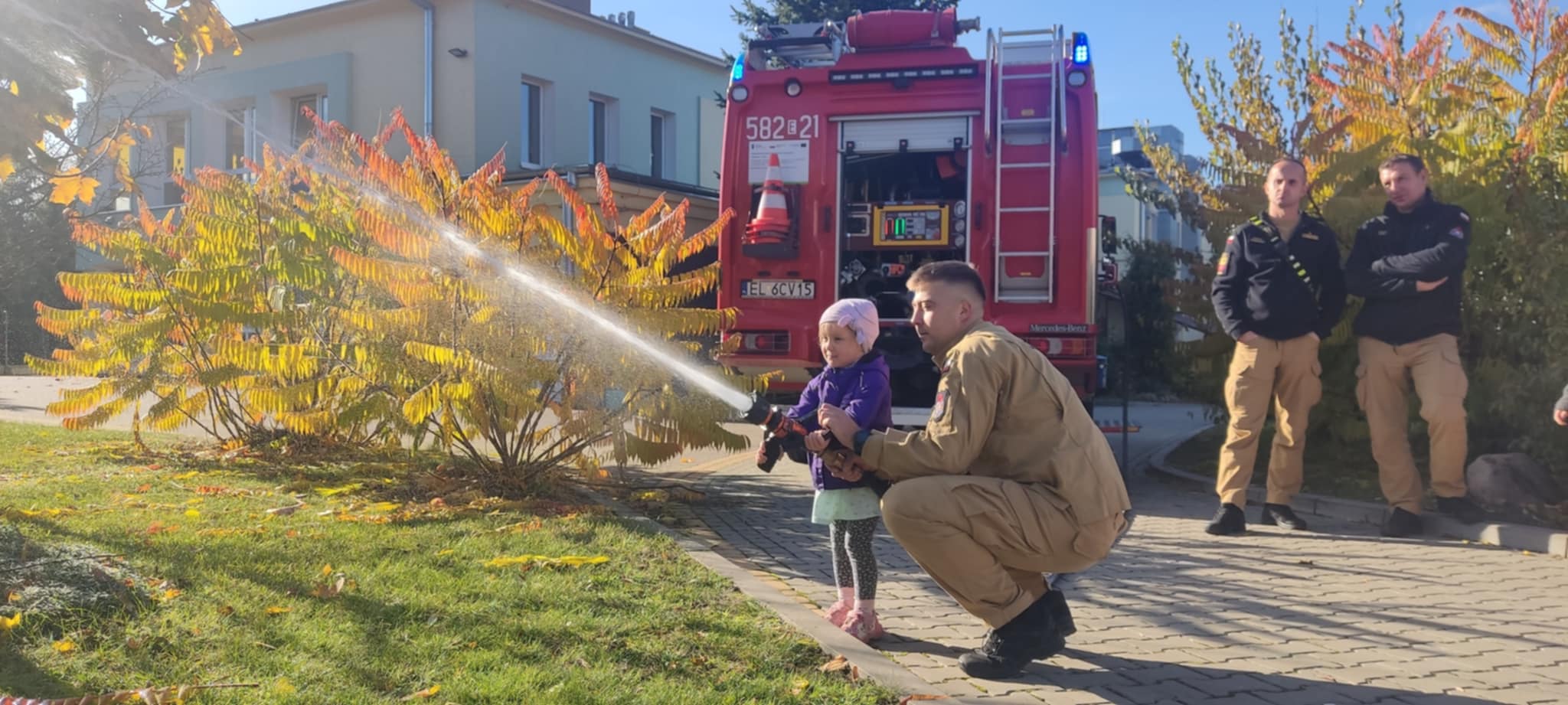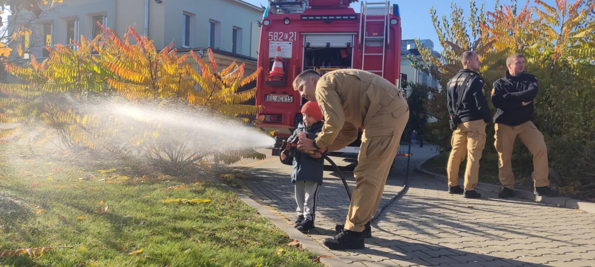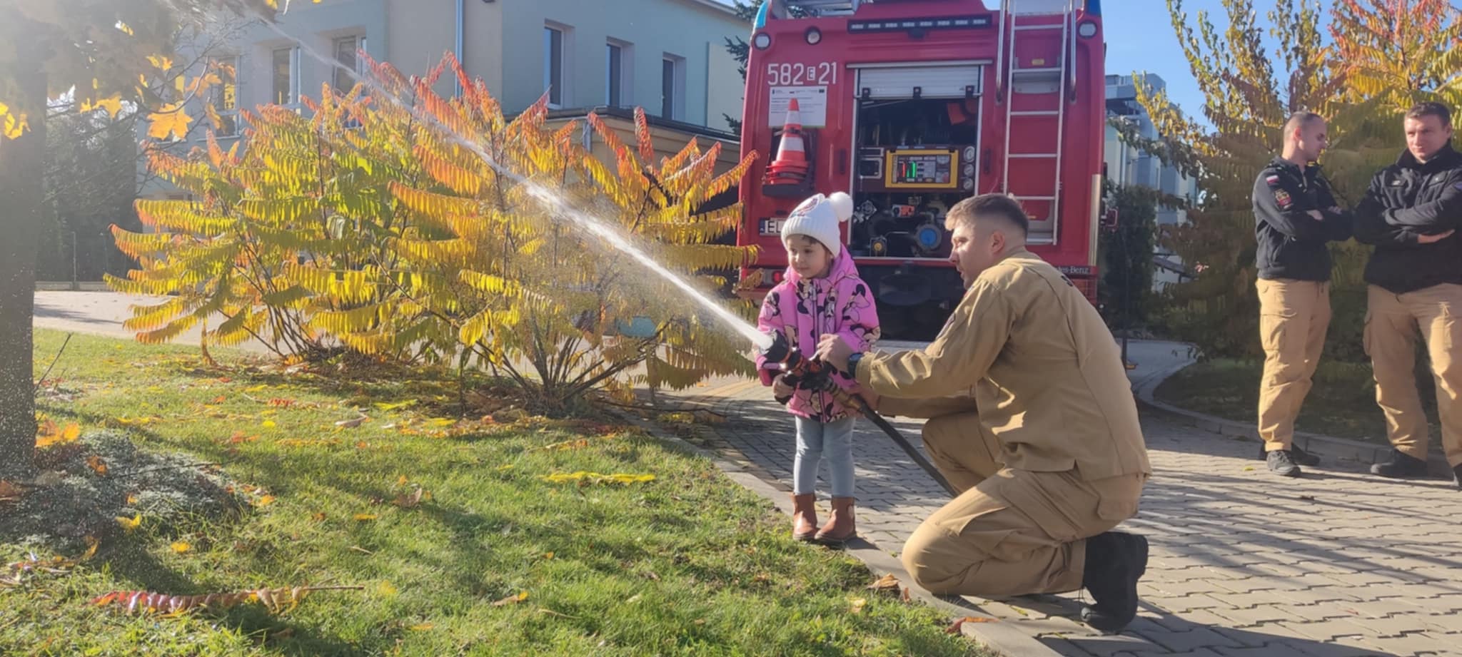 Strażacy zaprezentowali swój sprzęt ratowniczy — hełmy, węże, maski i ubrania ochronne. Największe wrażenie zrobił wóz strażacki, który dzieci mogły dokładnie obejrzeć z bliska. Niektórzy odważni przedszkolacy mieli okazję usiąść w kabinie kierowcy i posłuchać dźwięku syreny! Niemniejsze wrażenie na dzieciach zrobiła możliwość lania wody z węża strażackiego.