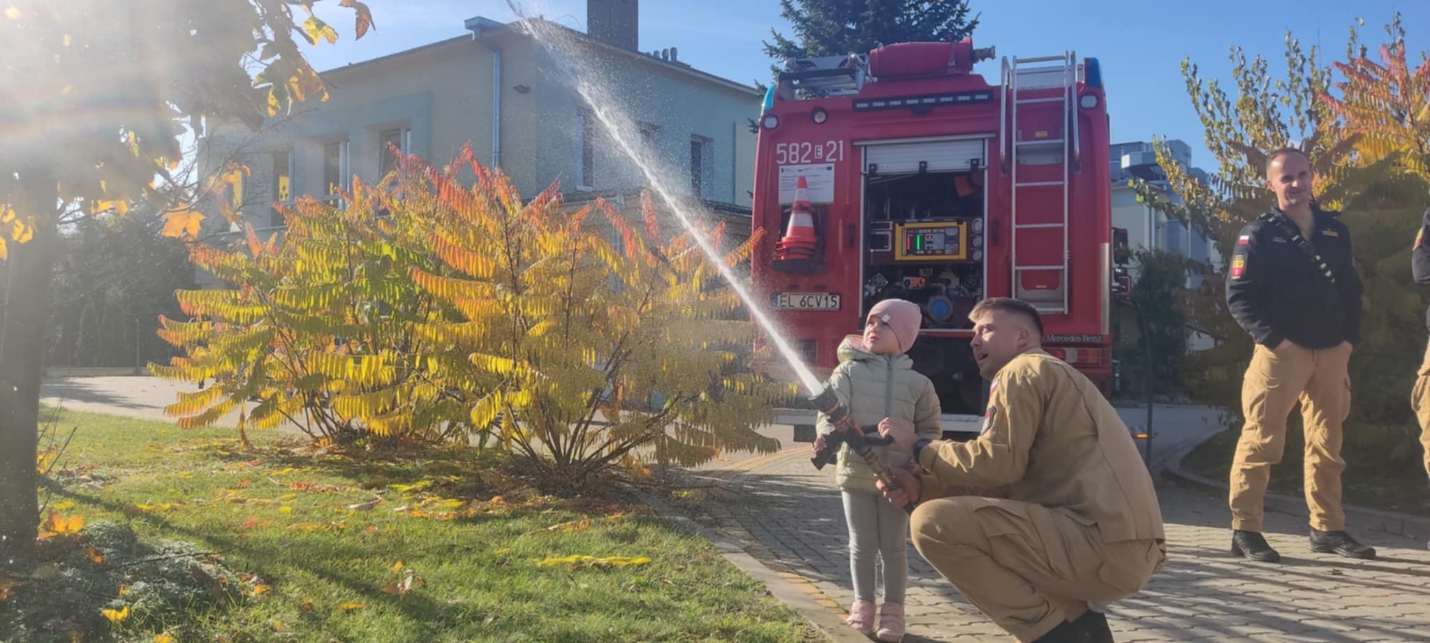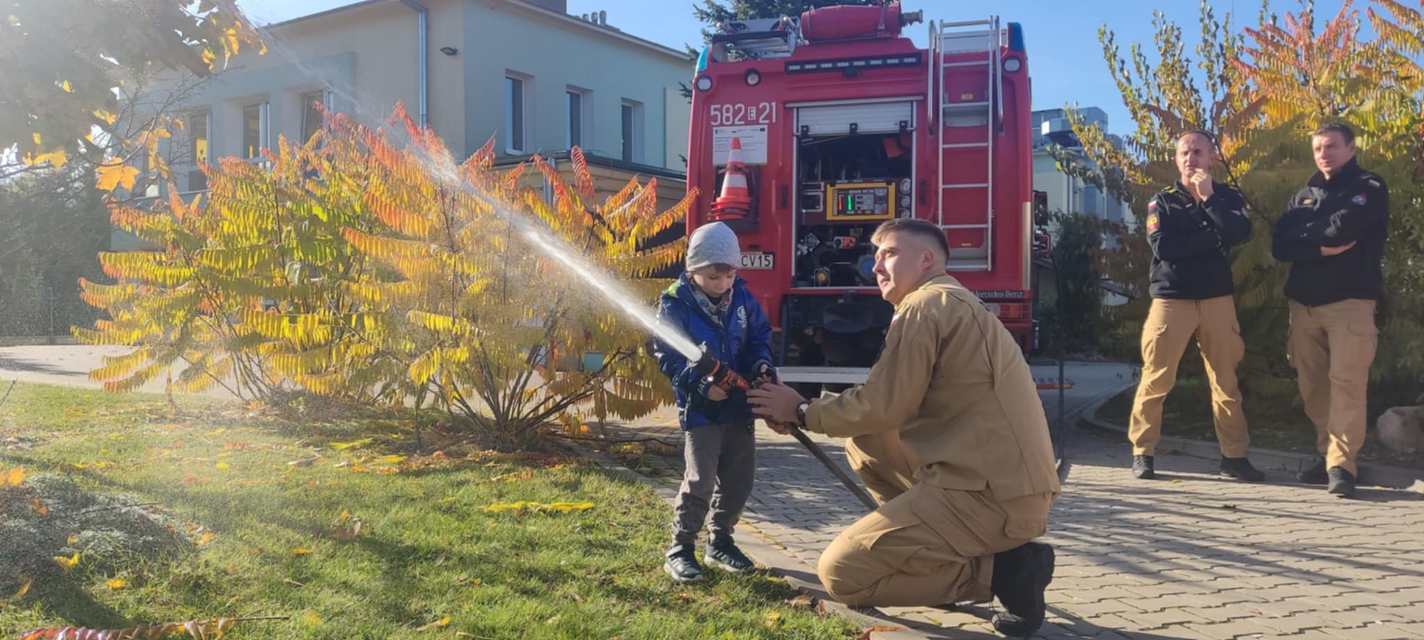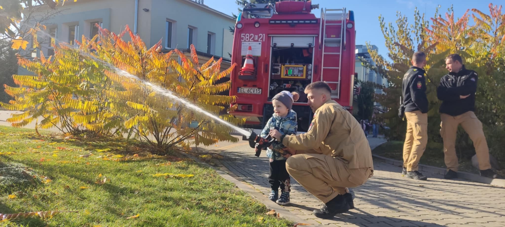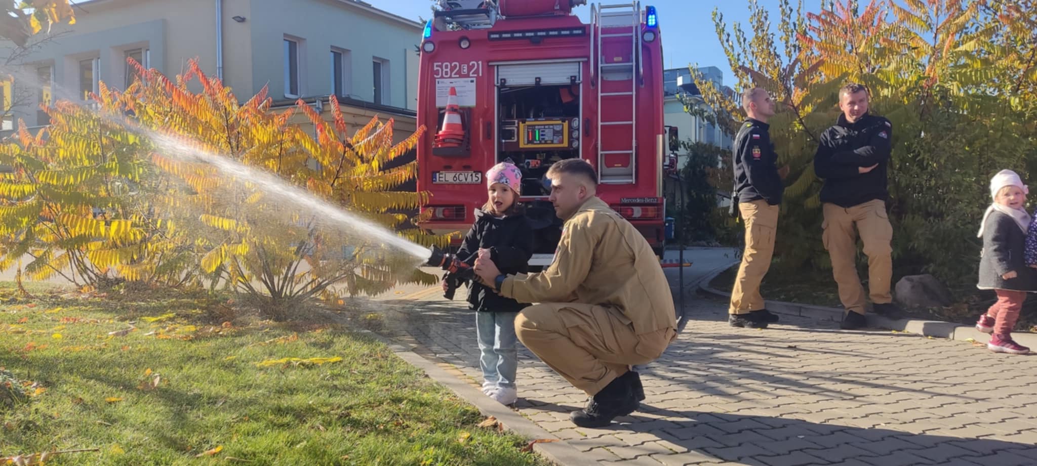Strażacy zaprezentowali swój sprzęt ratowniczy — hełmy, węże, maski i ubrania ochronne. Największe wrażenie zrobił wóz strażacki, który dzieci mogły dokładnie obejrzeć z bliska. Niektórzy odważni przedszkolacy mieli okazję usiąść w kabinie kierowcy i posłuchać dźwięku syreny! Niemniejsze wrażenie na dzieciach zrobiła możliwość lania wody z węża strażackiego.
