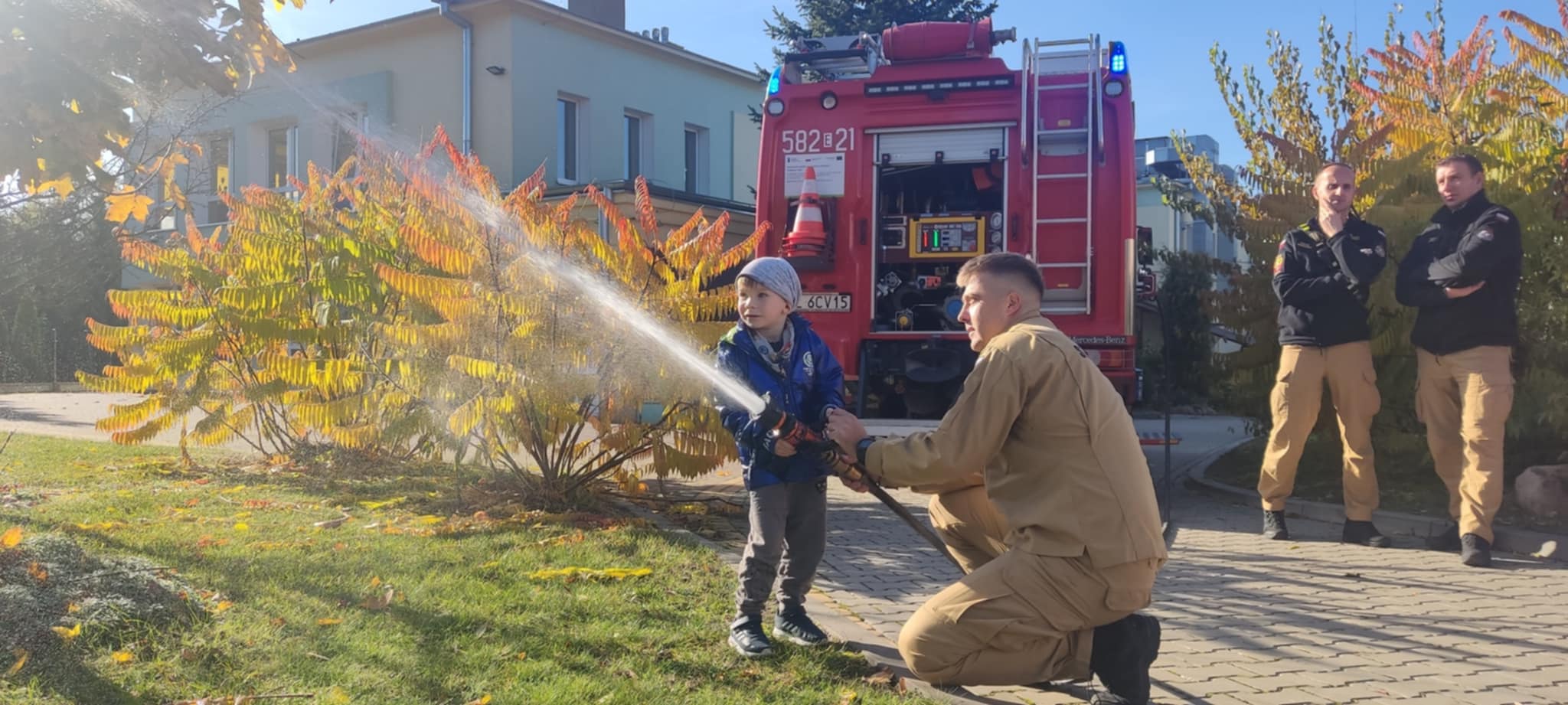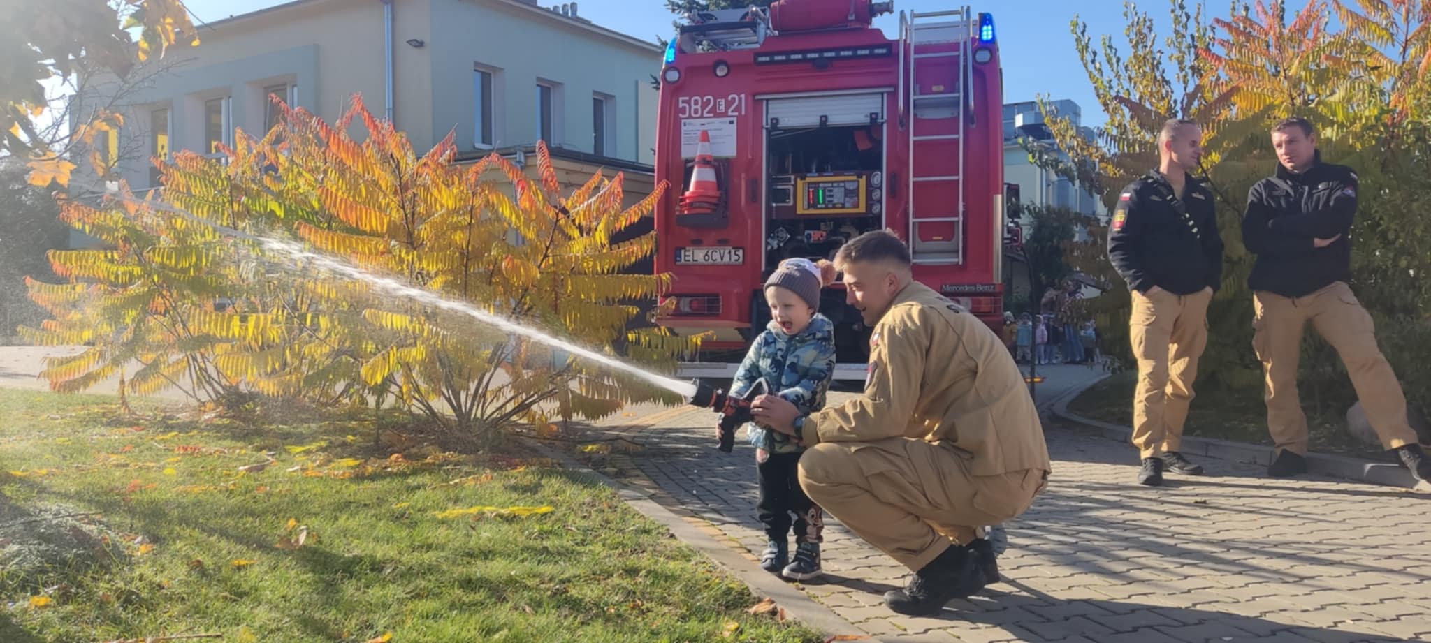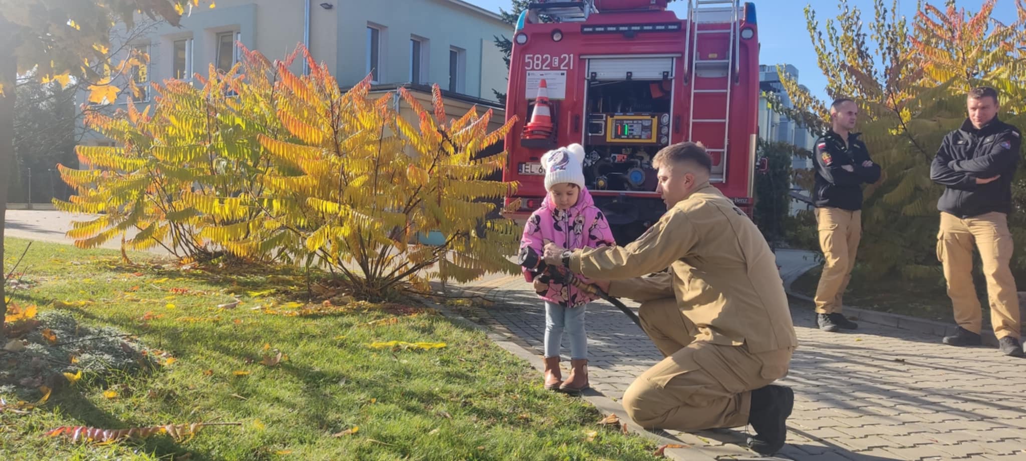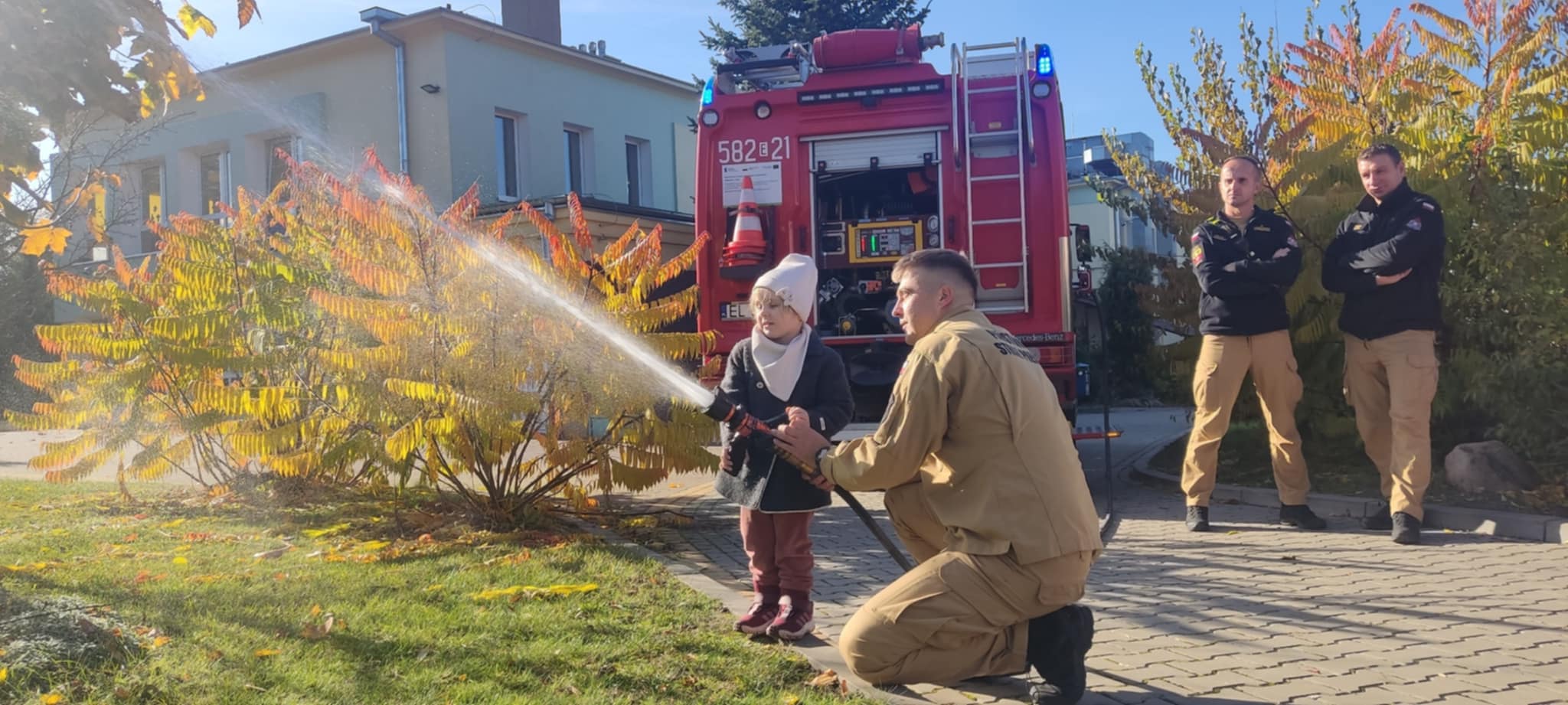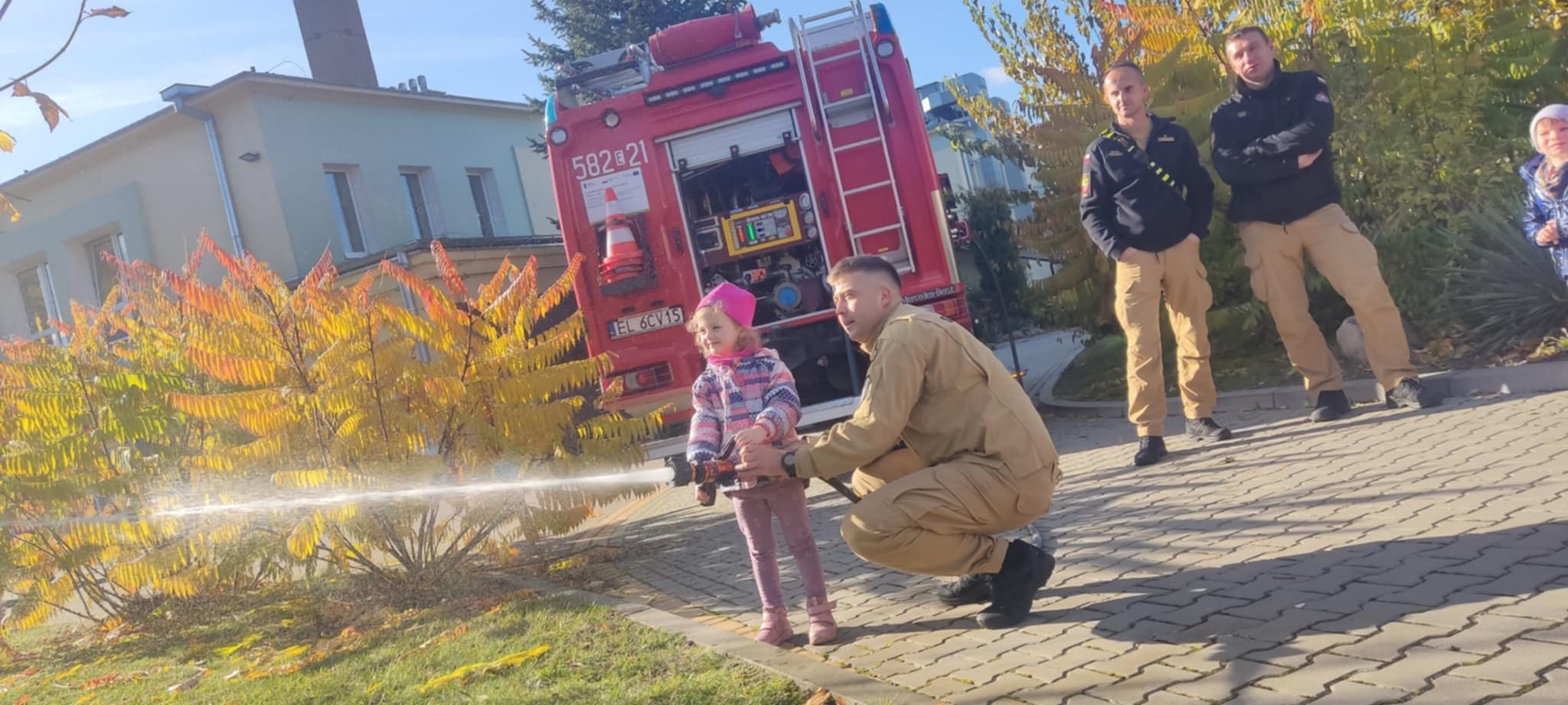 Strażacy zaprezentowali swój sprzęt ratowniczy — hełmy, węże, maski i ubrania ochronne. Największe wrażenie zrobił wóz strażacki, który dzieci mogły dokładnie obejrzeć z bliska. Niektórzy odważni przedszkolacy mieli okazję usiąść w kabinie kierowcy i posłuchać dźwięku syreny! Niemniejsze wrażenie na dzieciach zrobiła możliwość lania wody z węża strażackiego.