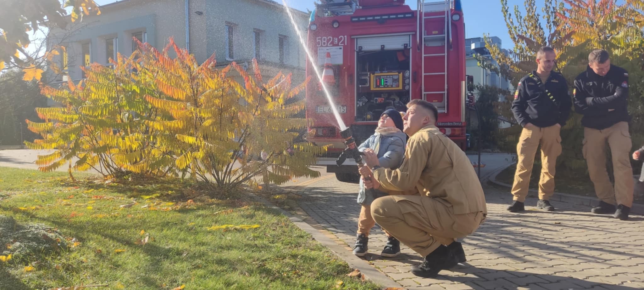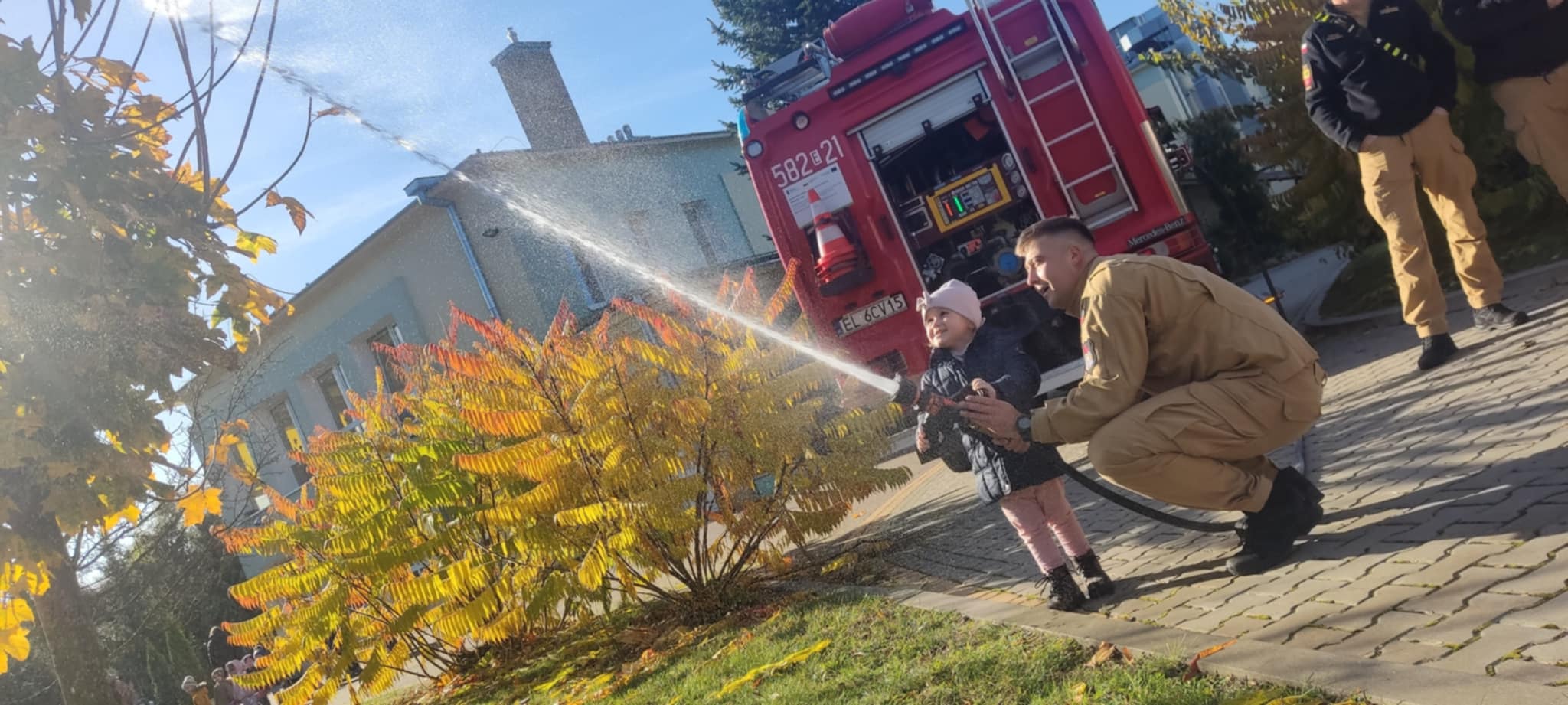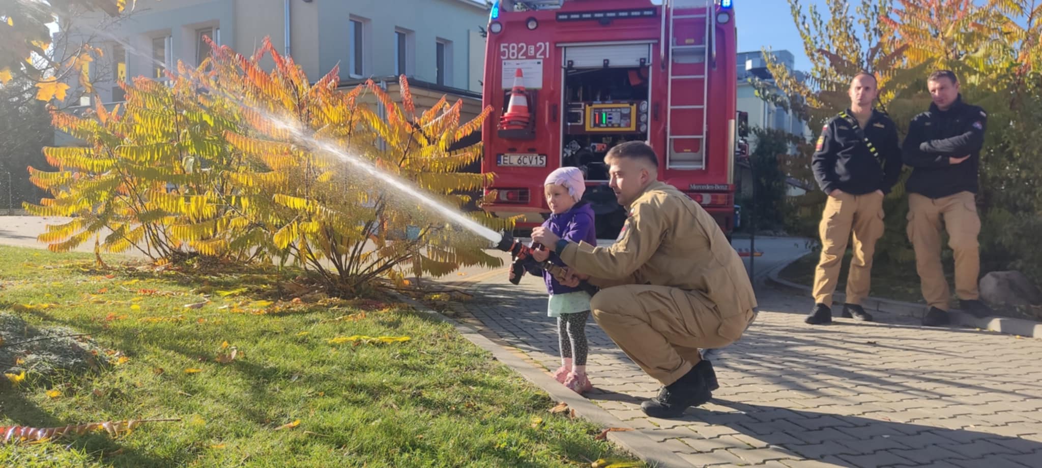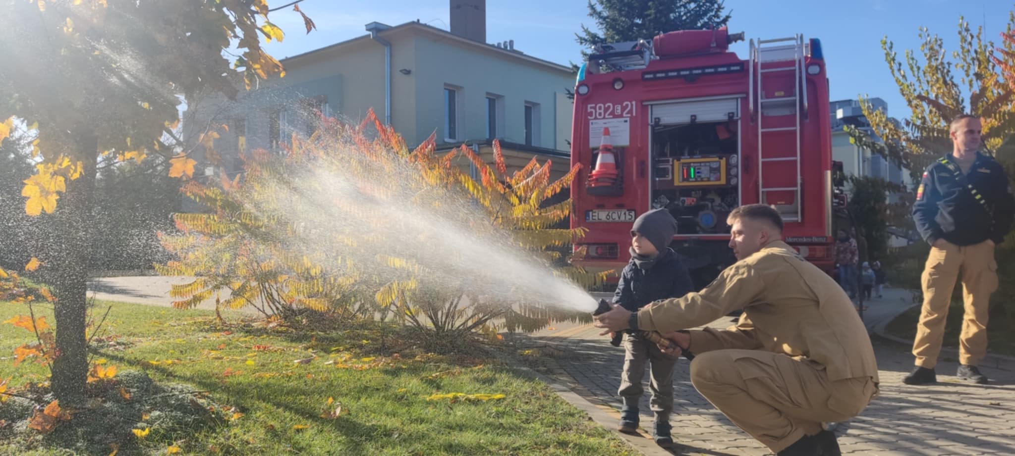 Strażacy zaprezentowali swój sprzęt ratowniczy — hełmy, węże, maski i ubrania ochronne. Największe wrażenie zrobił wóz strażacki, który dzieci mogły dokładnie obejrzeć z bliska. Niektórzy odważni przedszkolacy mieli okazję usiąść w kabinie kierowcy i posłuchać dźwięku syreny! Niemniejsze wrażenie na dzieciach zrobiła możliwość lania wody z węża strażackiego.