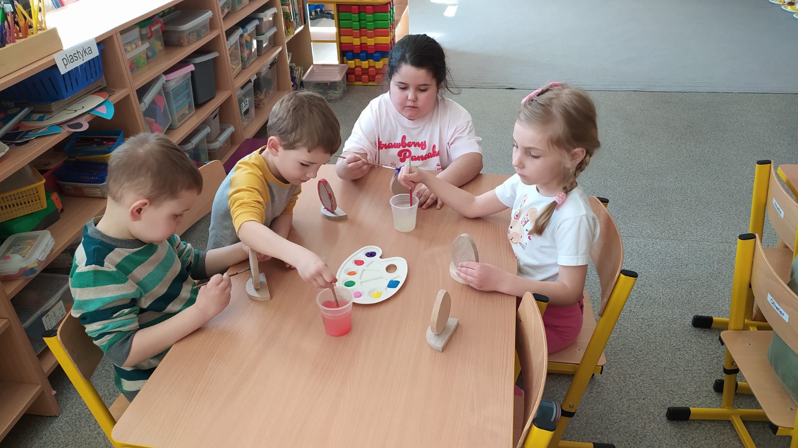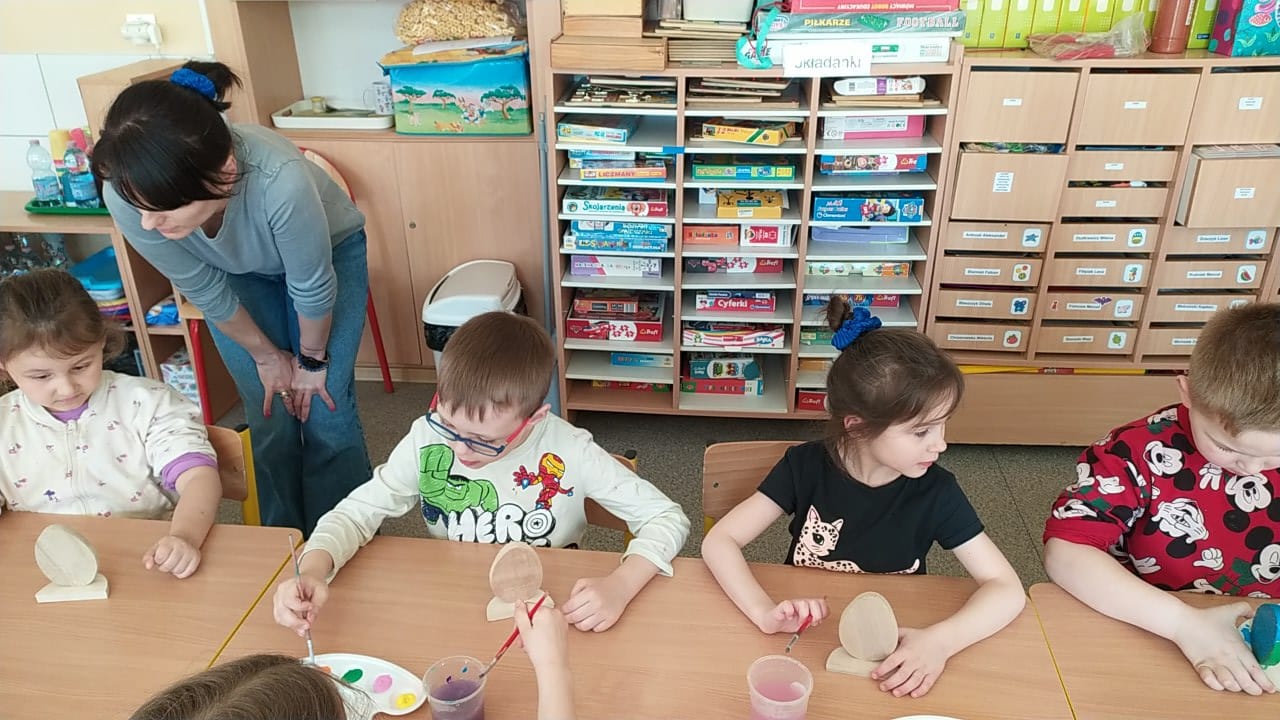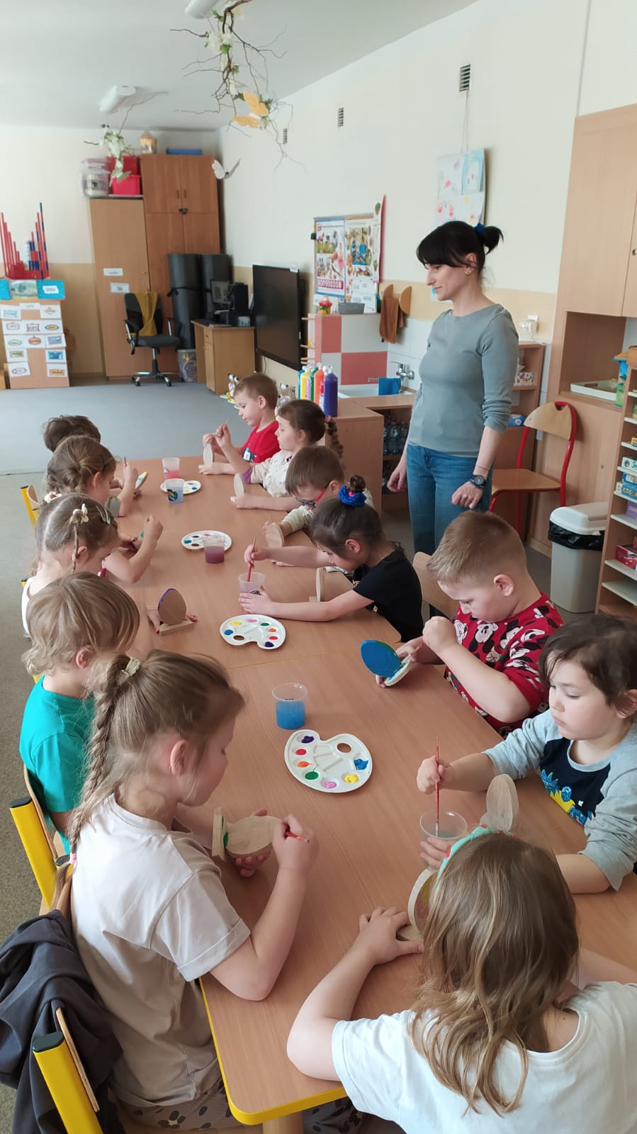 Przed Wielkanocą pani Gawęda, mama naszej koleżanki Mai, zorganizowała dla dzieci bardzo ciekawe zajęcie plastyczne. Zadaniem dzieci było ozdobienie drewnianego jajka przy pomocy farb. Powstałe pisanki dopełniły stroiki wielkanocne i powędrowały do dziecięcych domów. Dziękujemy pani Gawędzie!