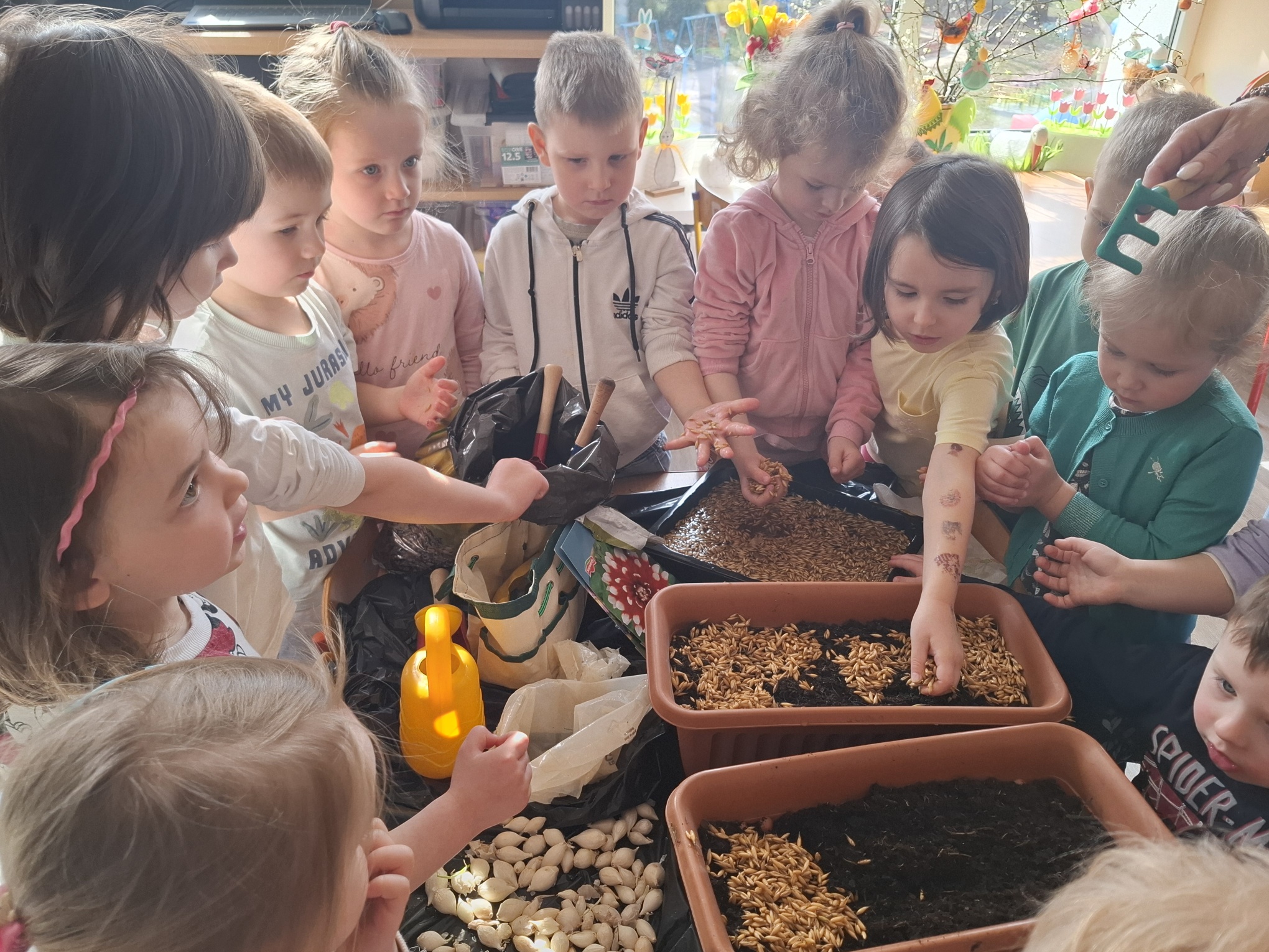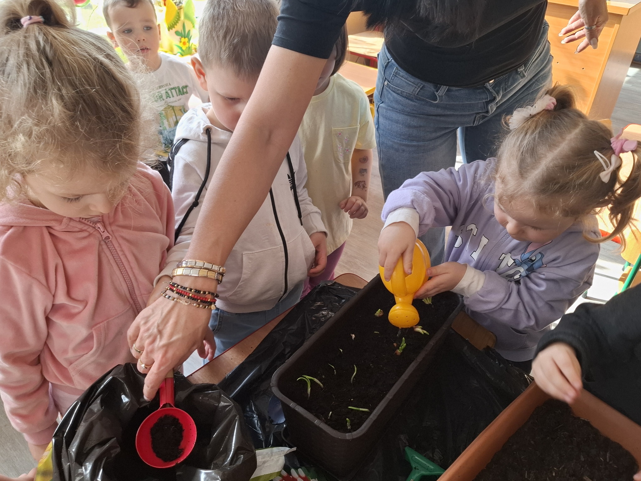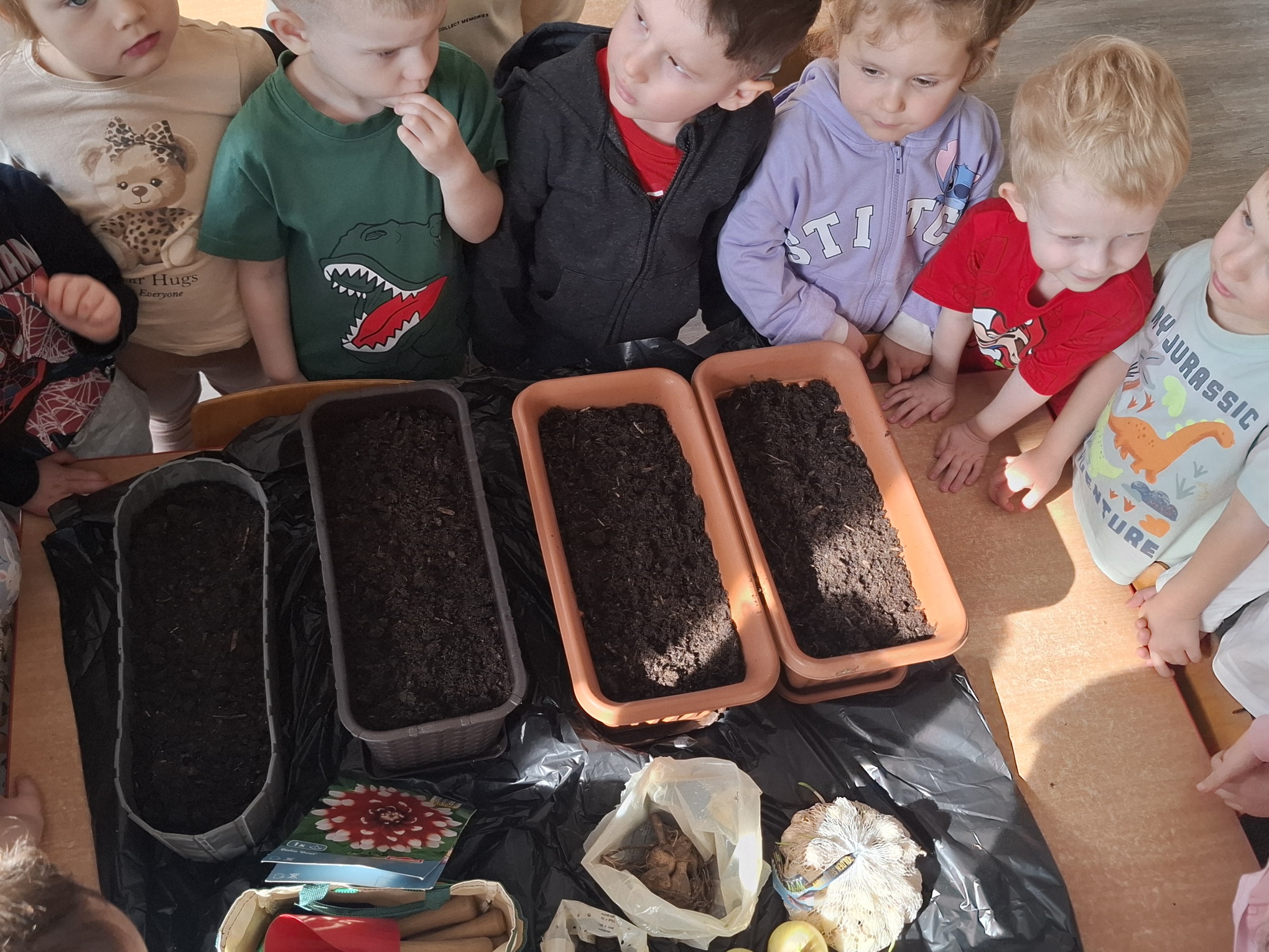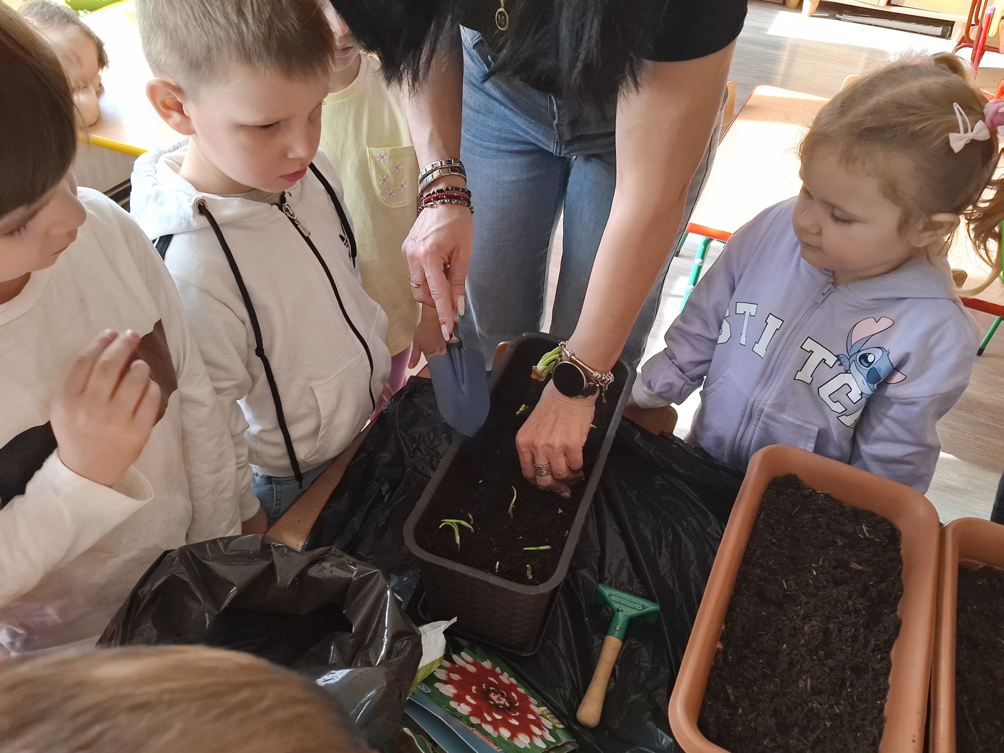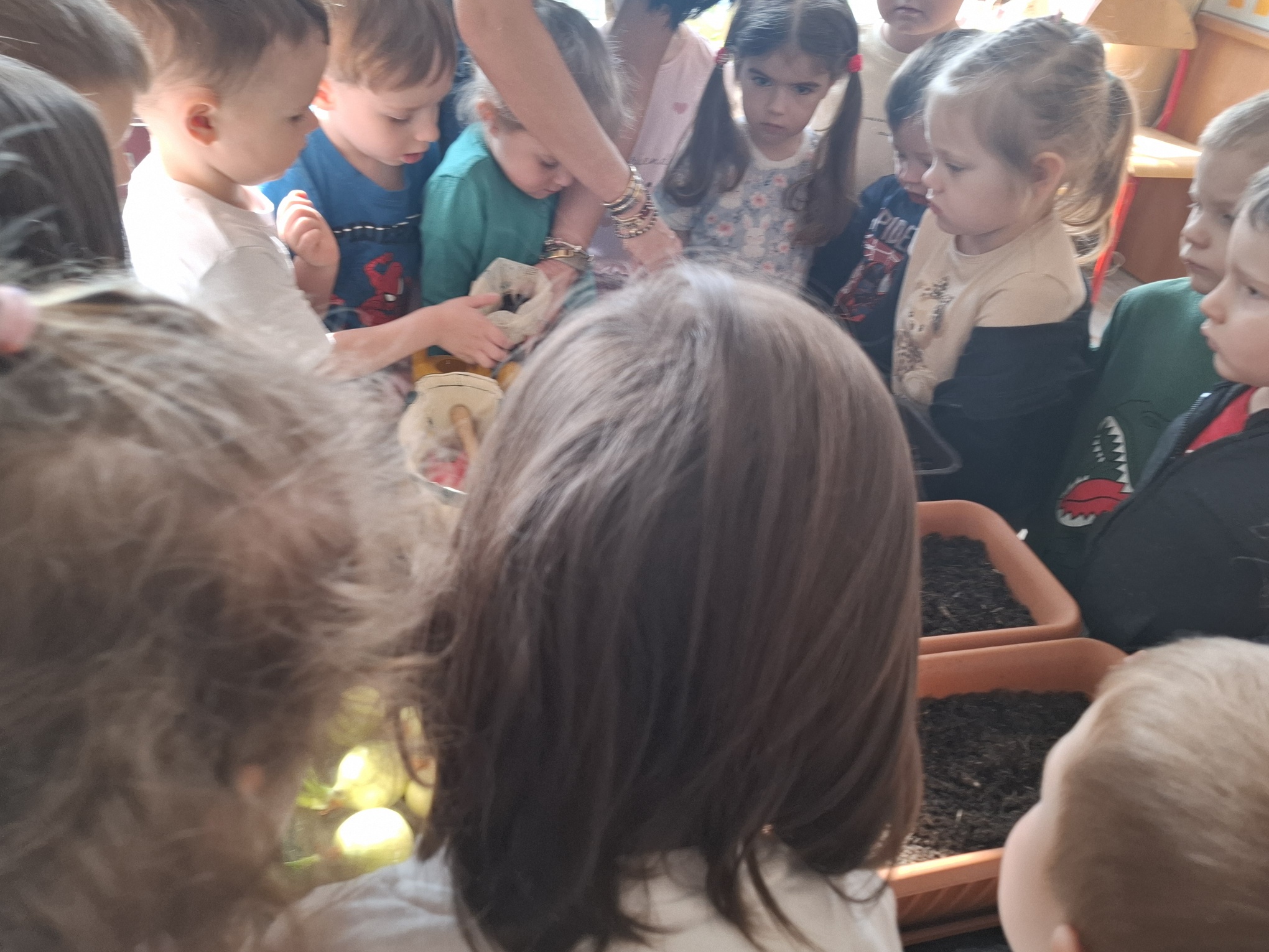 Podczas zajęć nie zabrakło aktywności praktycznych – dzieci siały nasionka, sadziły cebule, obserwowały rośliny oraz uczyły się, jak należy o nie dbać. Wykonywaliśmy także prace plastyczne związane z tematyką ogrodu, rozwijając wyobraźnię i zdolności manualne.