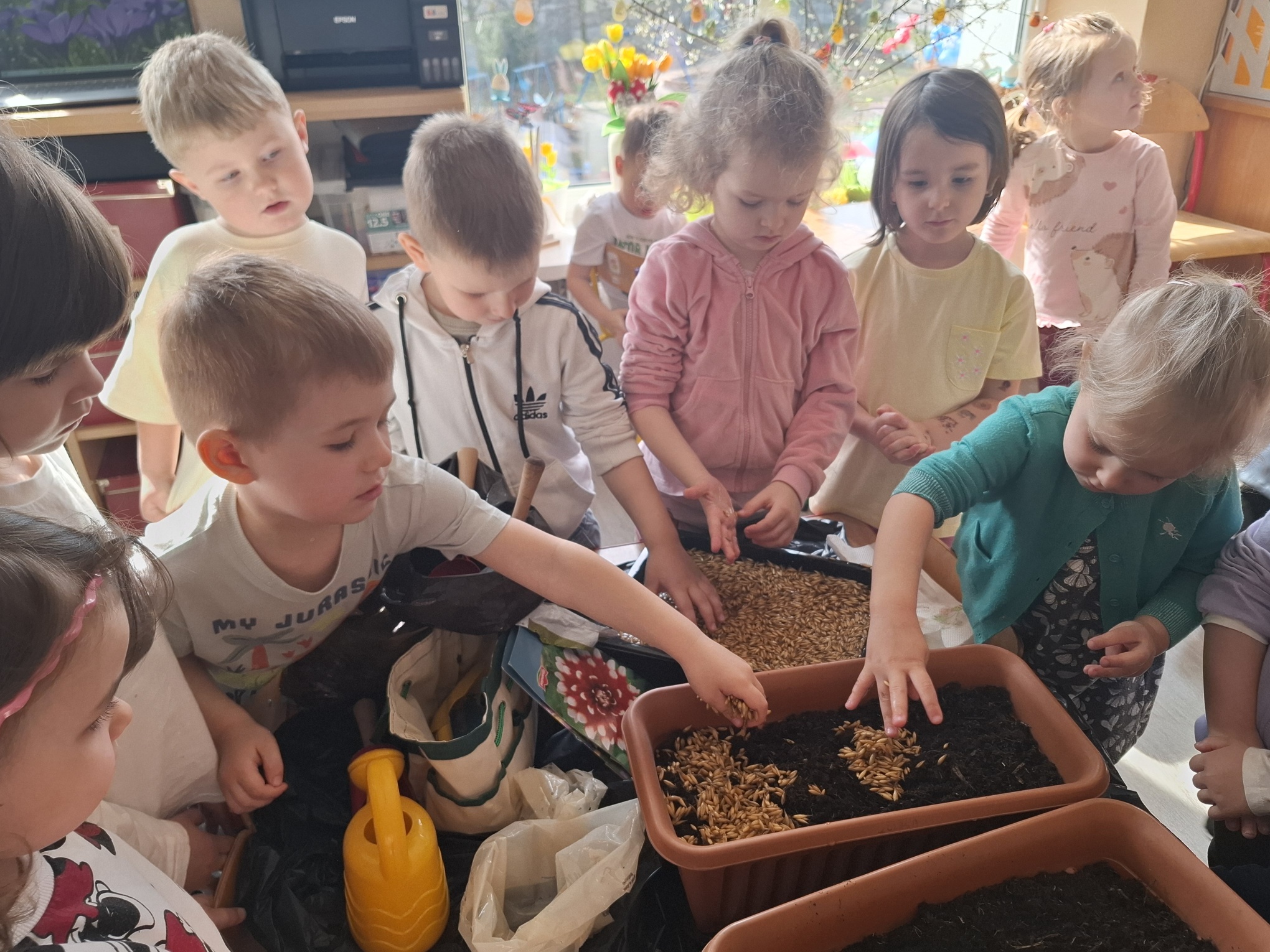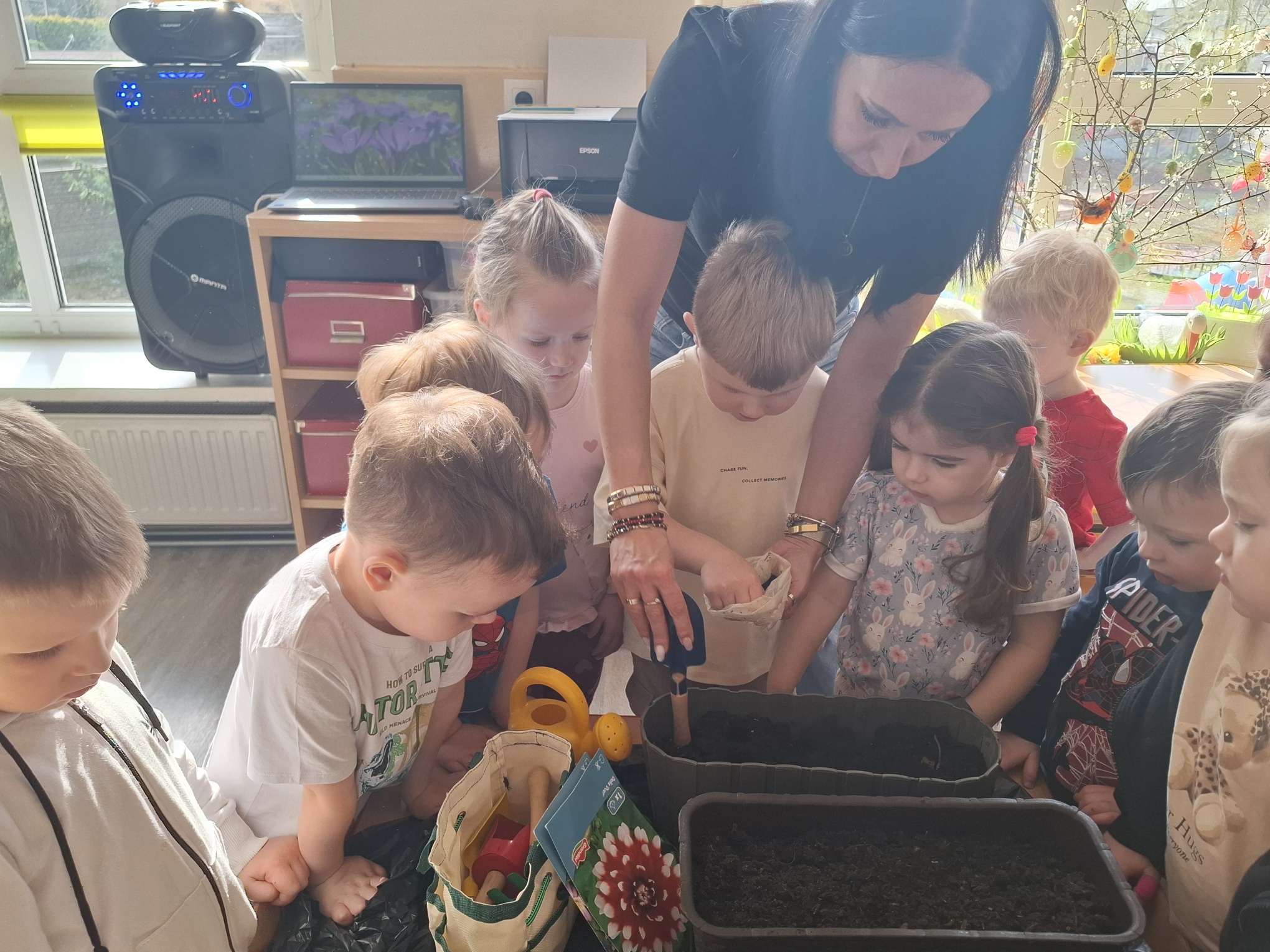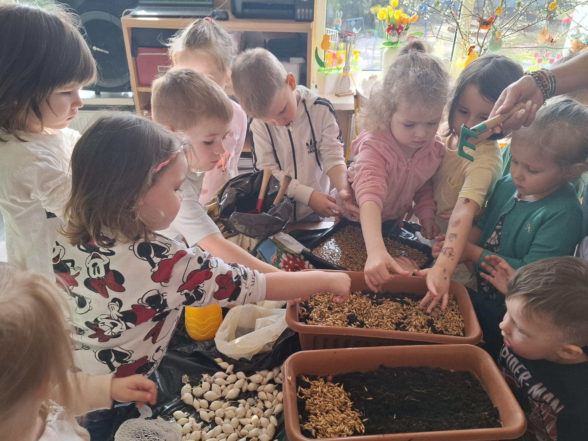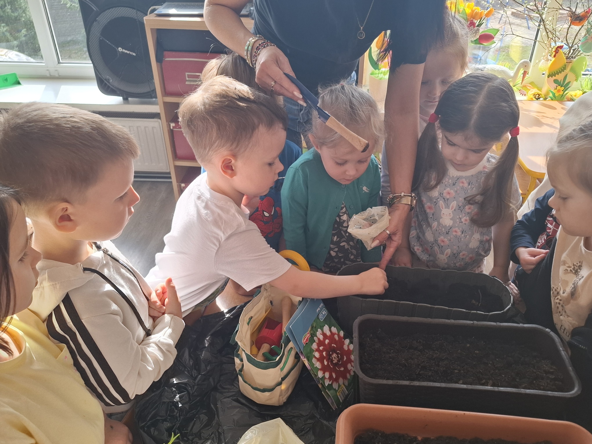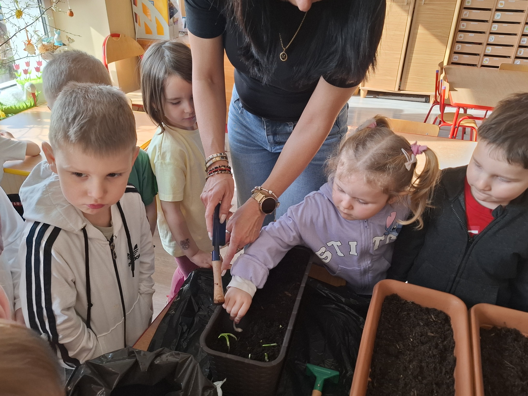 Podczas zajęć nie zabrakło aktywności praktycznych – dzieci siały nasionka, sadziły cebule, obserwowały rośliny oraz uczyły się, jak należy o nie dbać. Wykonywaliśmy także prace plastyczne związane z tematyką ogrodu, rozwijając wyobraźnię i zdolności manualne.