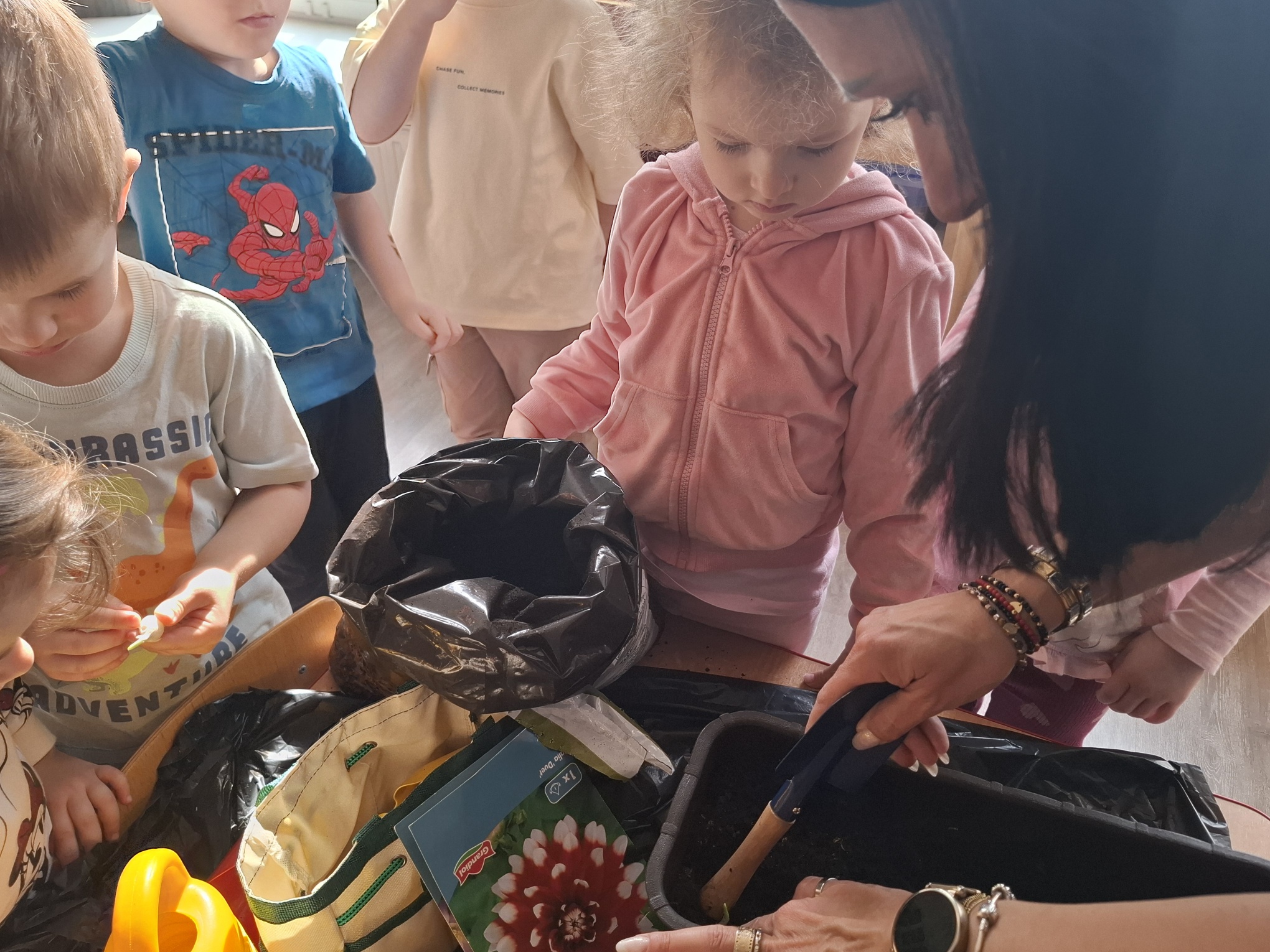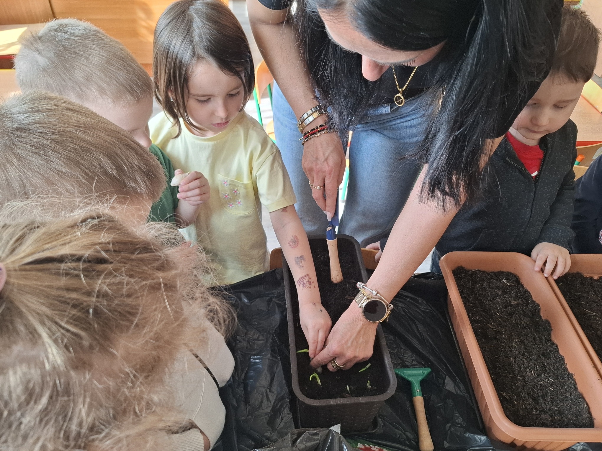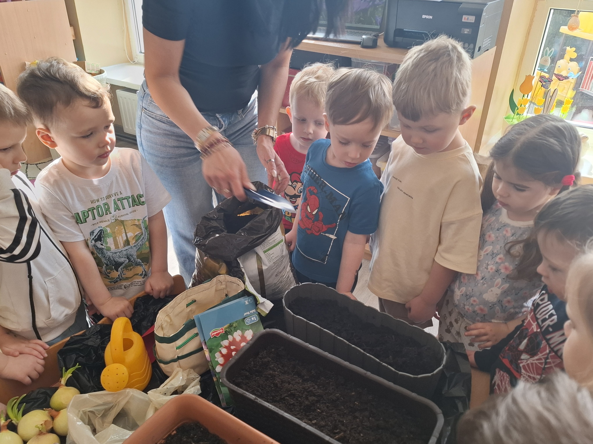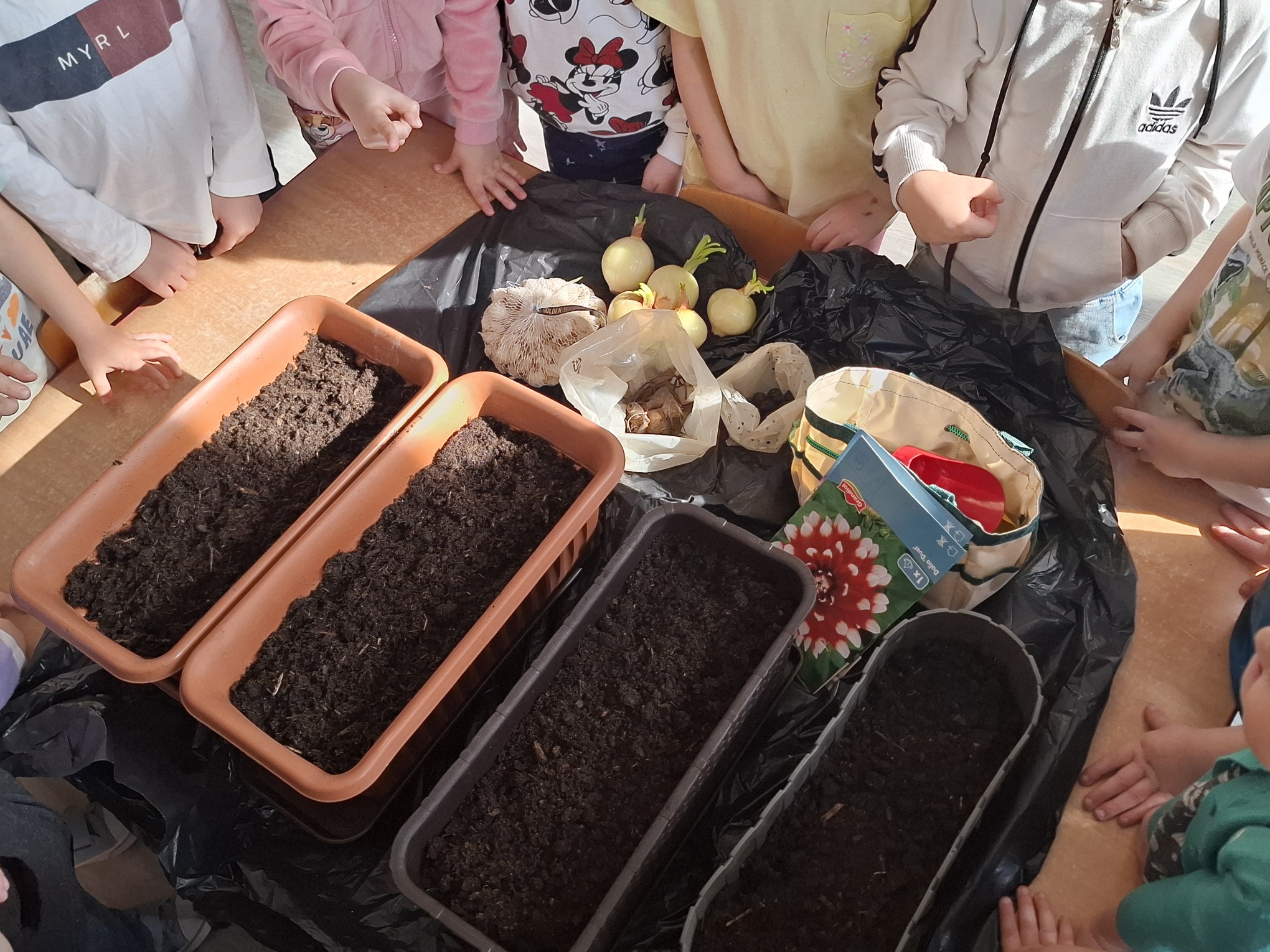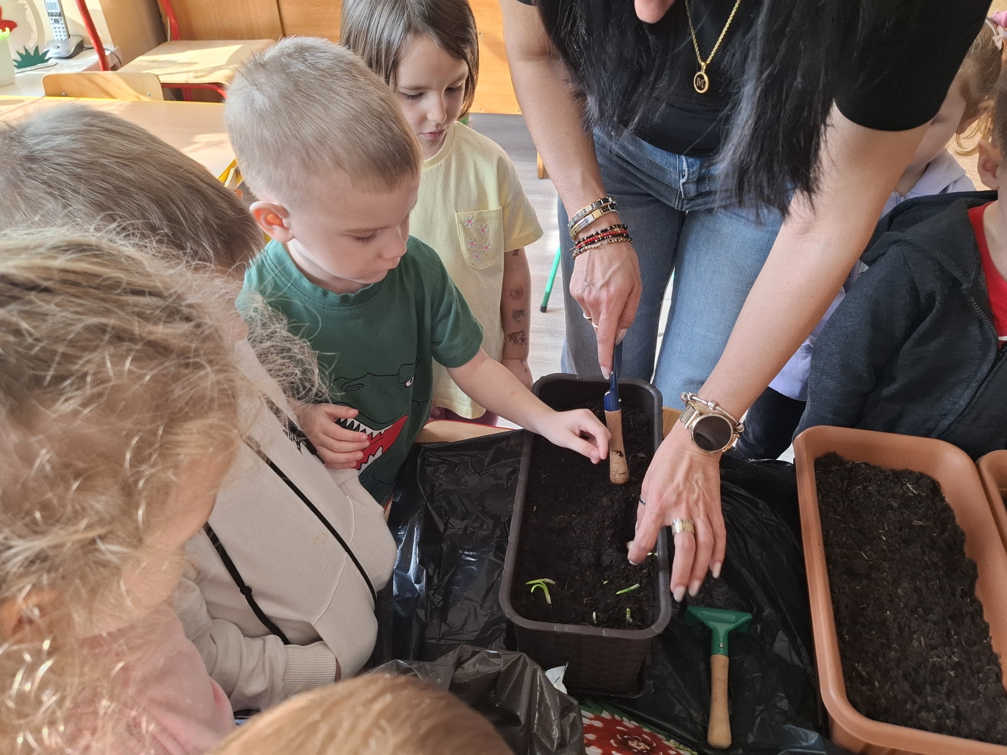Podczas zajęć nie zabrakło aktywności praktycznych – dzieci siały nasionka, sadziły cebule, obserwowały rośliny oraz uczyły się, jak należy o nie dbać. Wykonywaliśmy także prace plastyczne związane z tematyką ogrodu, rozwijając wyobraźnię i zdolności manualne.