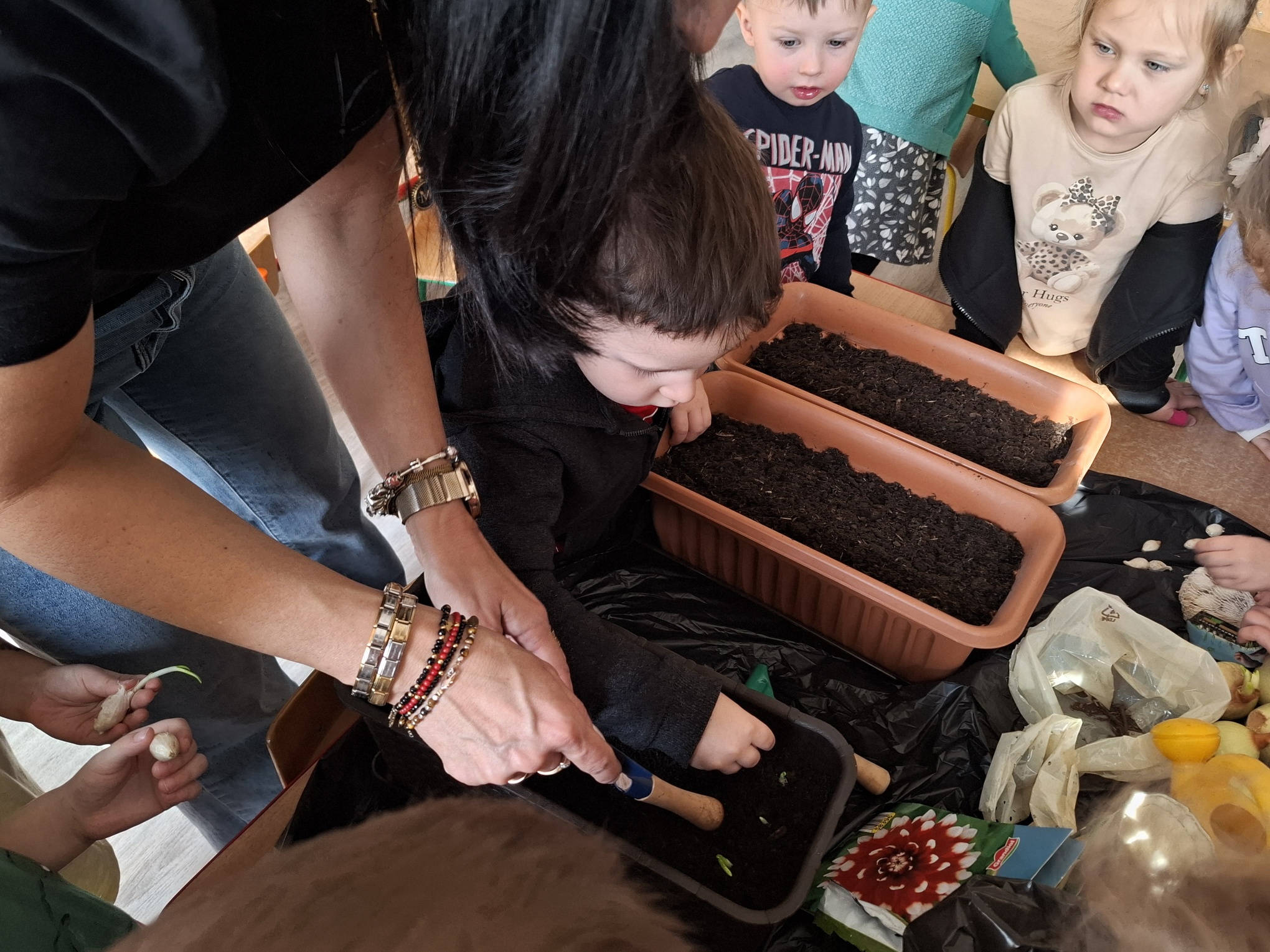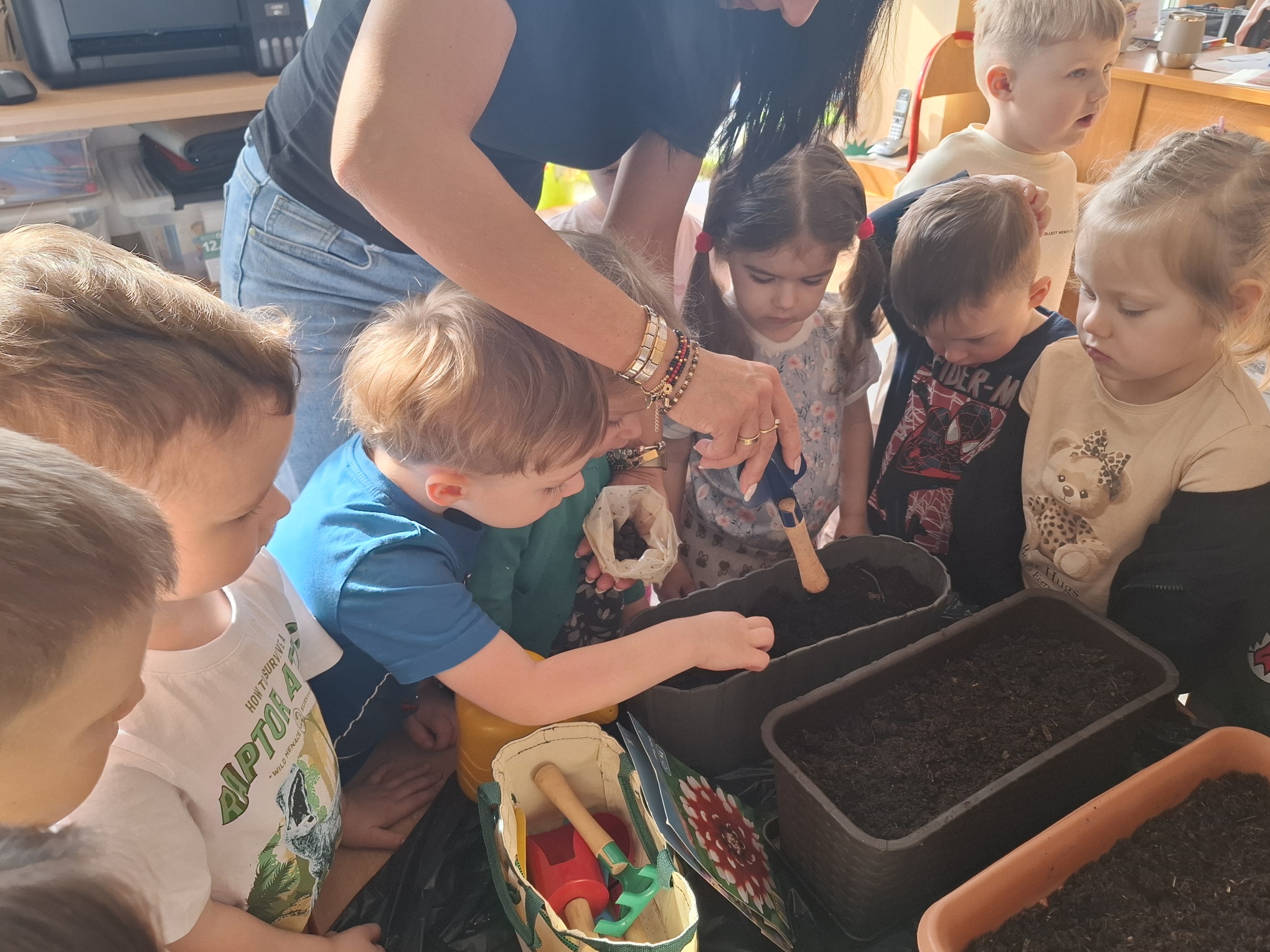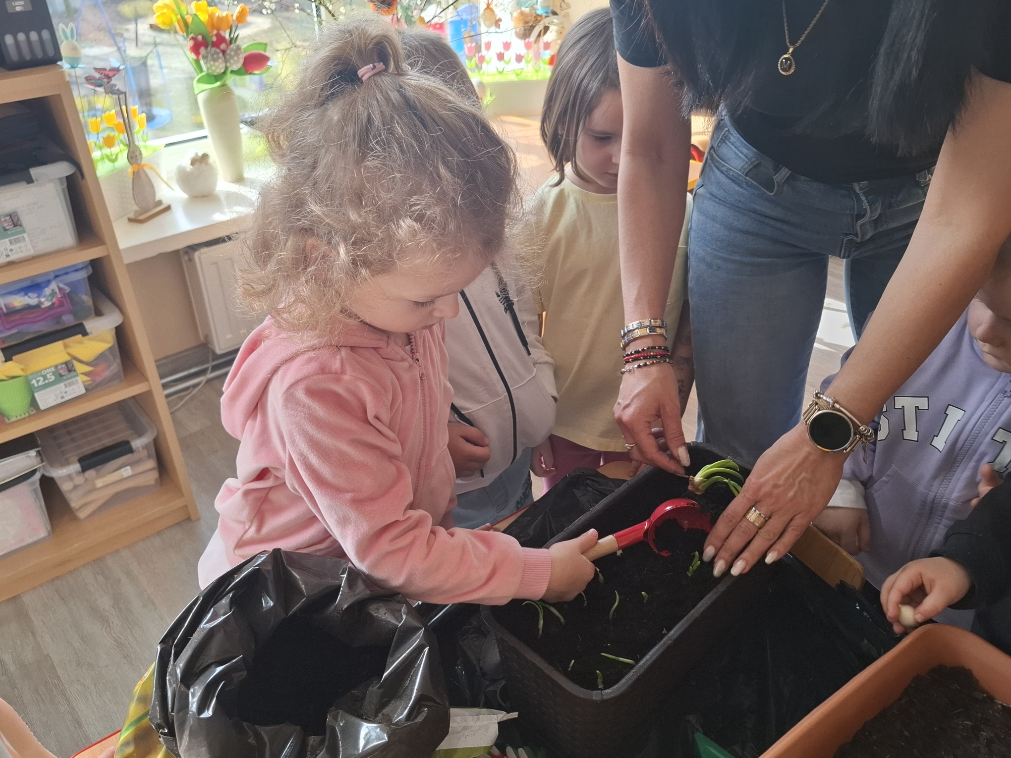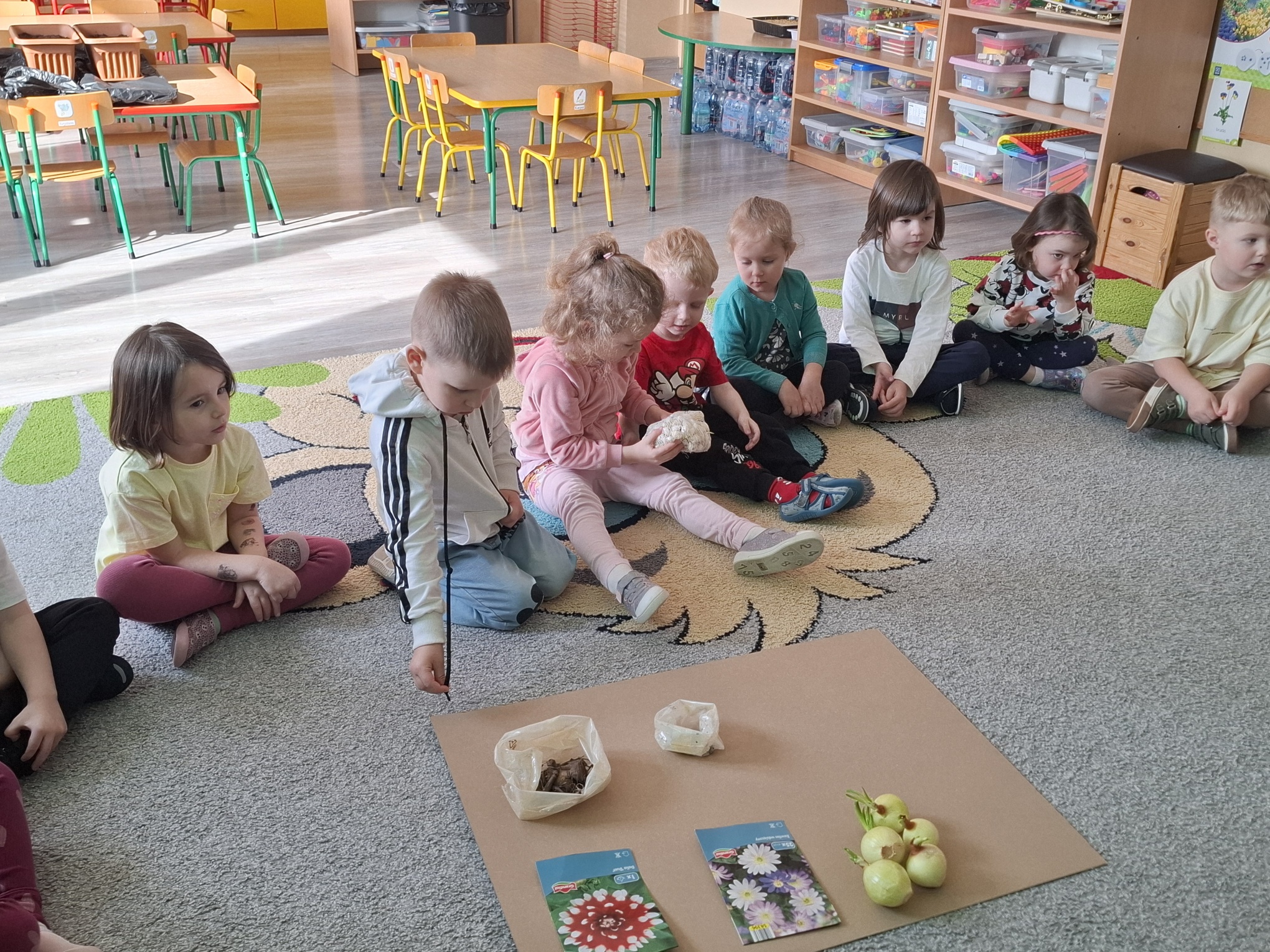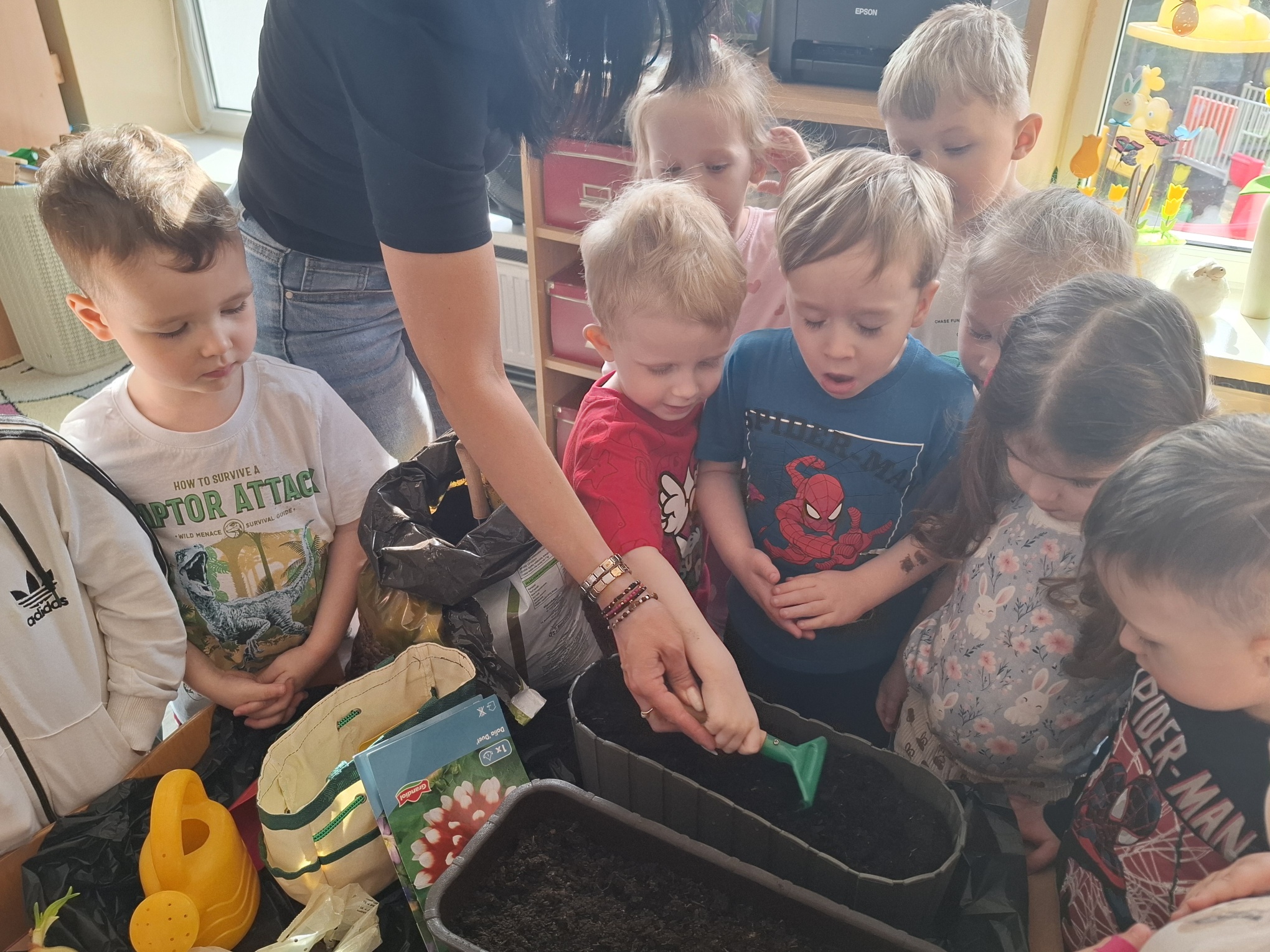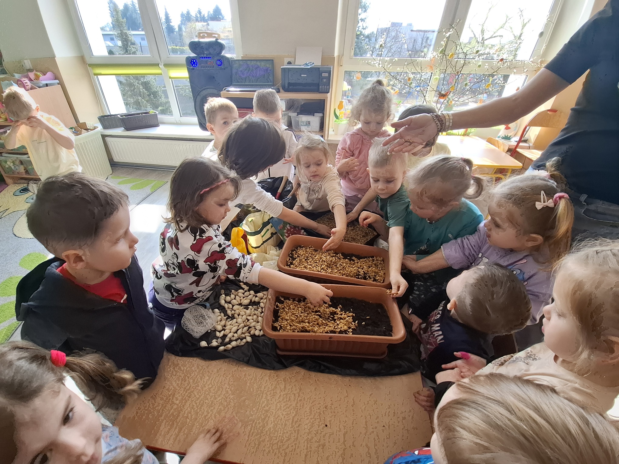 Podczas zajęć nie zabrakło aktywności praktycznych – dzieci siały nasionka, sadziły cebule, obserwowały rośliny oraz uczyły się, jak należy o nie dbać. Wykonywaliśmy także prace plastyczne związane z tematyką ogrodu, rozwijając wyobraźnię i zdolności manualne.