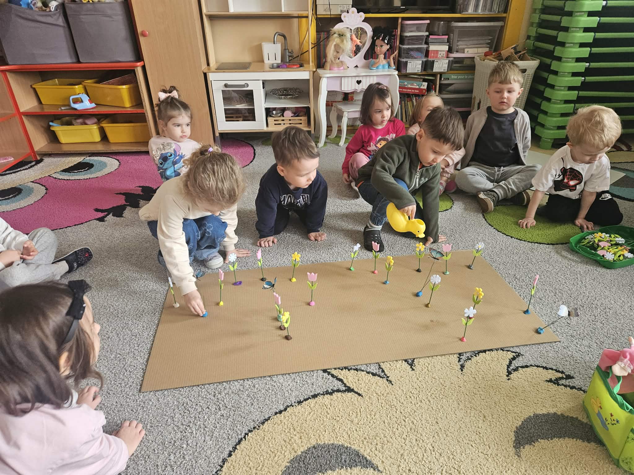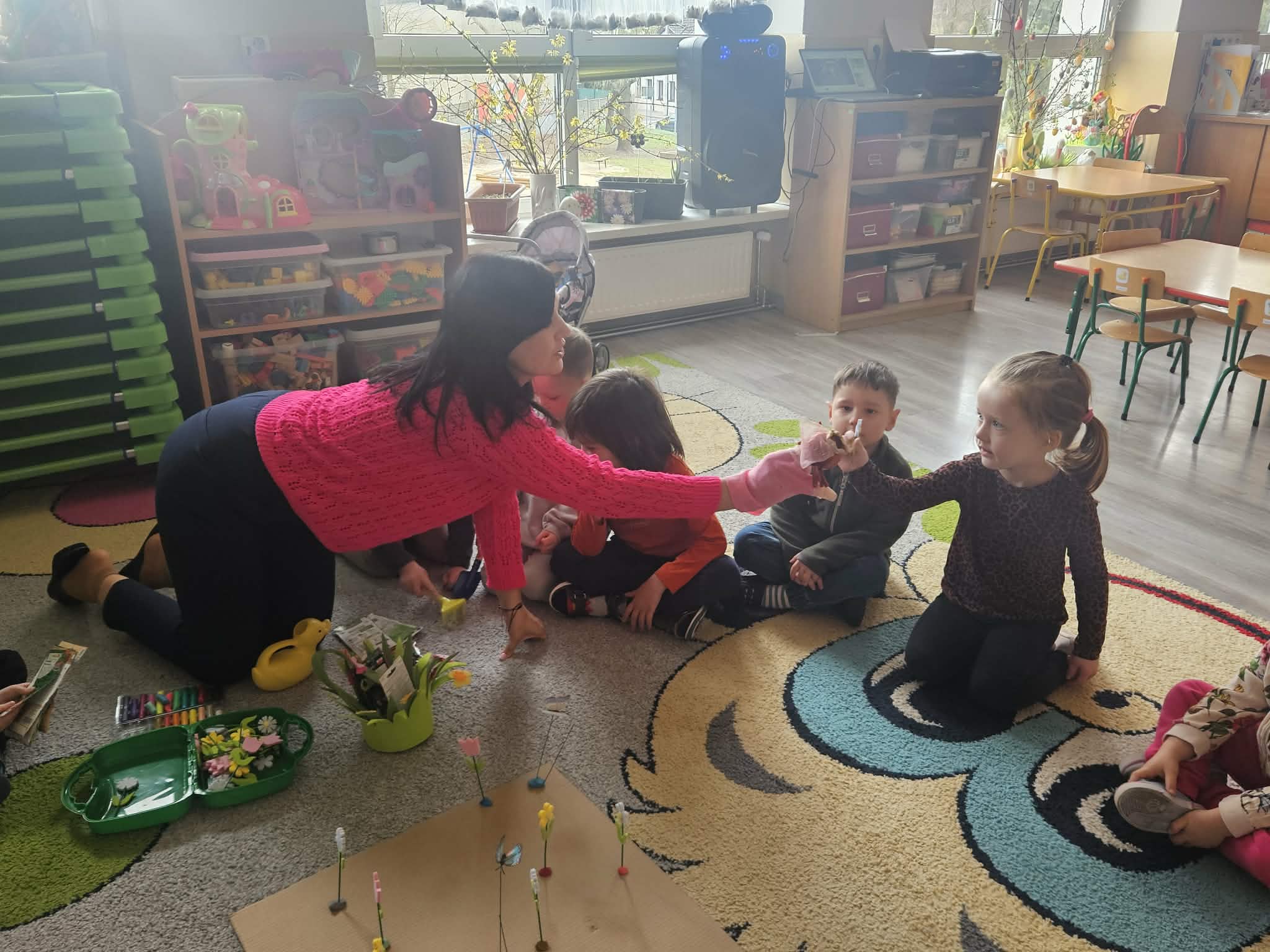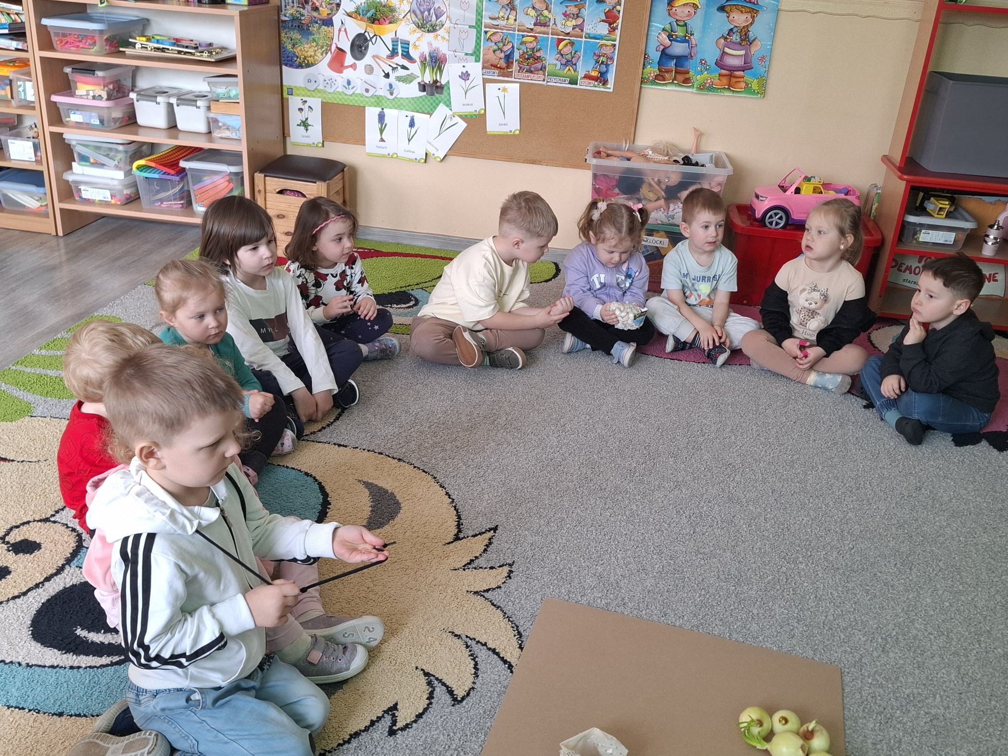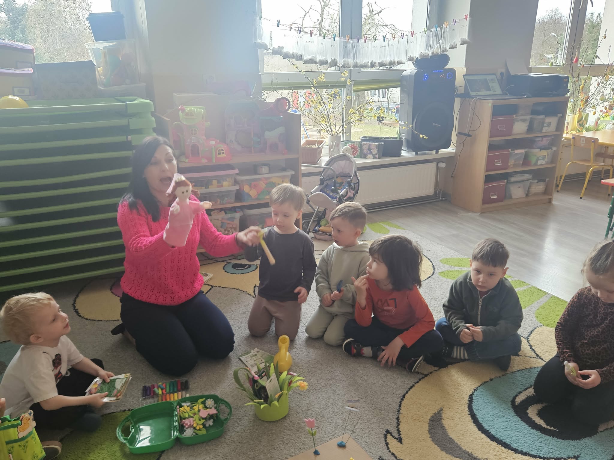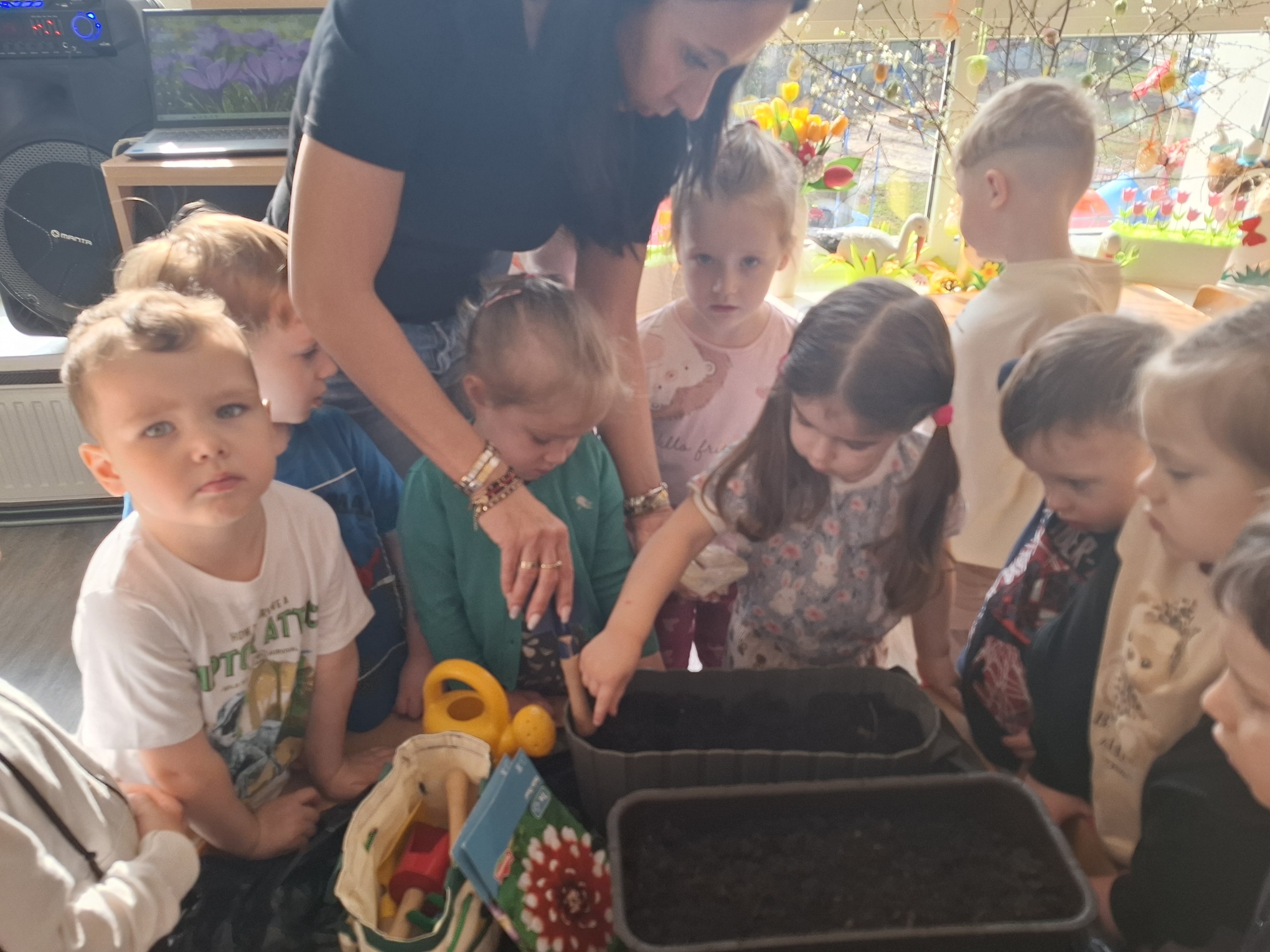 Dzieci poznawały podstawowe prace ogrodowe wykonywane wiosną – sadzenie roślin, podlewanie, grabienie oraz dbanie o porządek w ogrodzie. Rozmawialiśmy o tym, czego rośliny potrzebują do wzrostu oraz jakie narzędzia są wykorzystywane w pracy ogrodnika.