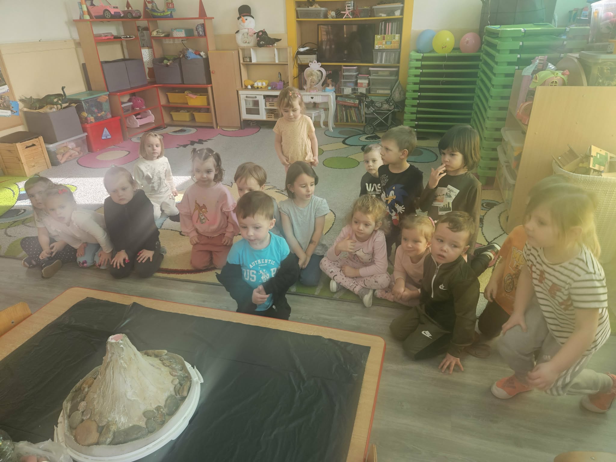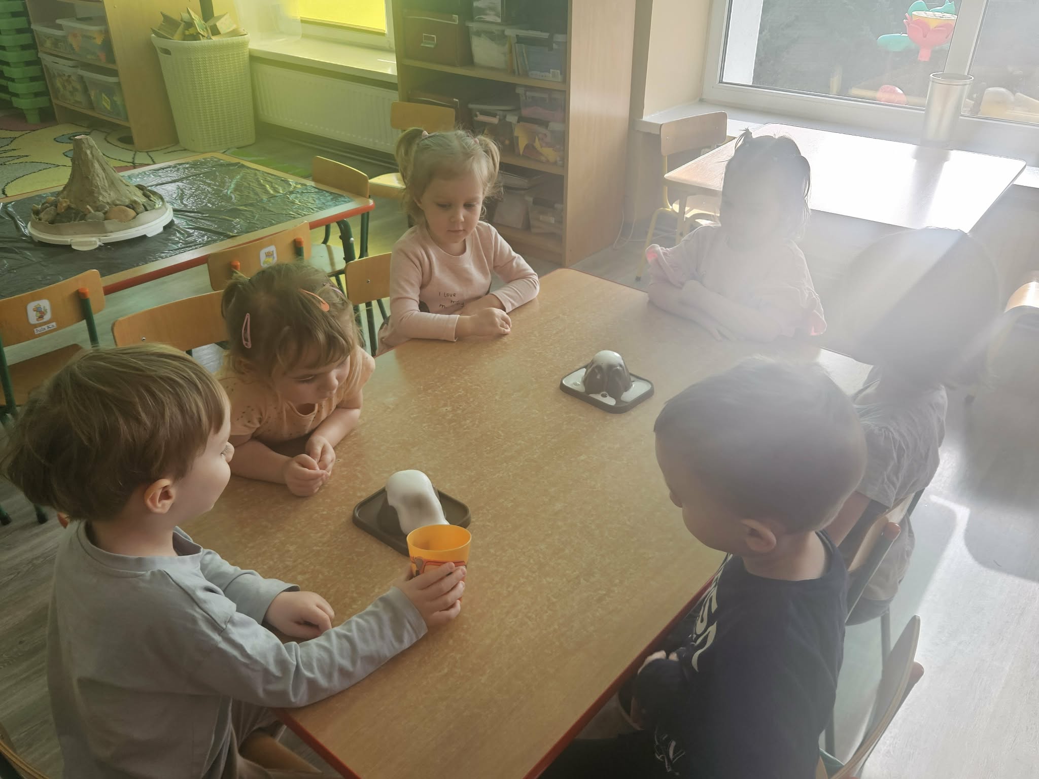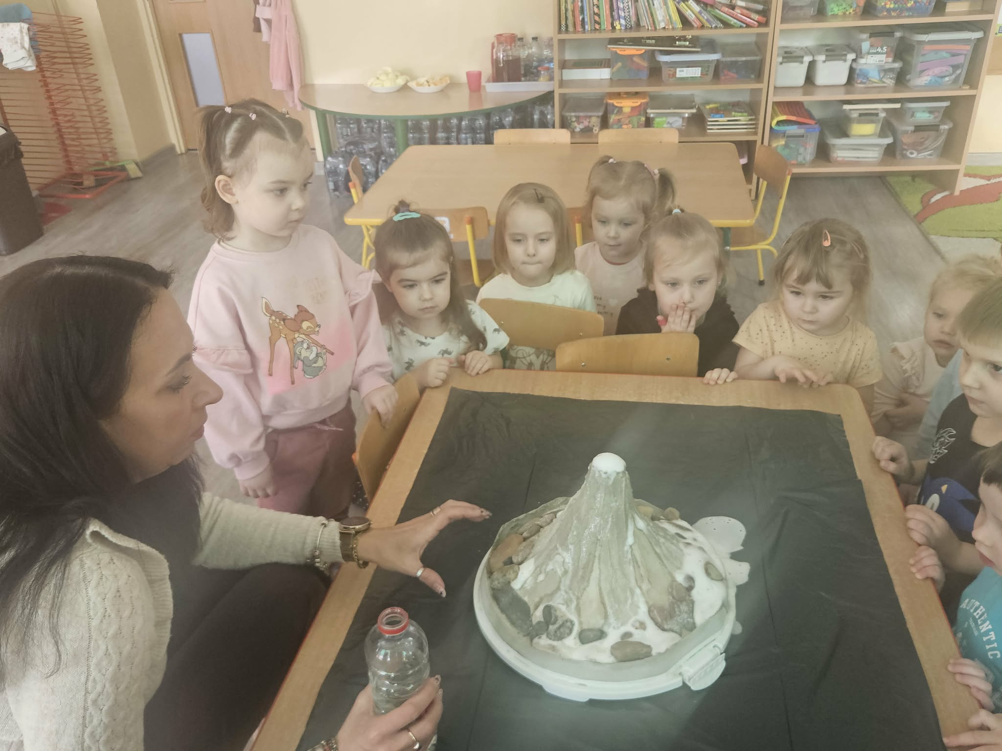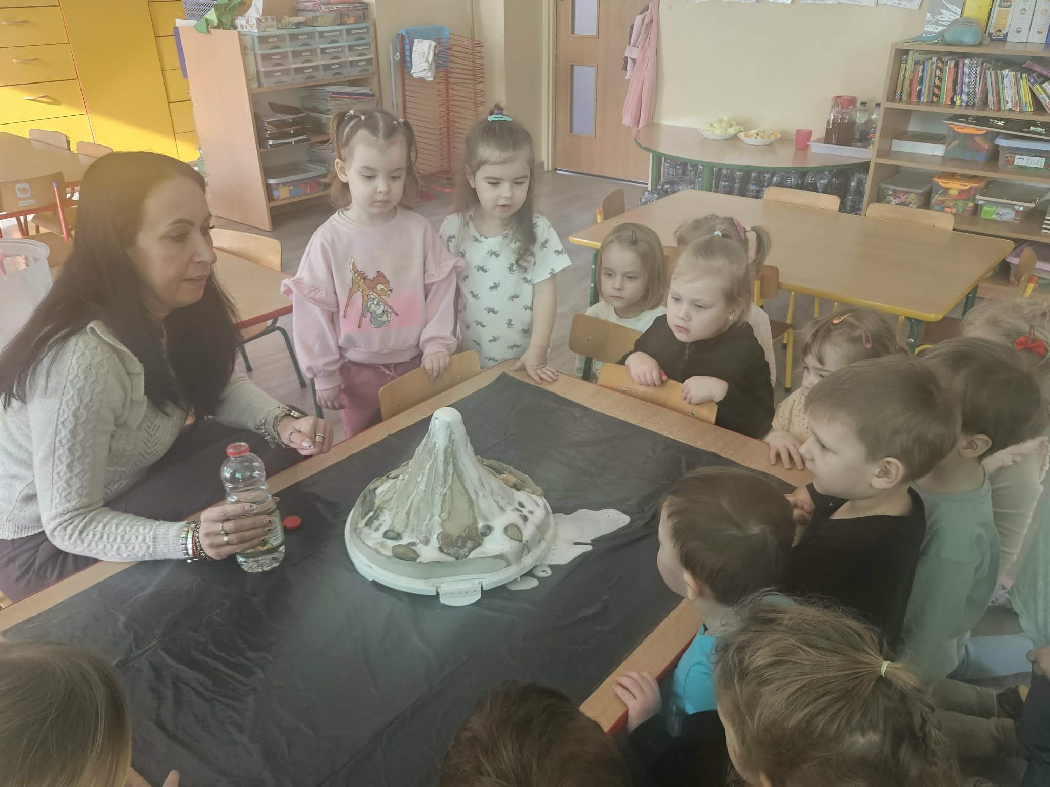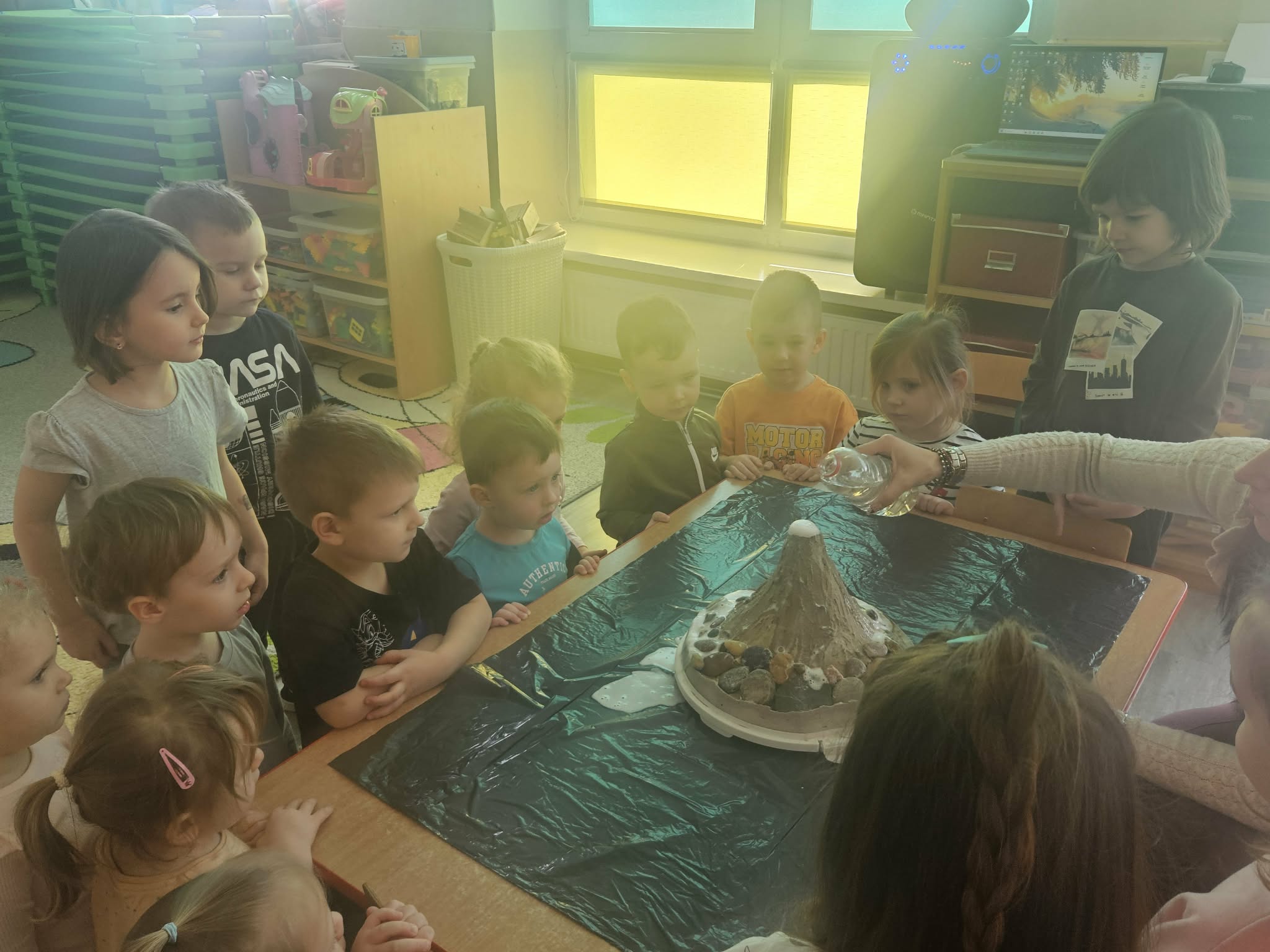 Dzieci poznały także zjawisko wybuchu wulkanu. Dowiedziały się, czym jest lawa, dym i popiół oraz jak powstają wulkany. Temat wzbudził duże zainteresowanie i wiele ciekawych pytań. Dzieciaczki same wywoływały wybuch wulkanu.