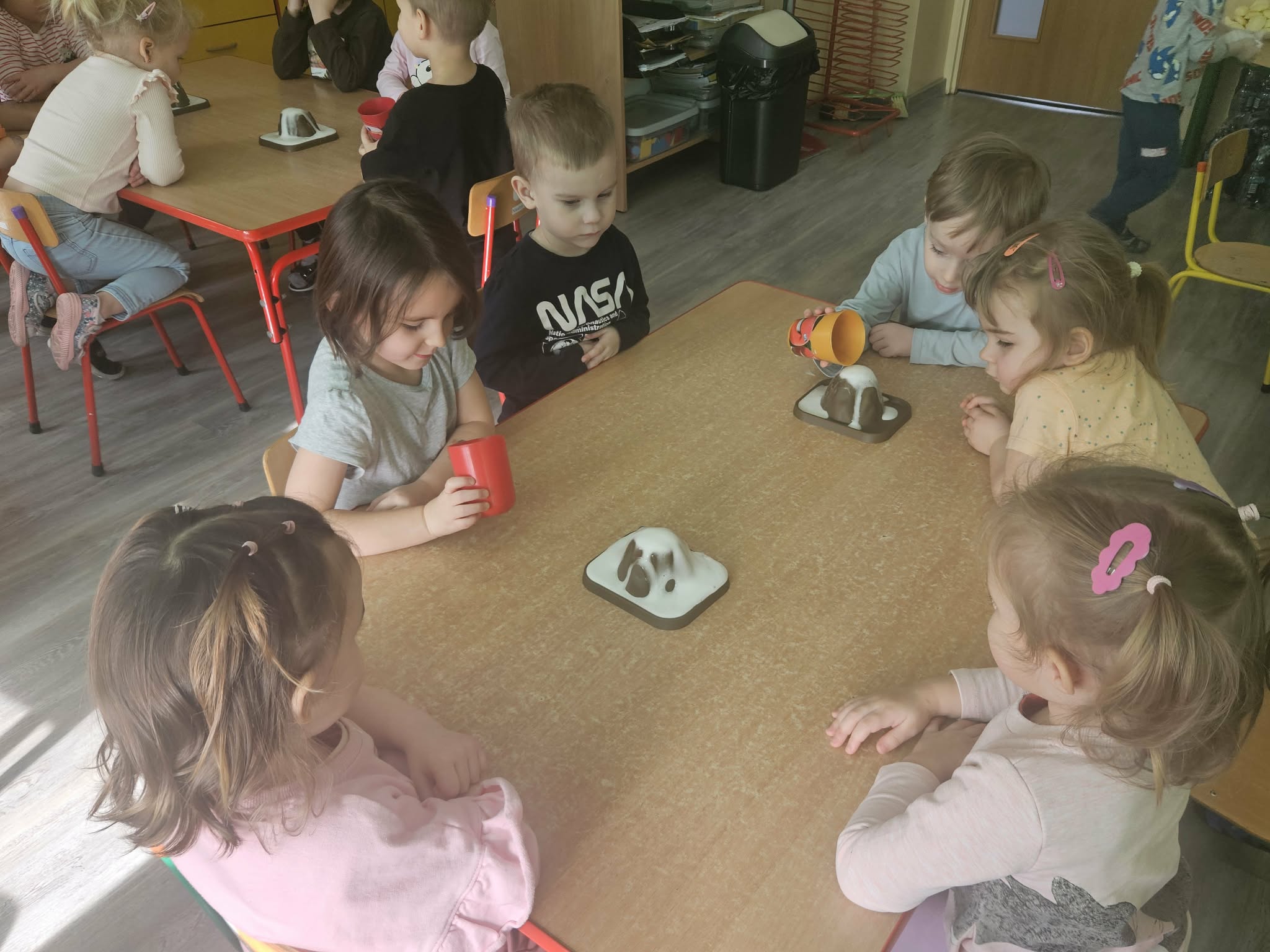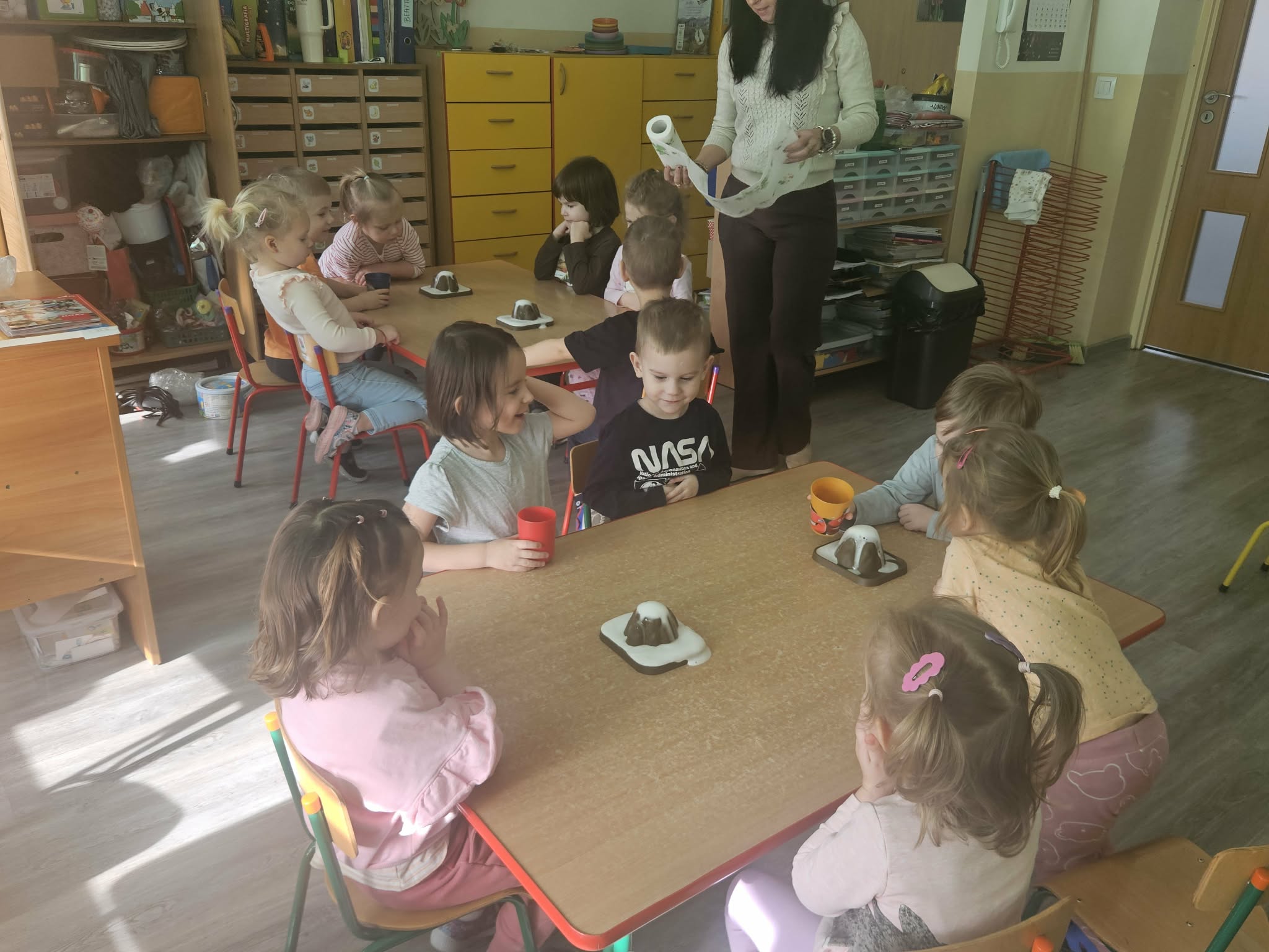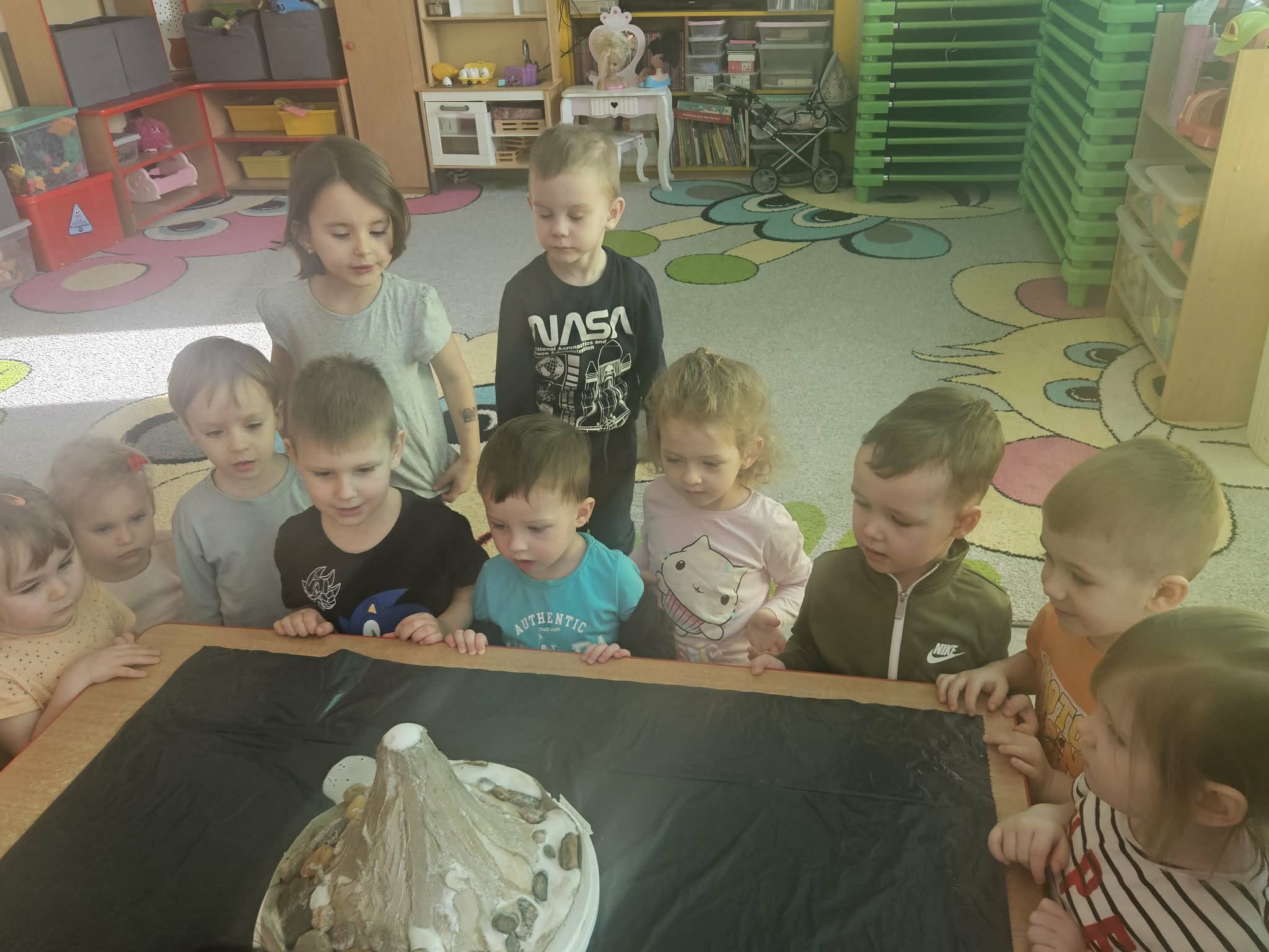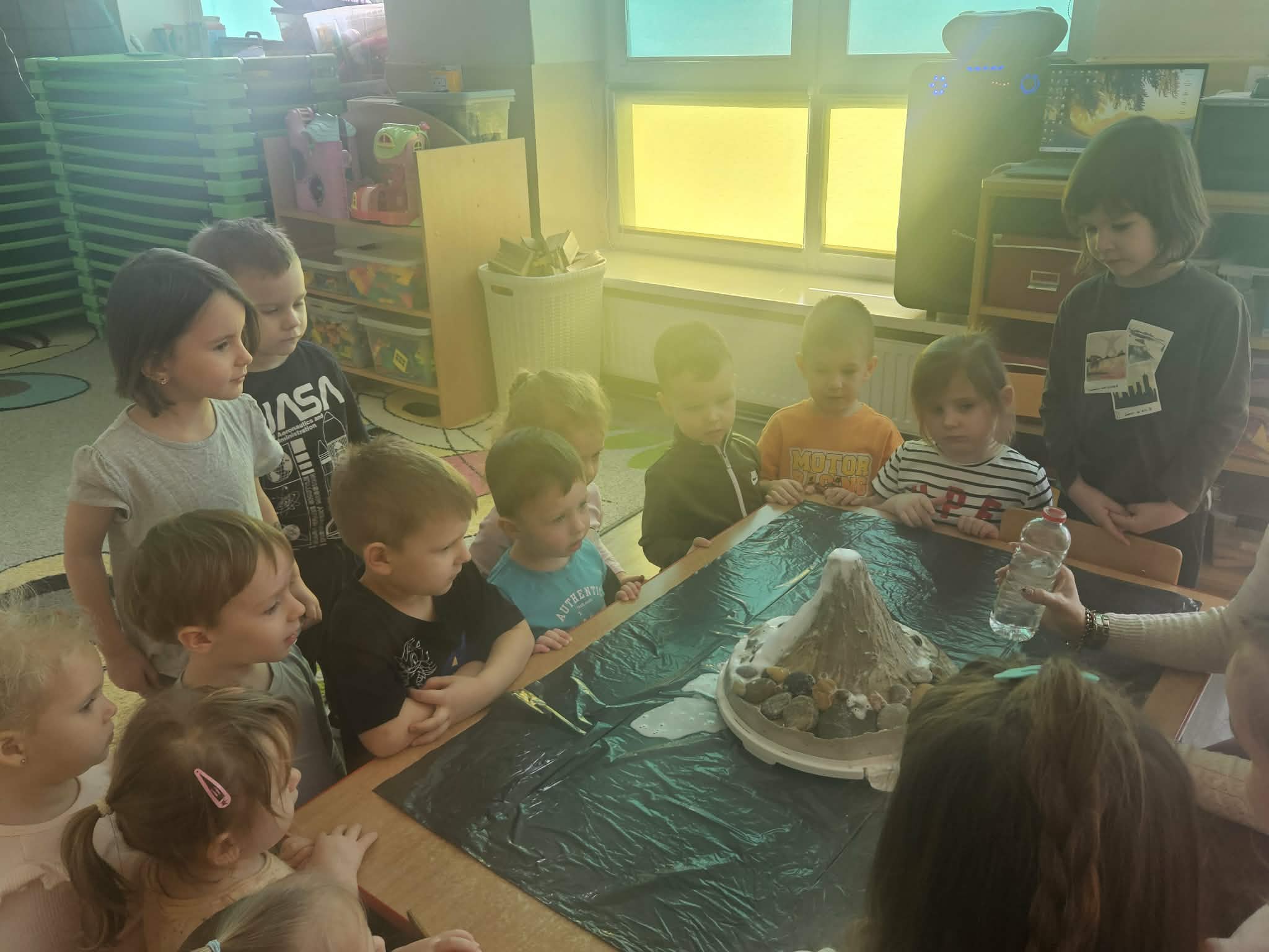 Dzieci poznały także zjawisko wybuchu wulkanu. Dowiedziały się, czym jest lawa, dym i popiół oraz jak powstają wulkany. Temat wzbudził duże zainteresowanie i wiele ciekawych pytań. Dzieciaczki same wywoływały wybuch wulkanu.