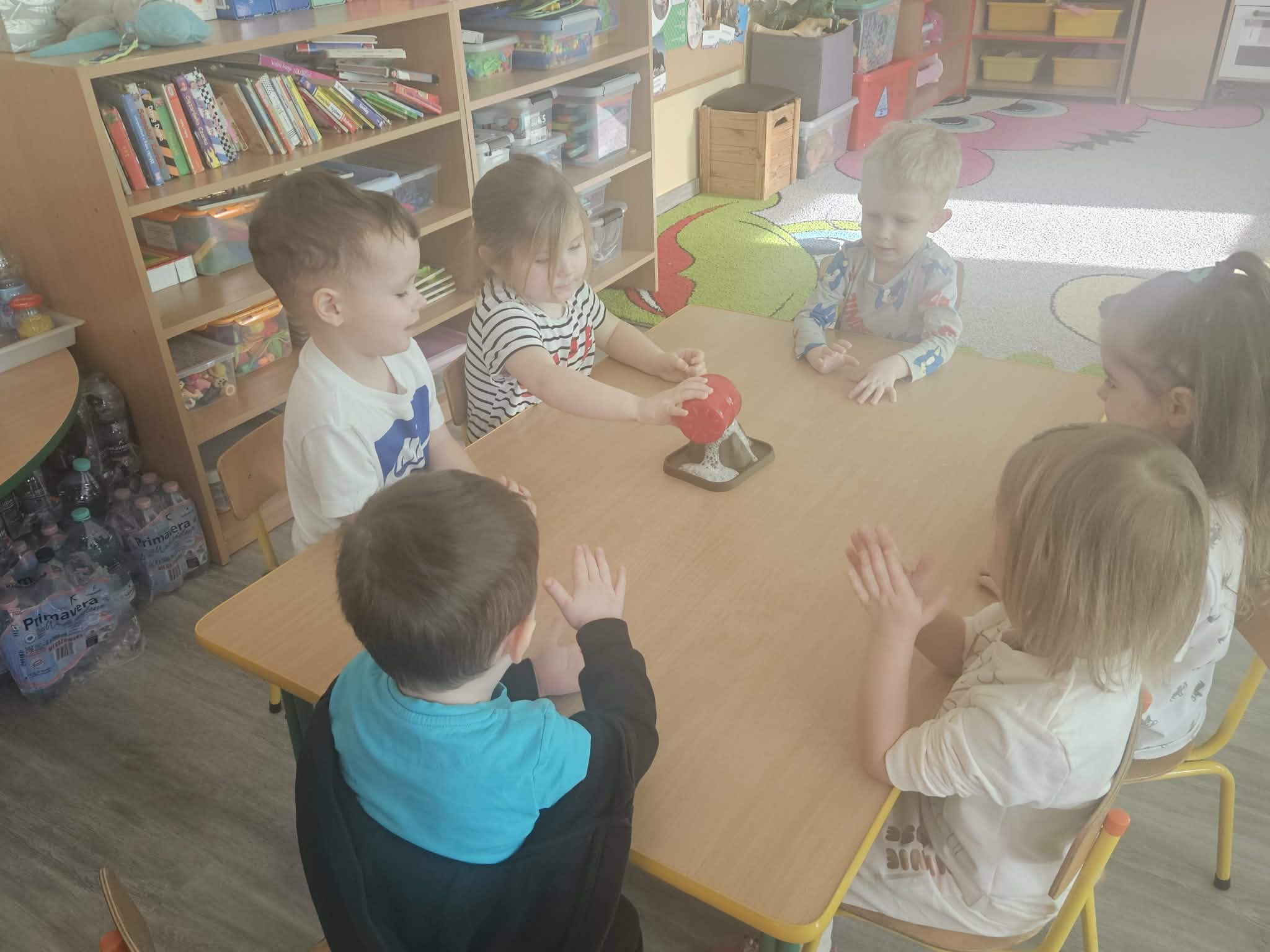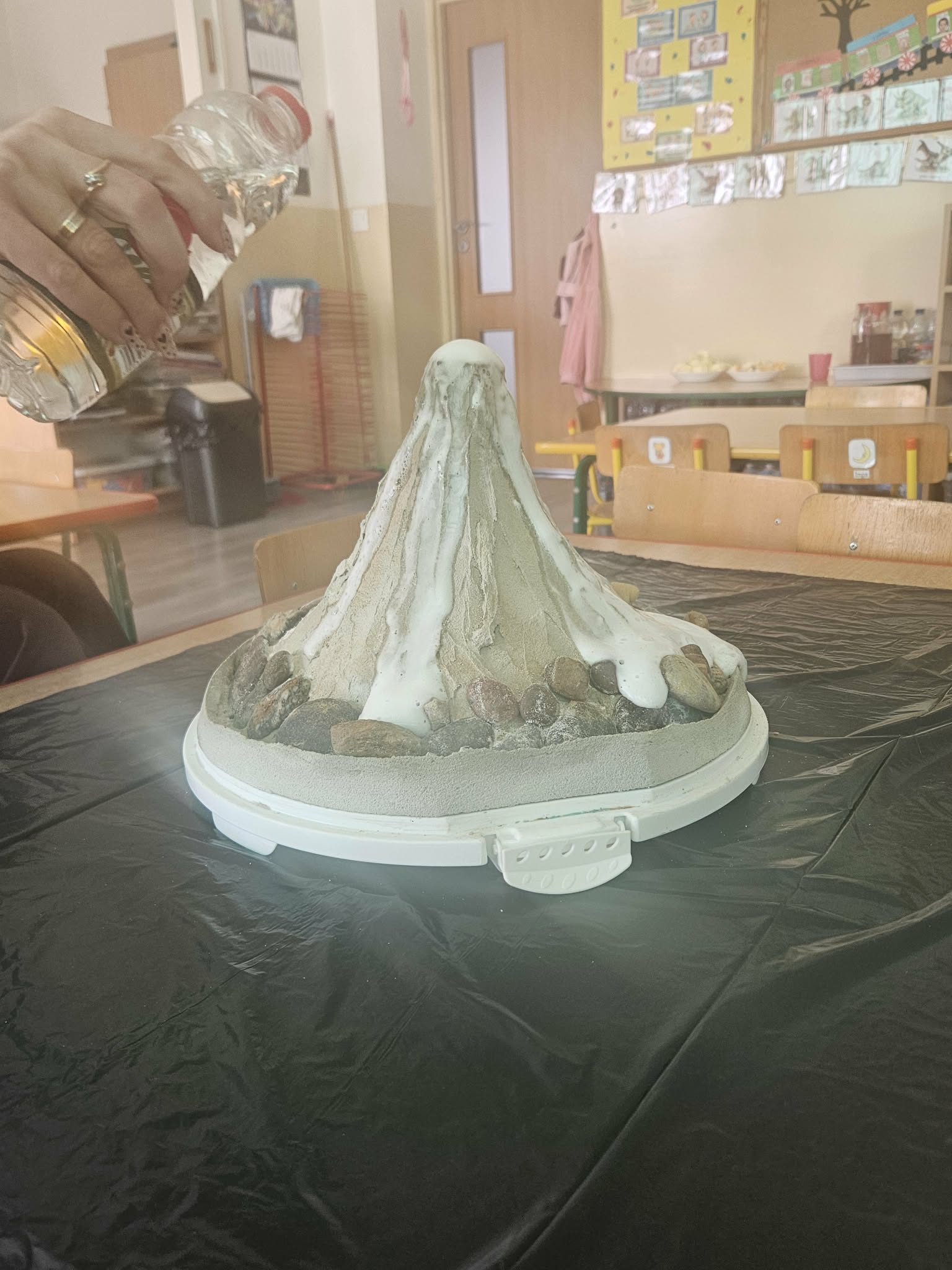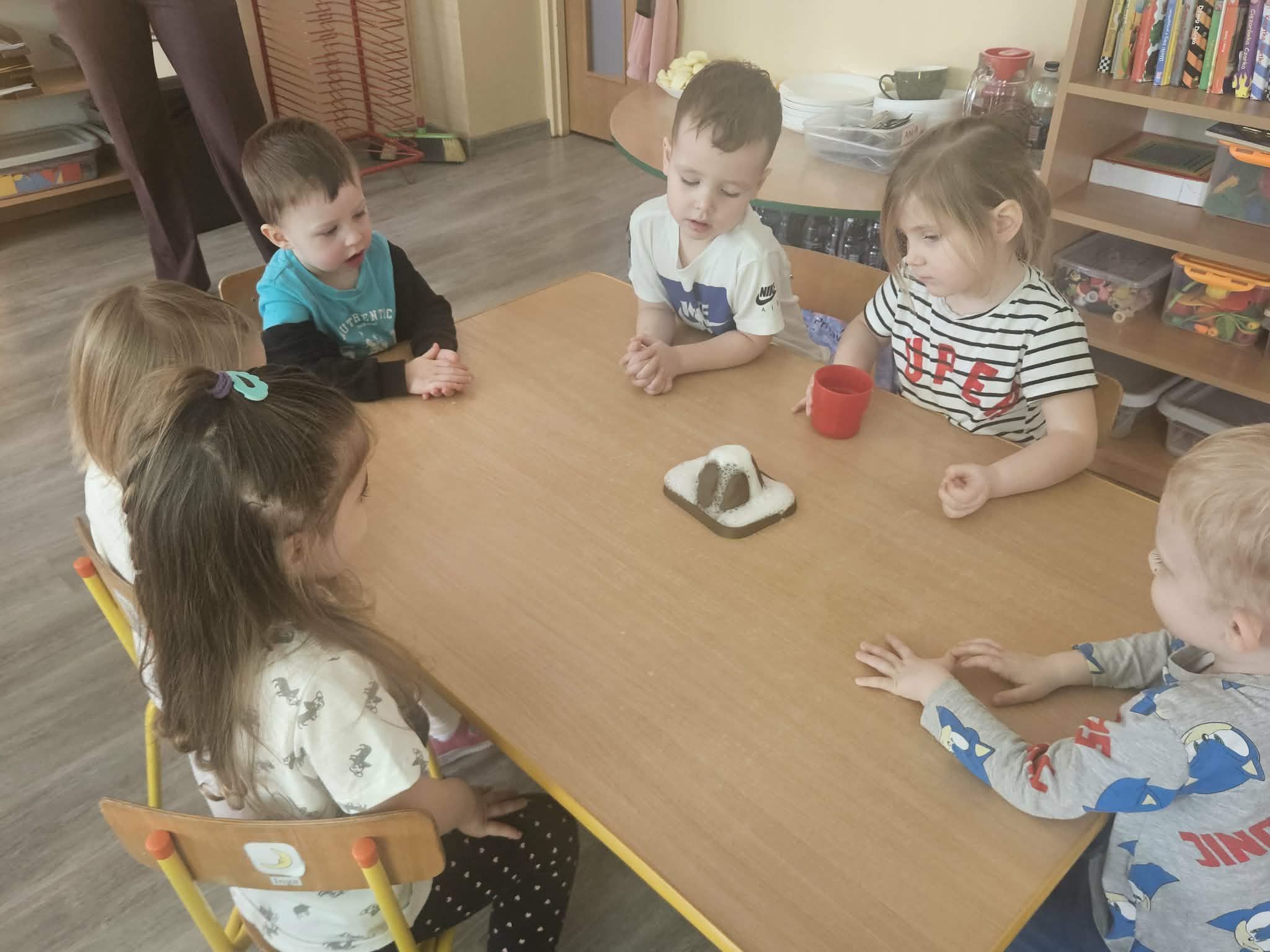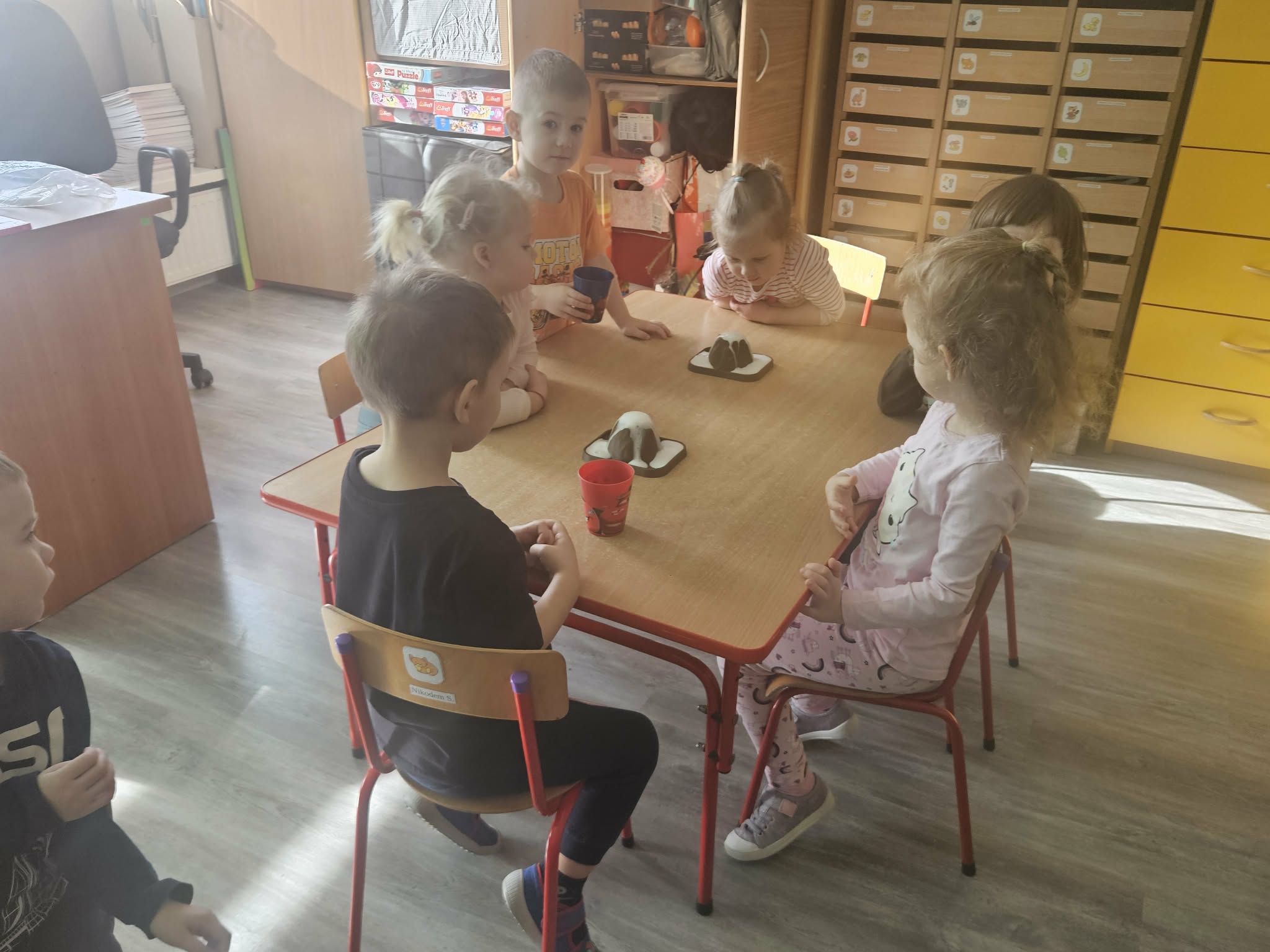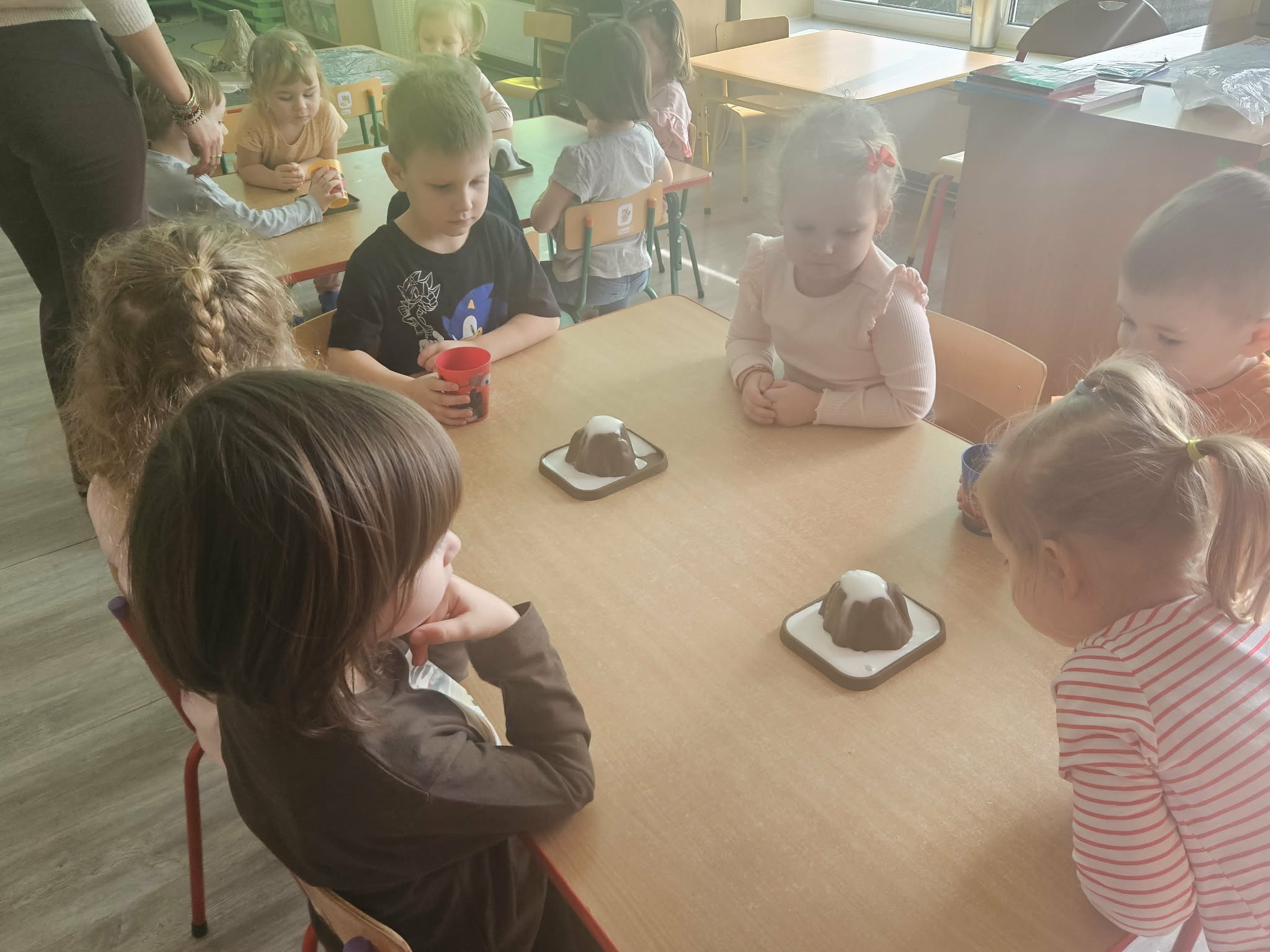 Dzieci poznały także zjawisko wybuchu wulkanu. Dowiedziały się, czym jest lawa, dym i popiół oraz jak powstają wulkany. Temat wzbudził duże zainteresowanie i wiele ciekawych pytań. Dzieciaczki same wywoływały wybuch wulkanu.