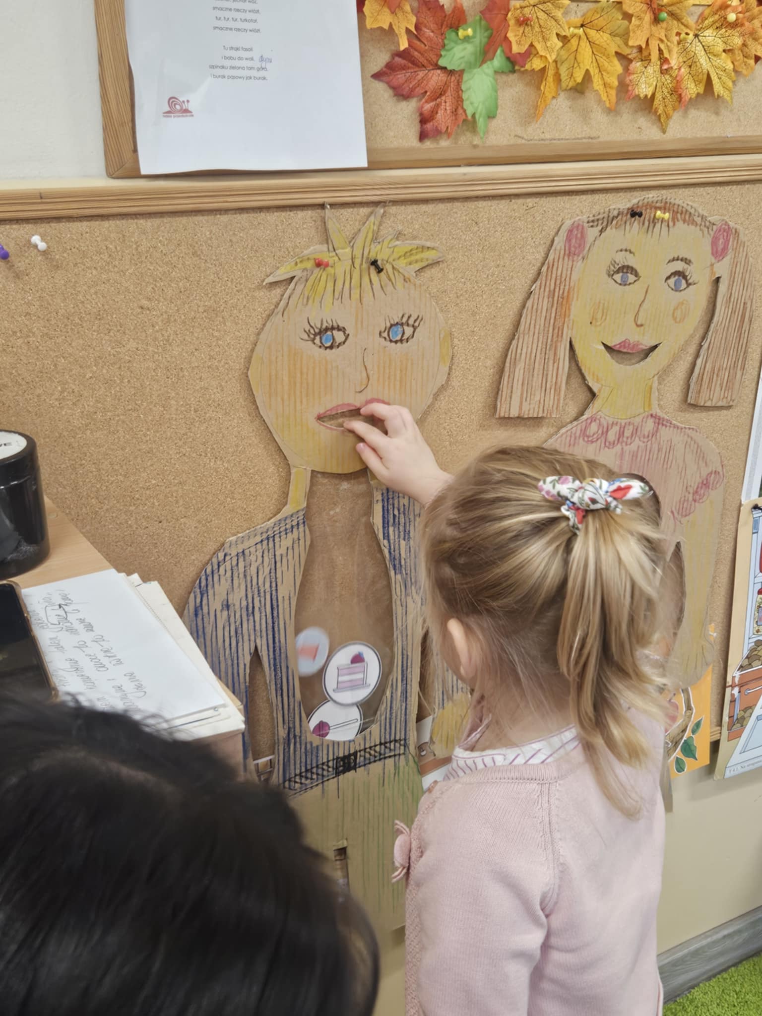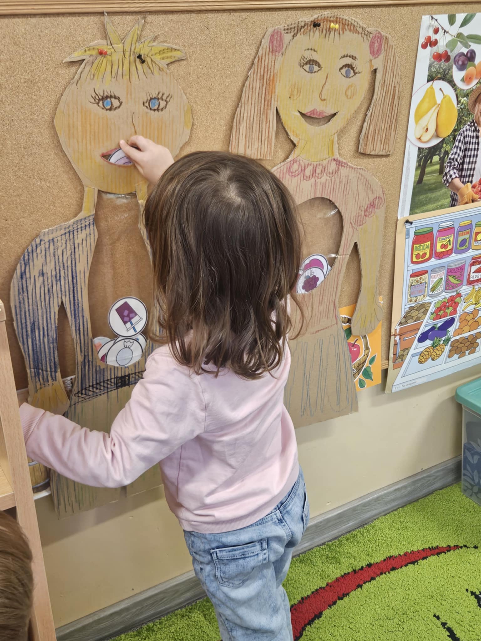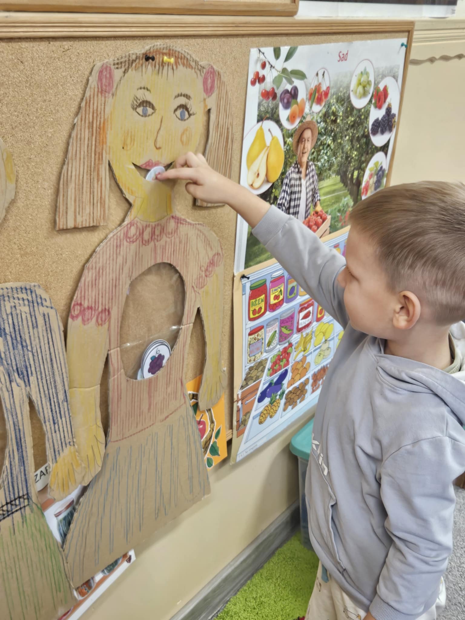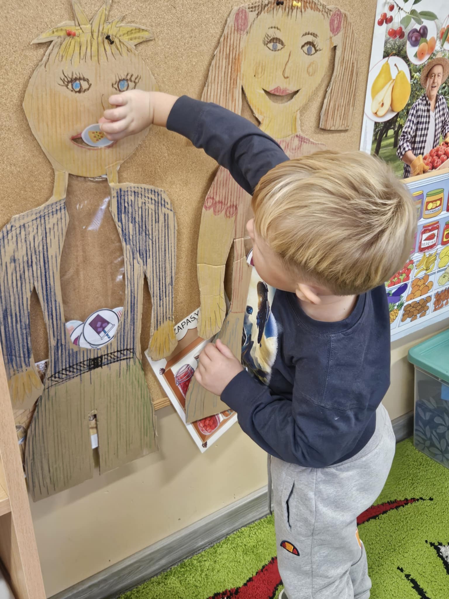 Dzieci bawiły się w zabawę dydaktyczną „Karmimy sylwety” – miały za zadanie nakarmić postacie zdrowym lub niezdrowym jedzeniem. Króliczki z dużym zaangażowaniem wybierały odpowiednie produkty i z dumą karmiły sylwety warzywami, owocami i mlekiem, a unikały słodyczy i chipsów.