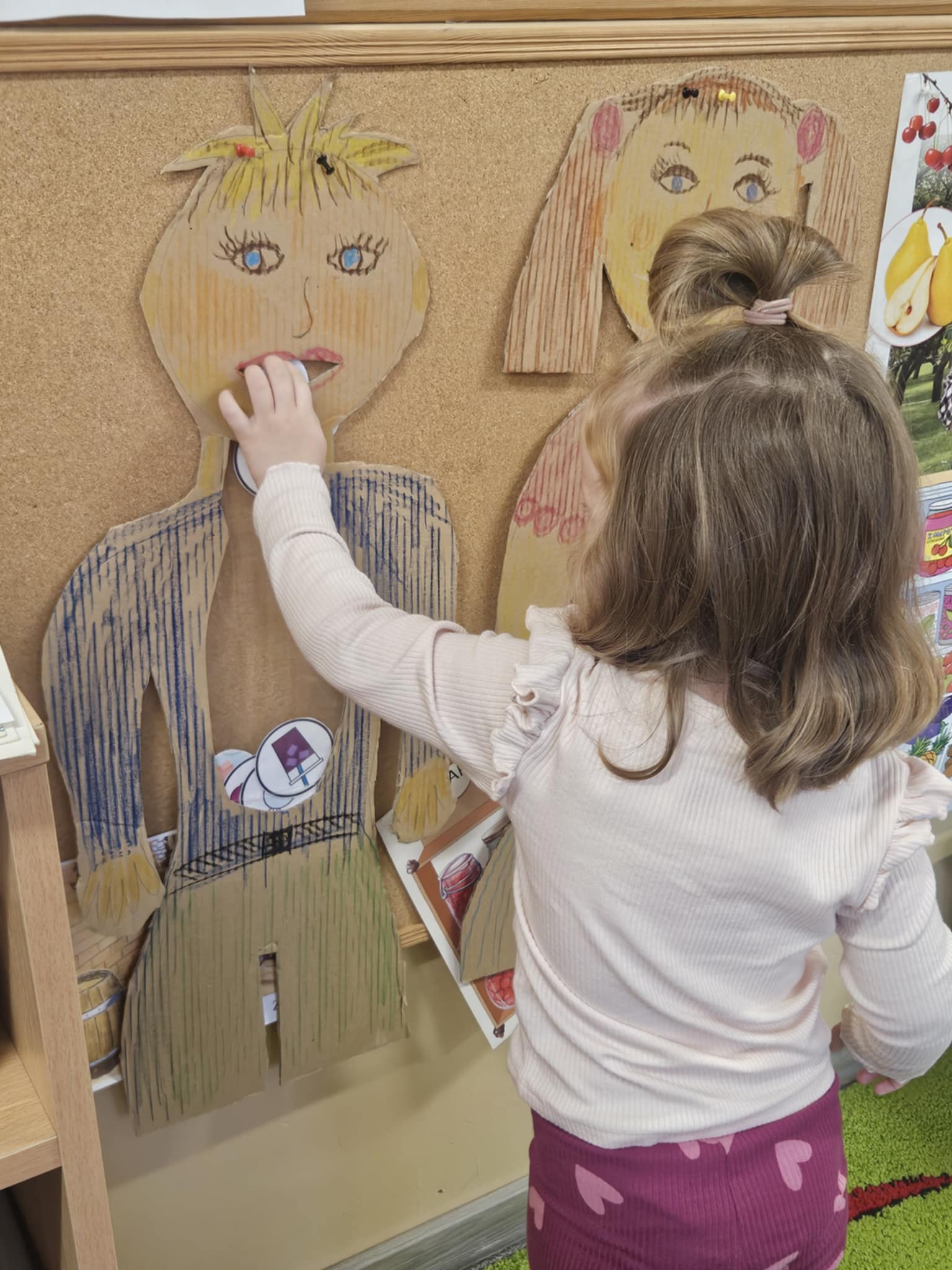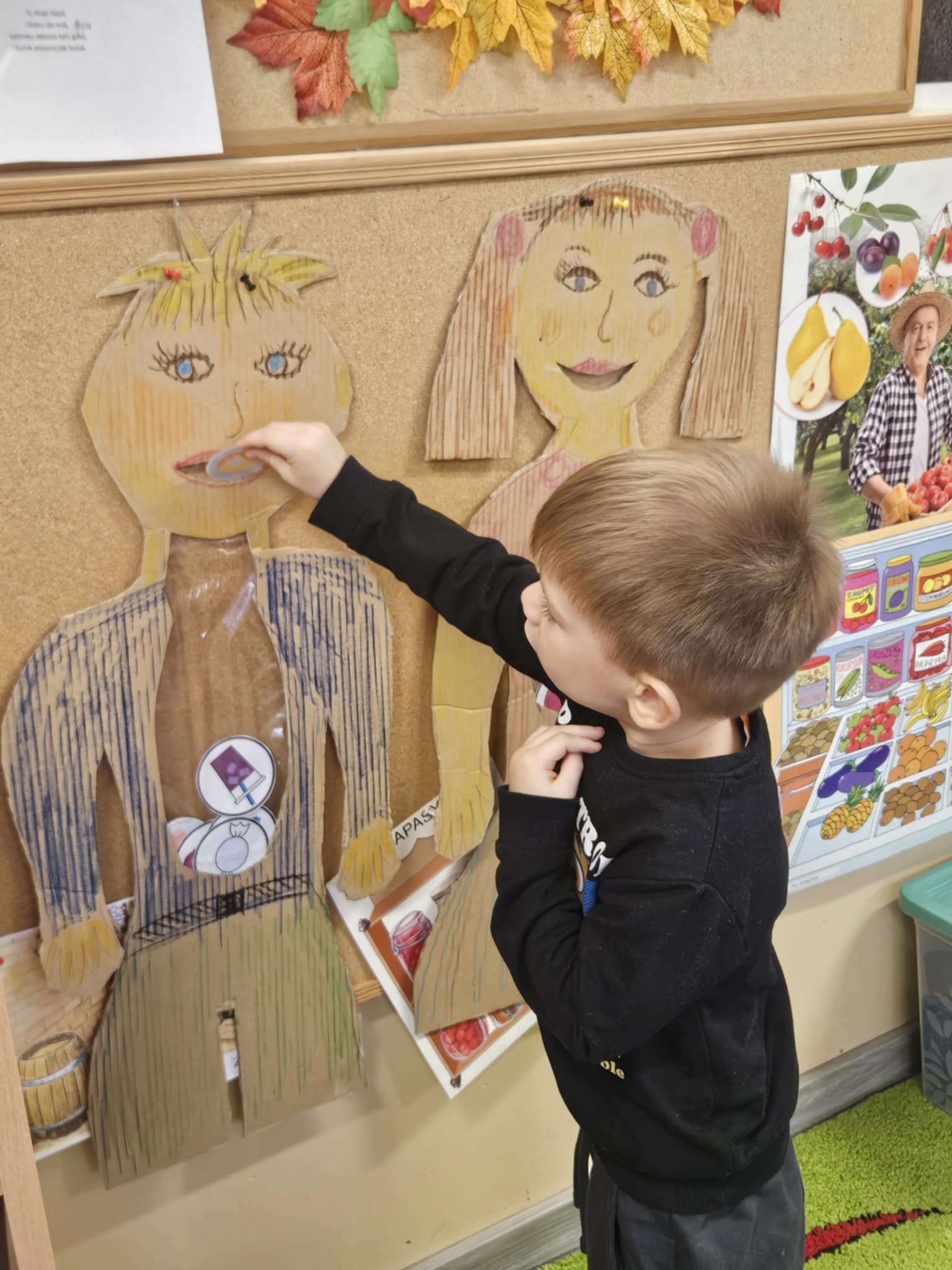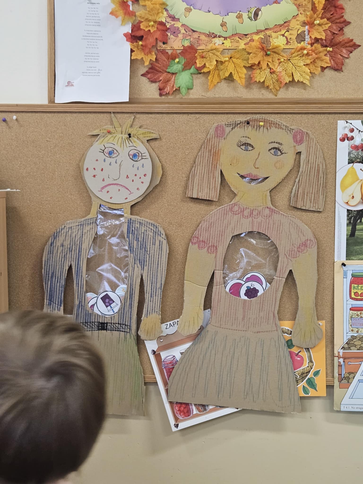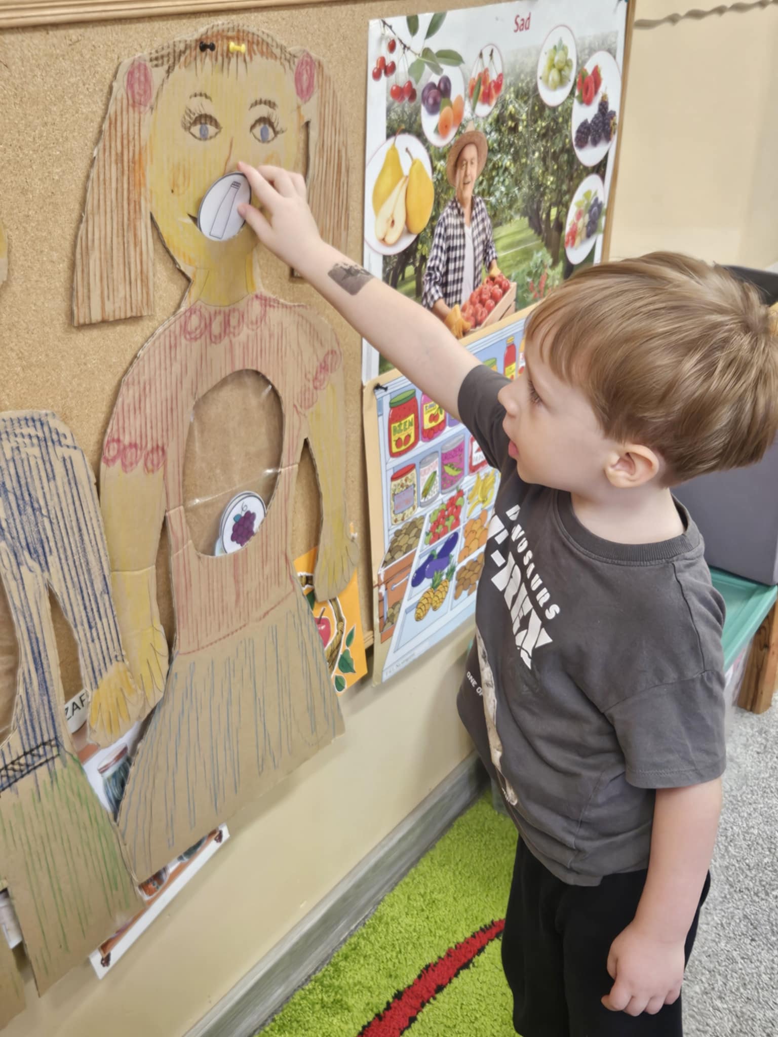 Dzieci bawiły się w zabawę dydaktyczną „Karmimy sylwety” – miały za zadanie nakarmić postacie zdrowym lub niezdrowym jedzeniem. Króliczki z dużym zaangażowaniem wybierały odpowiednie produkty i z dumą karmiły sylwety warzywami, owocami i mlekiem, a unikały słodyczy i chipsów.
