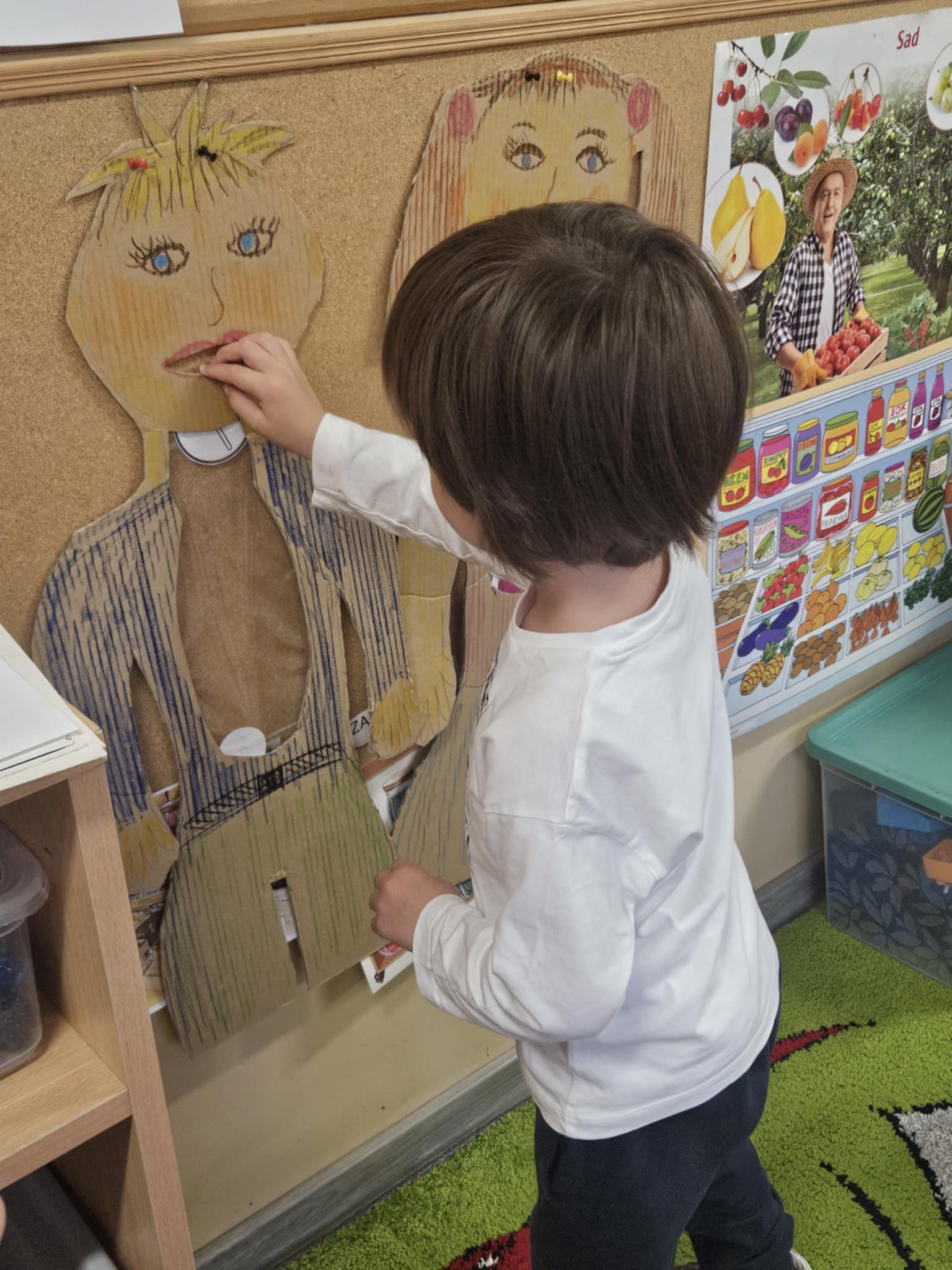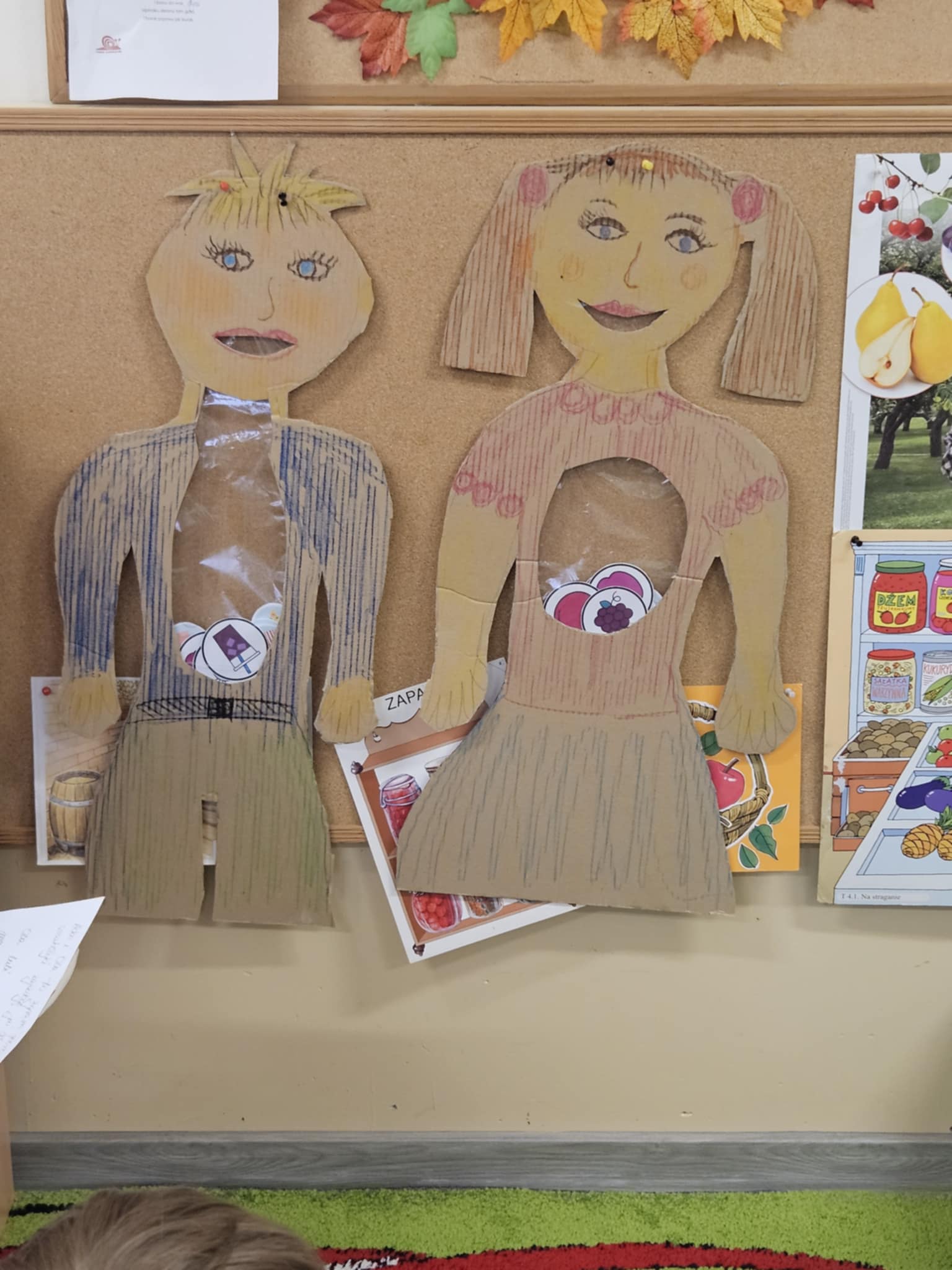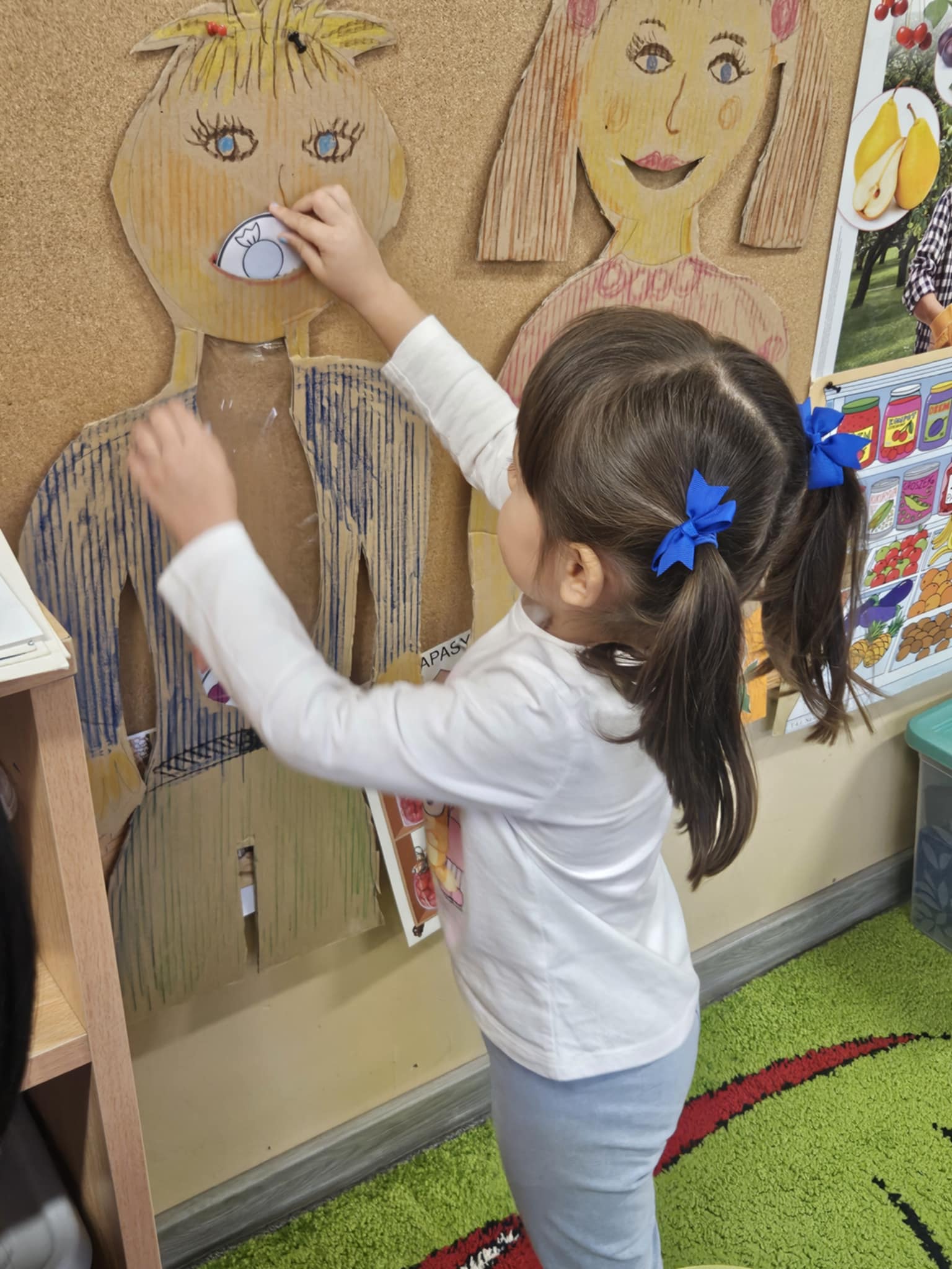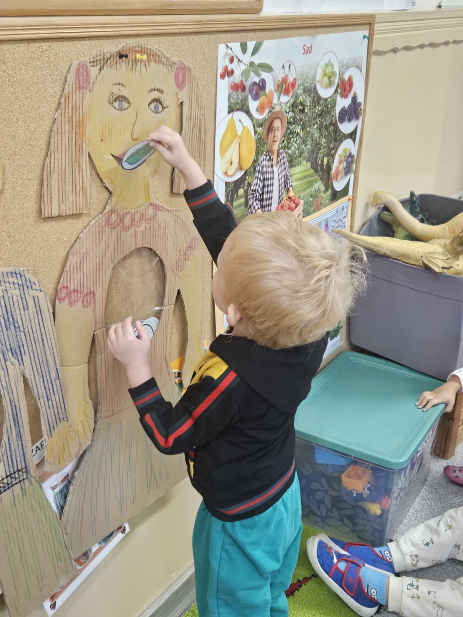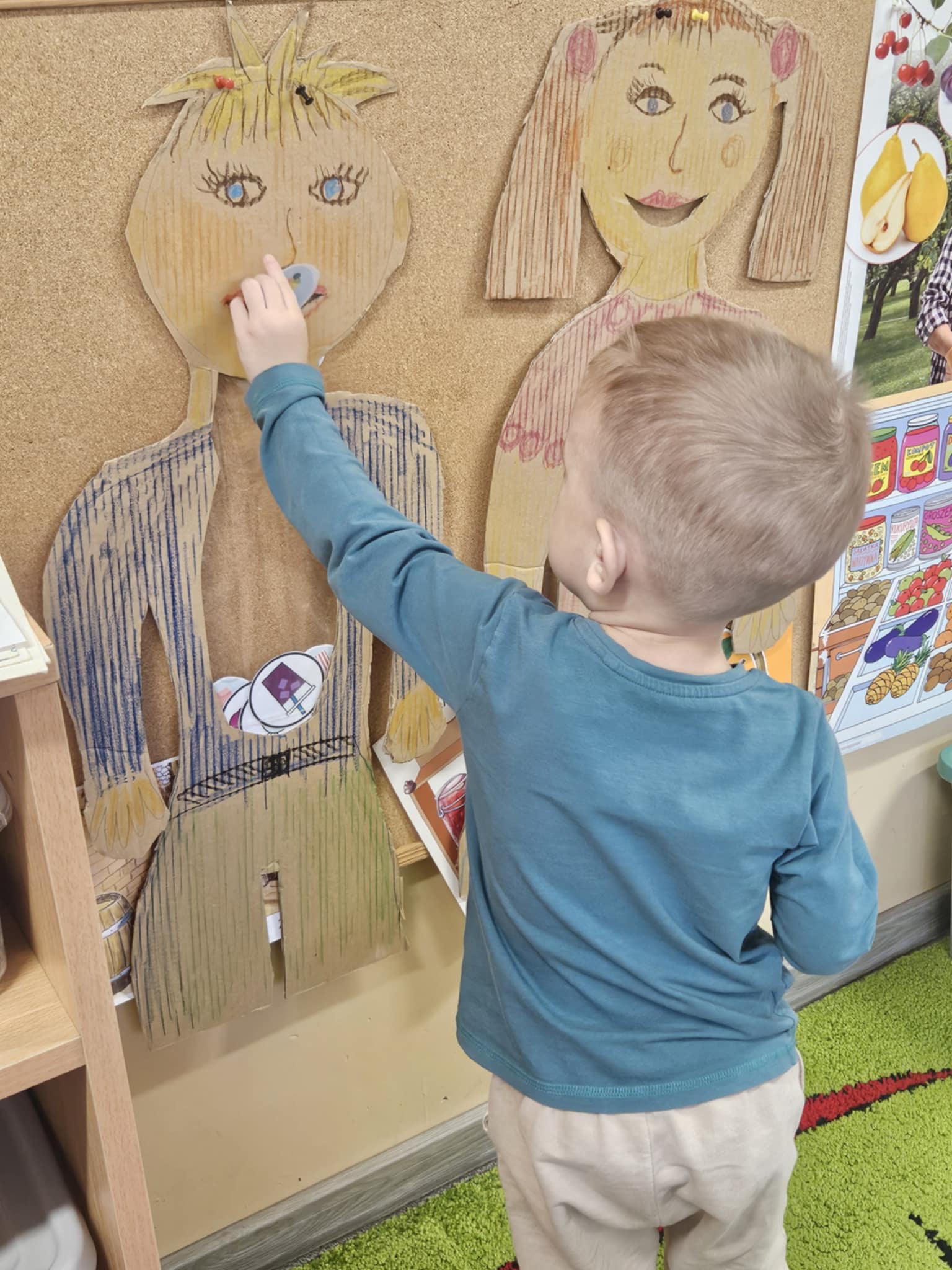 Dzieci bawiły się w zabawę dydaktyczną „Karmimy sylwety” – miały za zadanie nakarmić postacie zdrowym lub niezdrowym jedzeniem. Króliczki z dużym zaangażowaniem wybierały odpowiednie produkty i z dumą karmiły sylwety warzywami, owocami i mlekiem, a unikały słodyczy i chipsów.