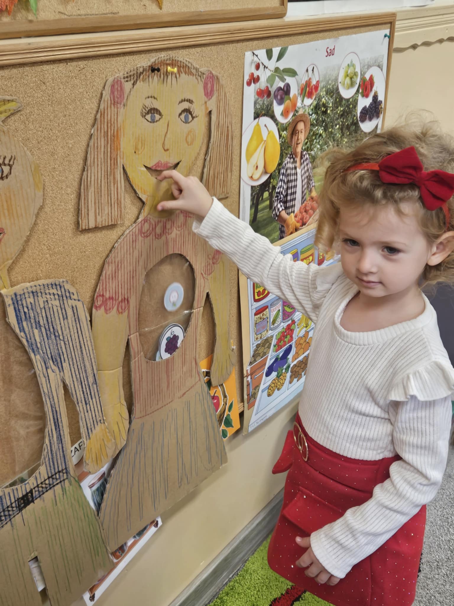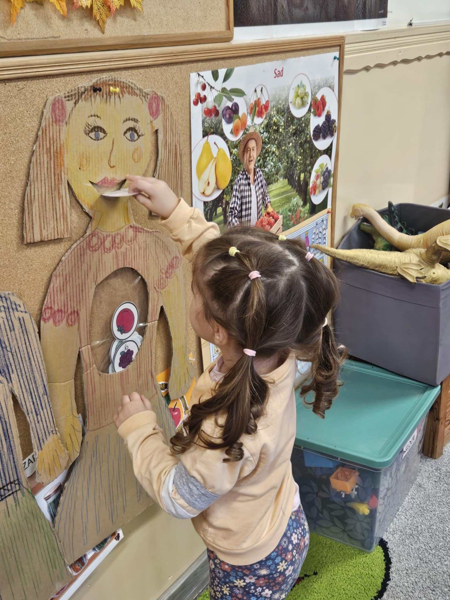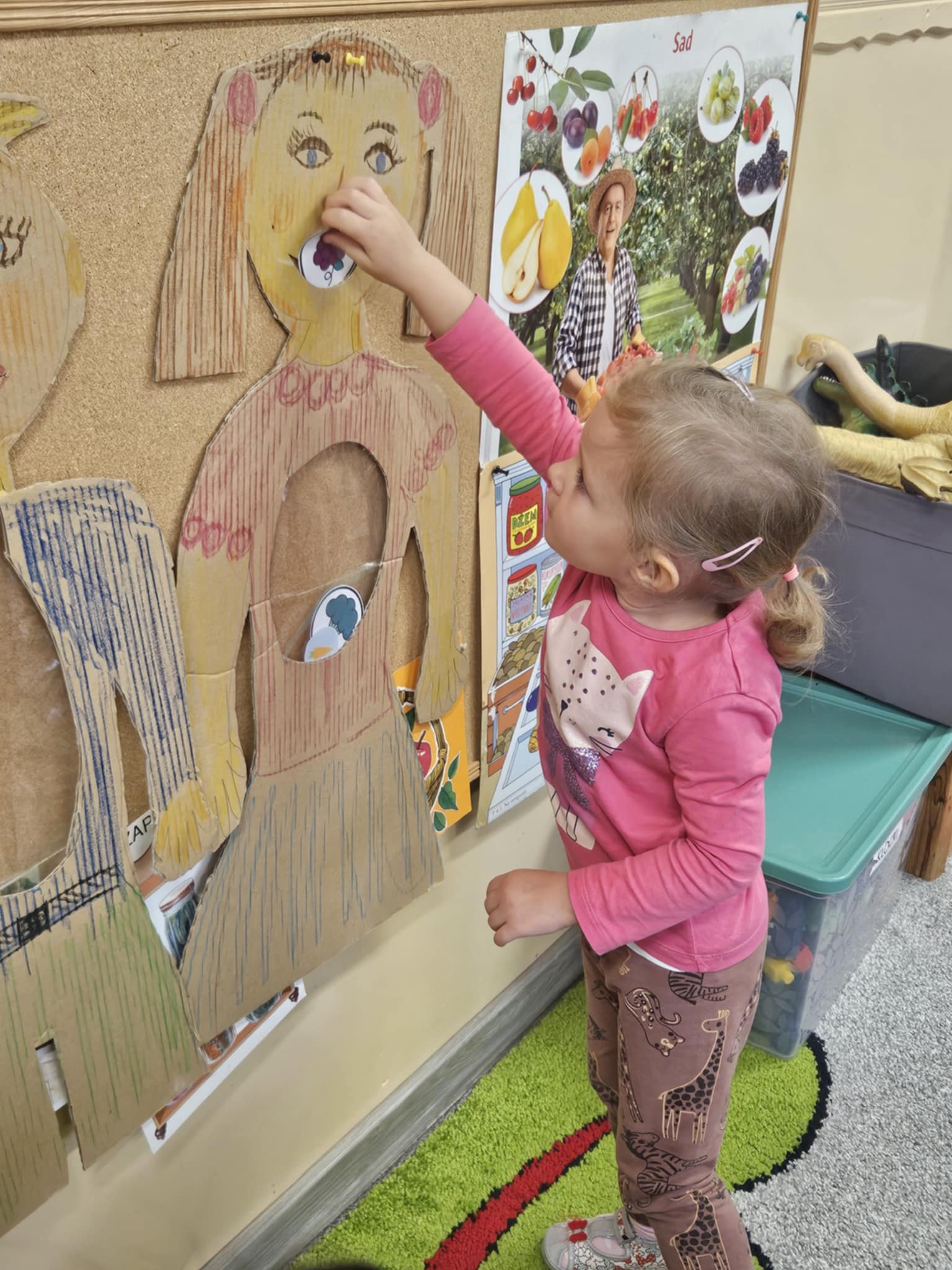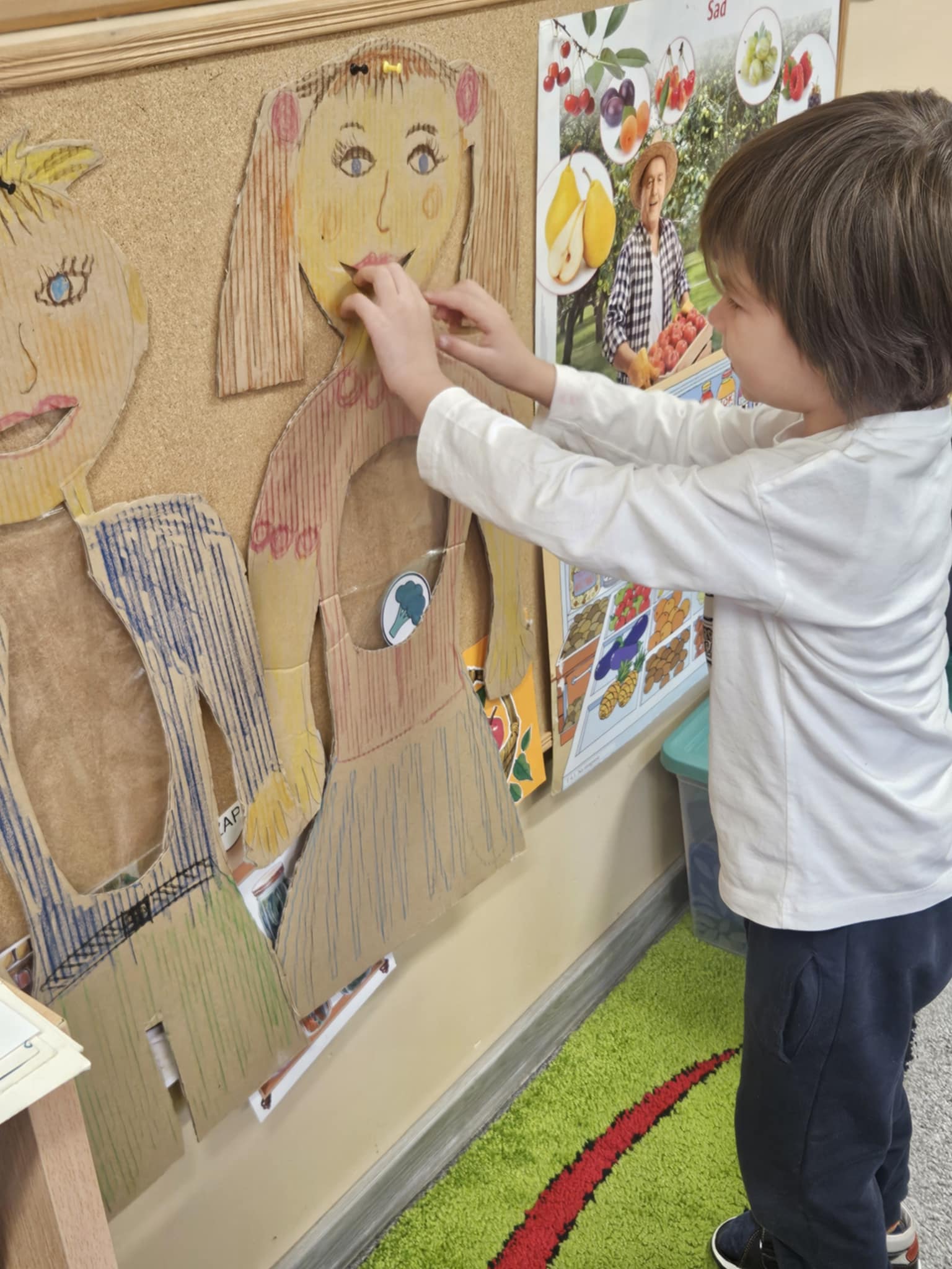 Dzieci bawiły się w zabawę dydaktyczną „Karmimy sylwety” – miały za zadanie nakarmić postacie zdrowym lub niezdrowym jedzeniem. Króliczki z dużym zaangażowaniem wybierały odpowiednie produkty i z dumą karmiły sylwety warzywami, owocami i mlekiem, a unikały słodyczy i chipsów.